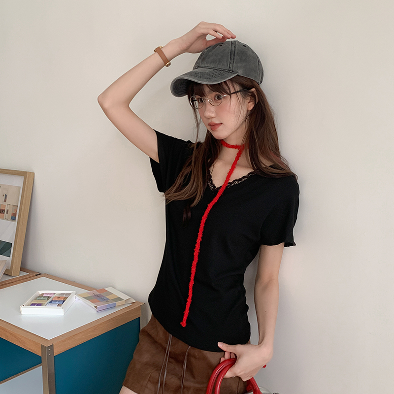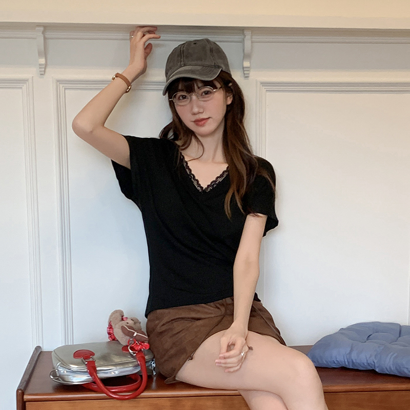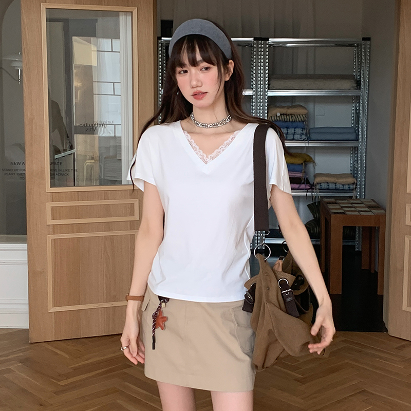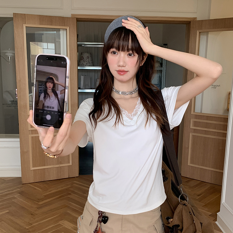 실제 샷 및 실제 가격#레이스 스 플라이 싱 v- 넥 짧은 소매 티셔츠 여성을위한 2025 새로운 디자인 틈새 다용도 느슨한 탑