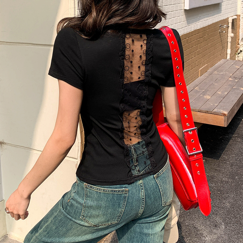 여성용 여성을위한 실제 가격의 레이스 스 플라이 싱 여성을위한 둥근 목 티셔츠 짧은 소매 2025 새로운 디자인 감지 백 중공 탑