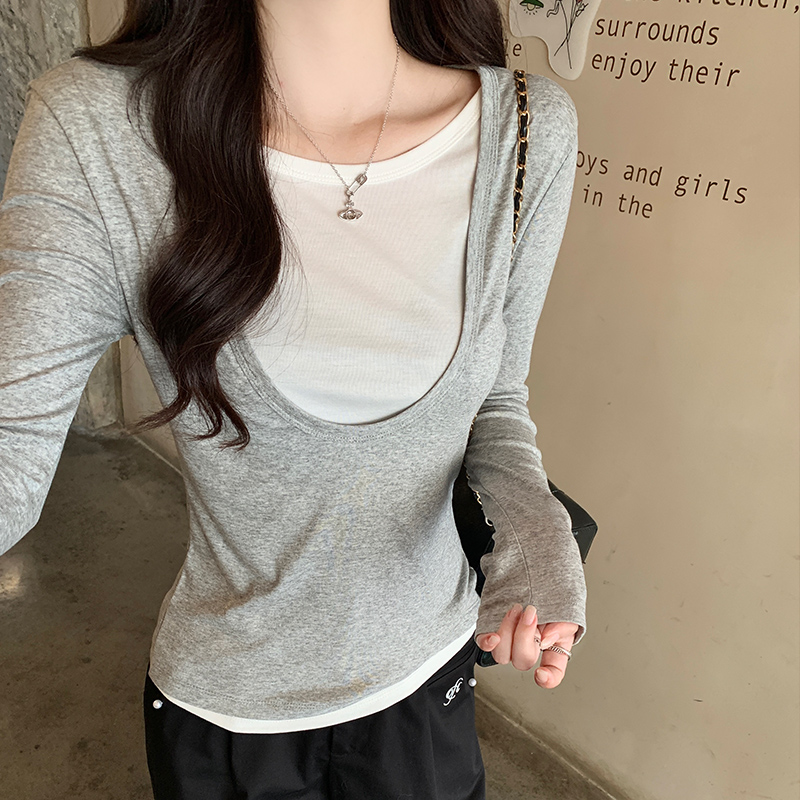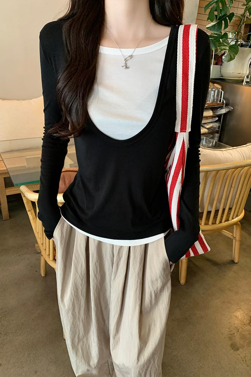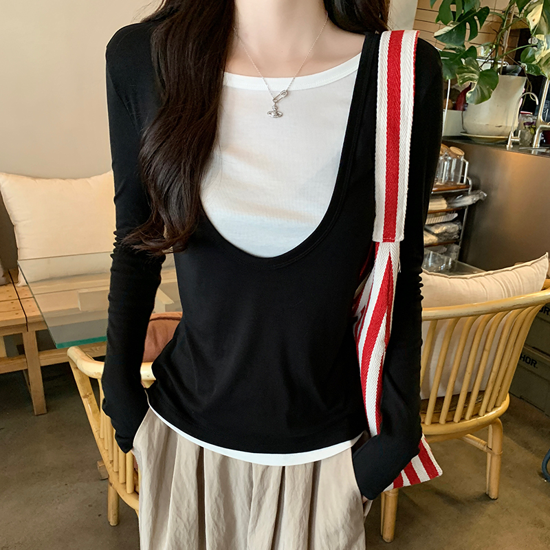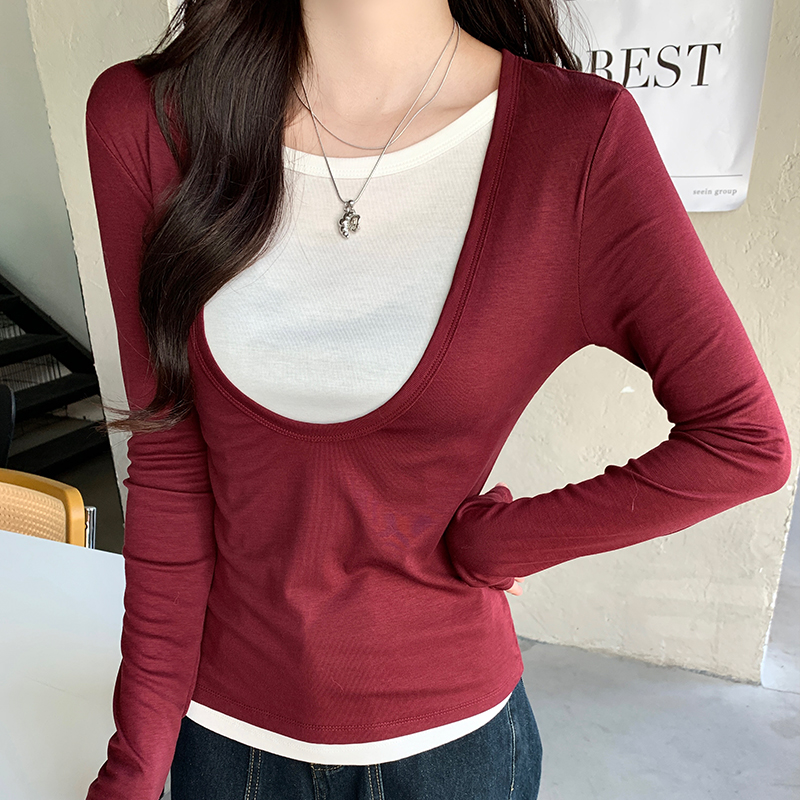 실제 샷과 실제 가격#스플릿 v- 넥 가짜 2 피스 긴팔 티셔츠 여자의 새로운 스타일 디자인 틈새 틈새 시장 내부베이스 셔츠