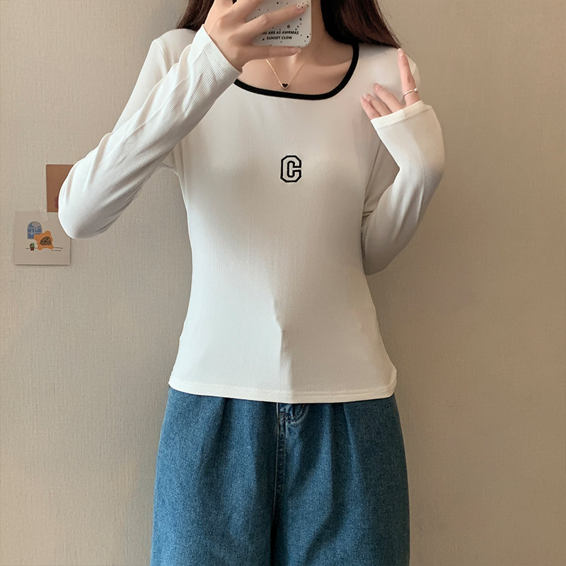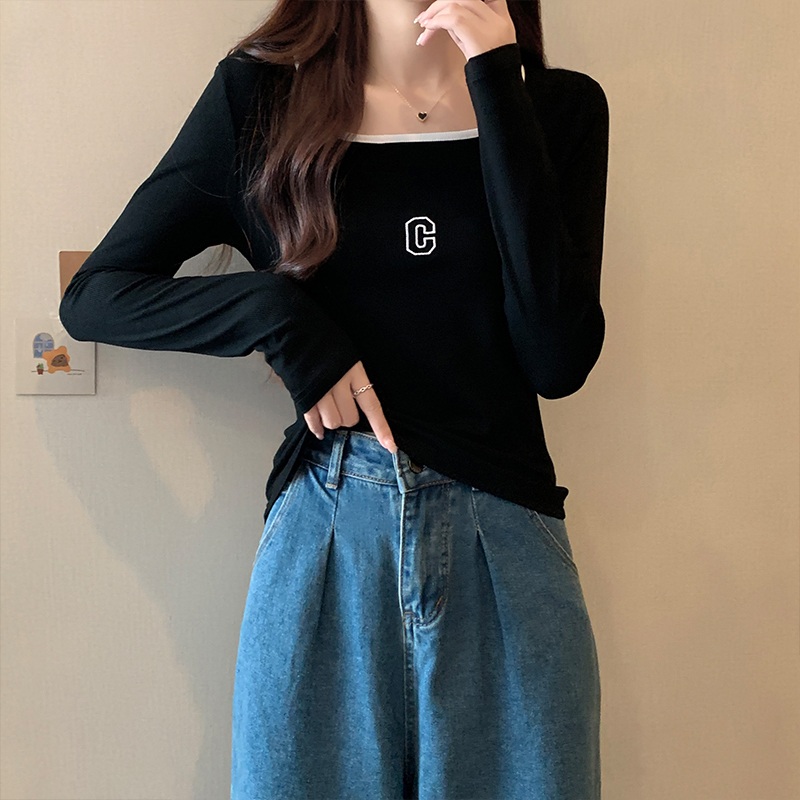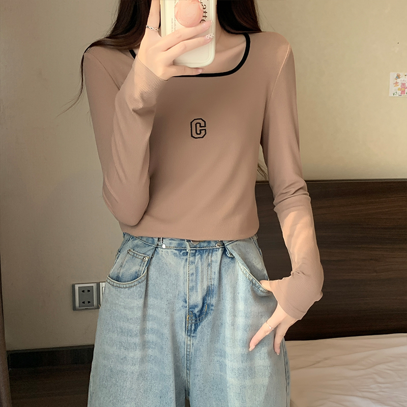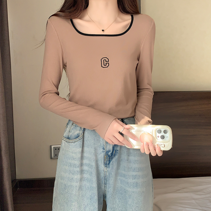 실제 가격# 스레드 스퀘어 칼라 여성 패션 및 세련된 2025 유럽 상품 스프링 New Top Slim을위한 긴팔 티셔츠
