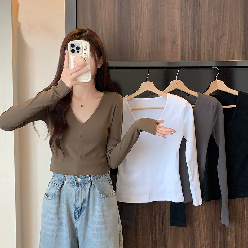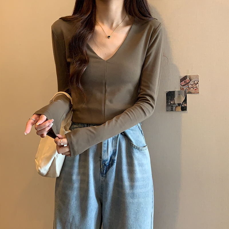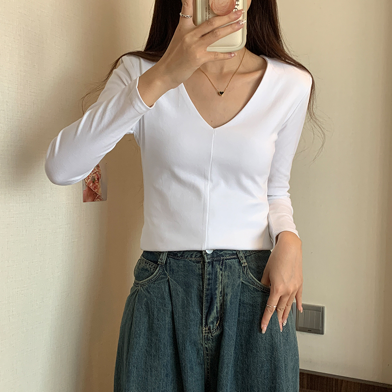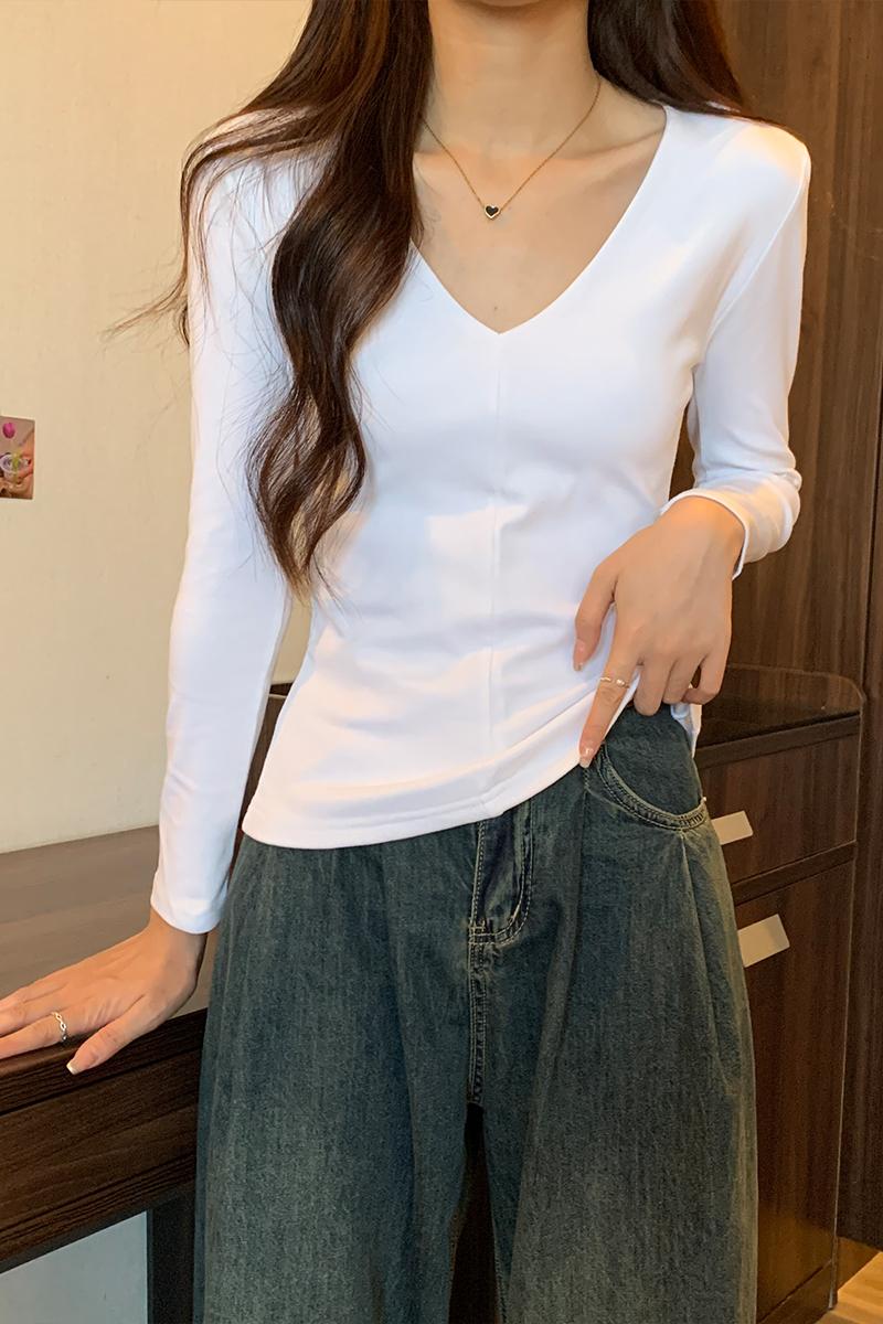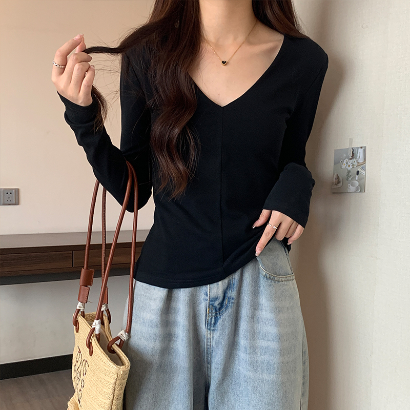 실제 샷 및 실제 가격 # 스레드 쇄골 노출 여성을위한 V- 넥 티셔츠 긴 소매 2025 이른 봄 새로운 섹시한 내부 탑