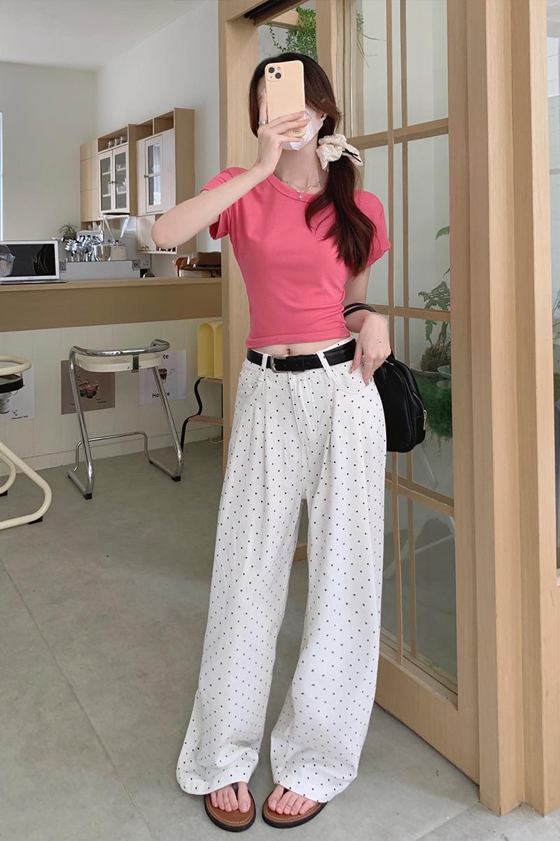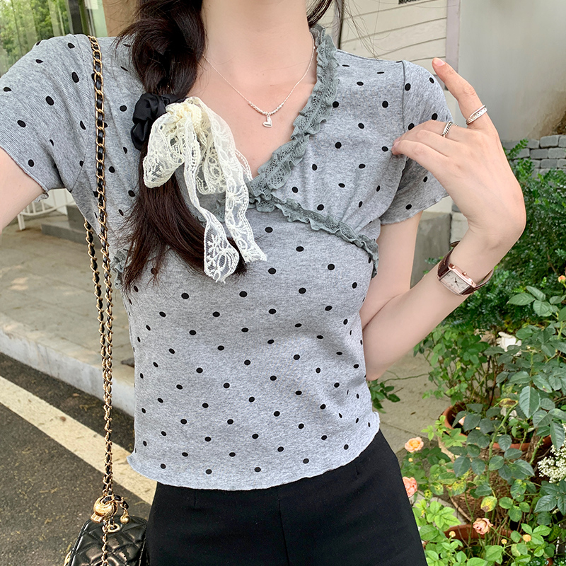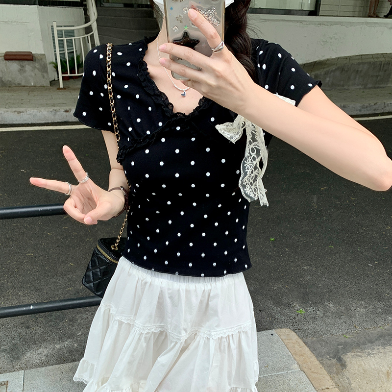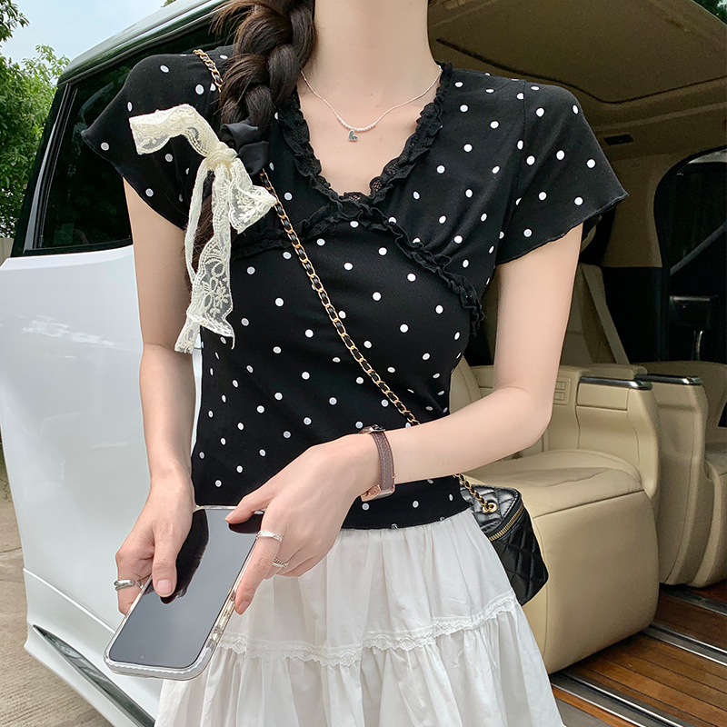 실제 가격#흰색 레이스 검은 귀 폴카 도트 v- 넥 짧은 슬릿 티셔츠 여름 디자인 짧은 셔츠