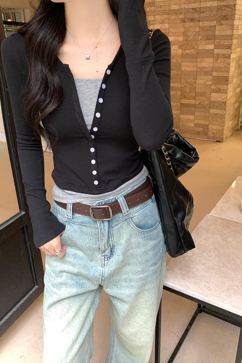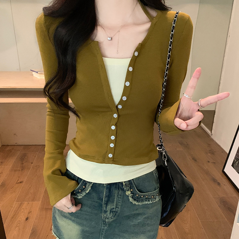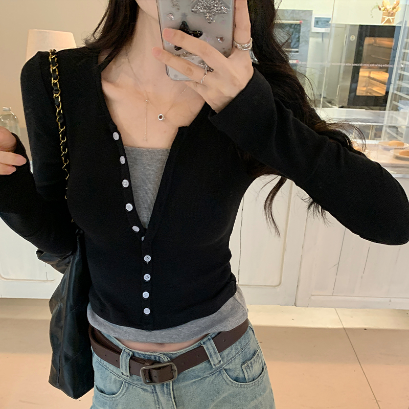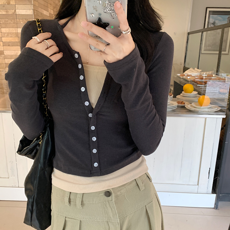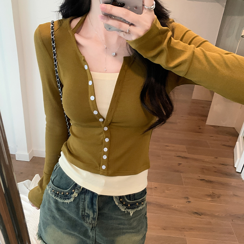 실제 샷 및 실제 가격 #파이크 ​​여성용 봄 2025 New Neck Halter Design Niche Top을위한 2 피스 전면 어깨 긴팔 티셔츠