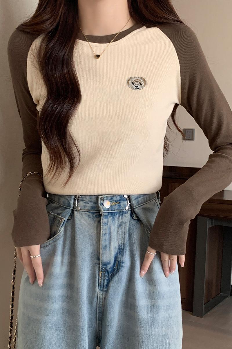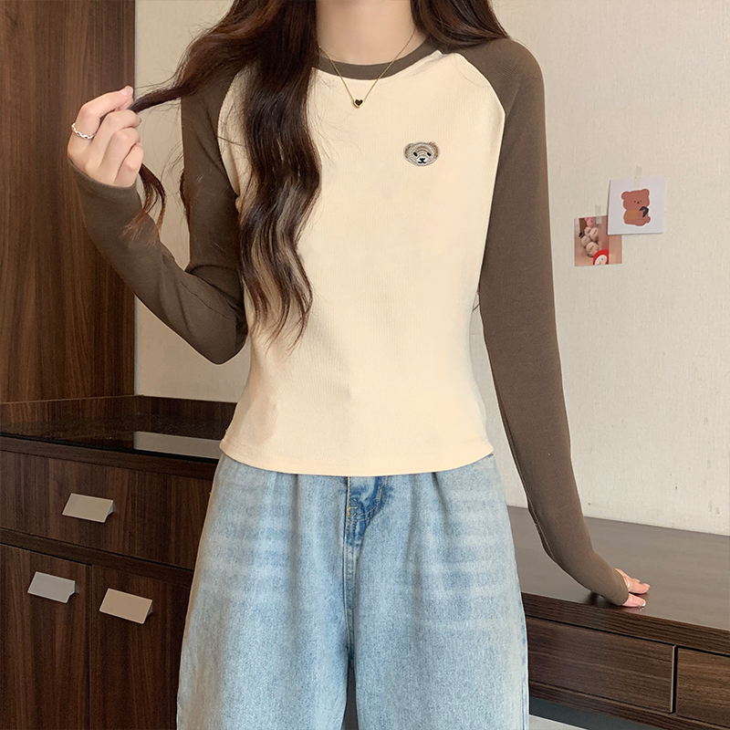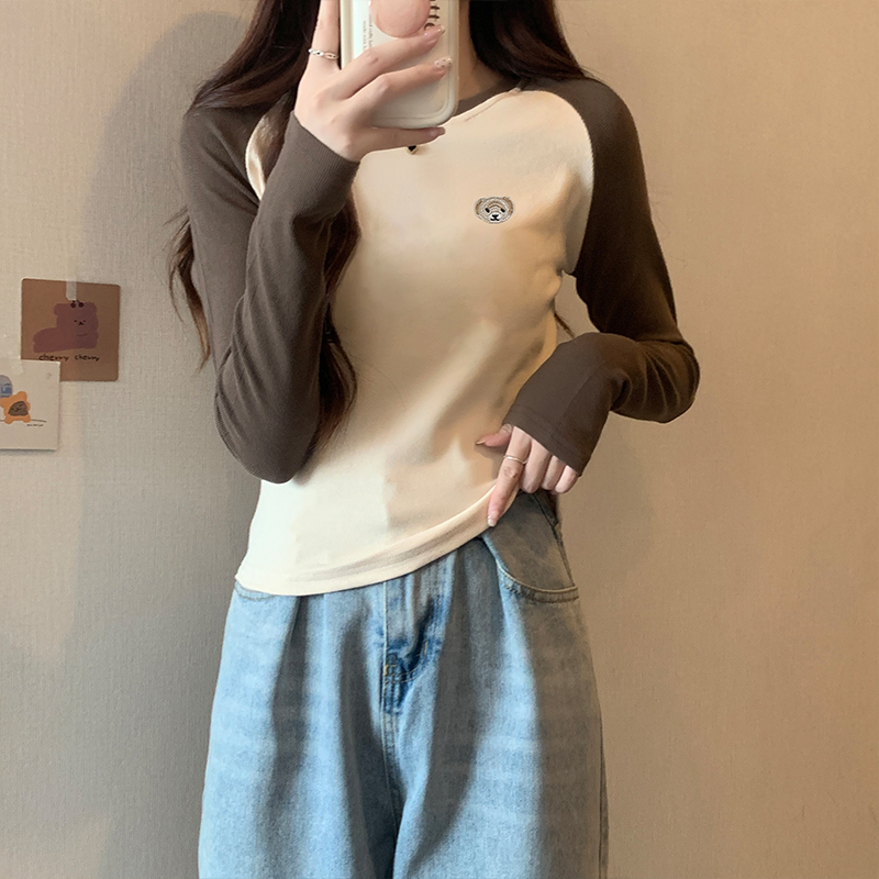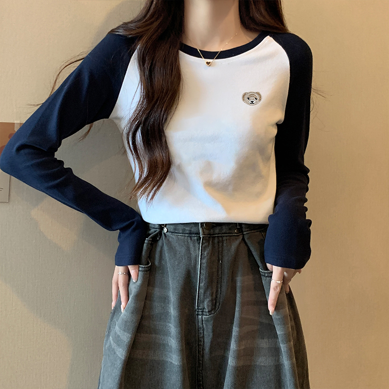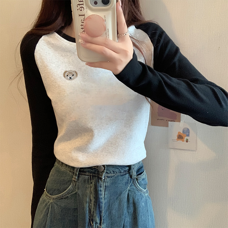 실제 샷과 실제 가격#미국 레트로 대조 컬러 라즈 숄더 어깨 긴팔 티셔츠 2025 이른 봄 새 자수 탑