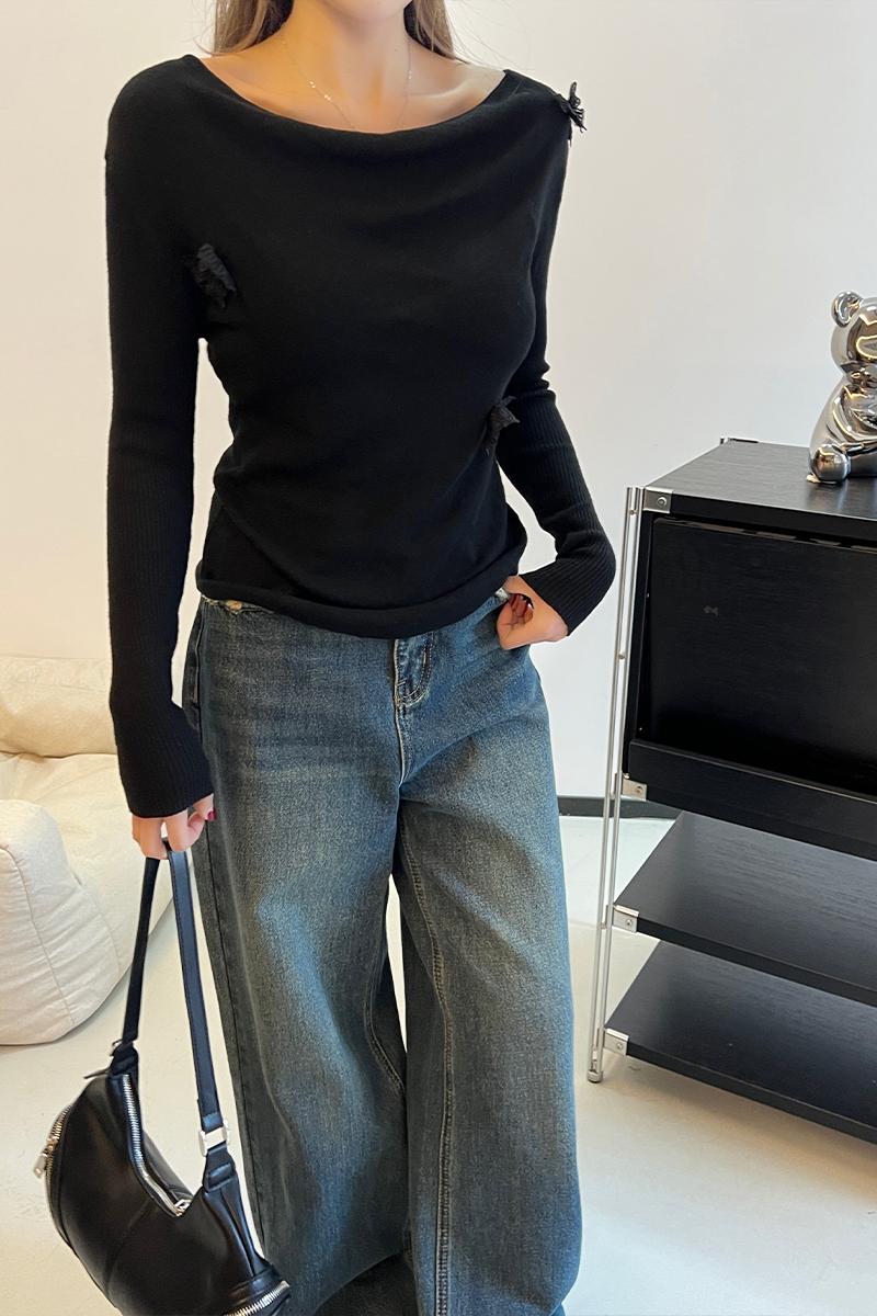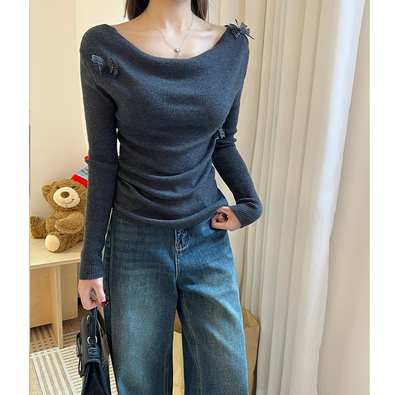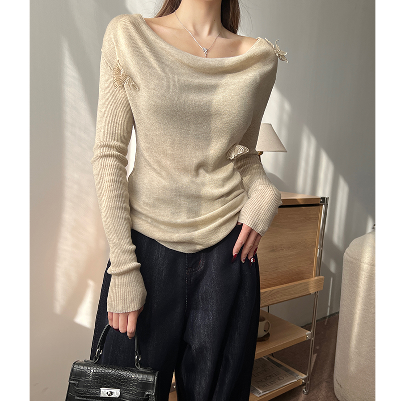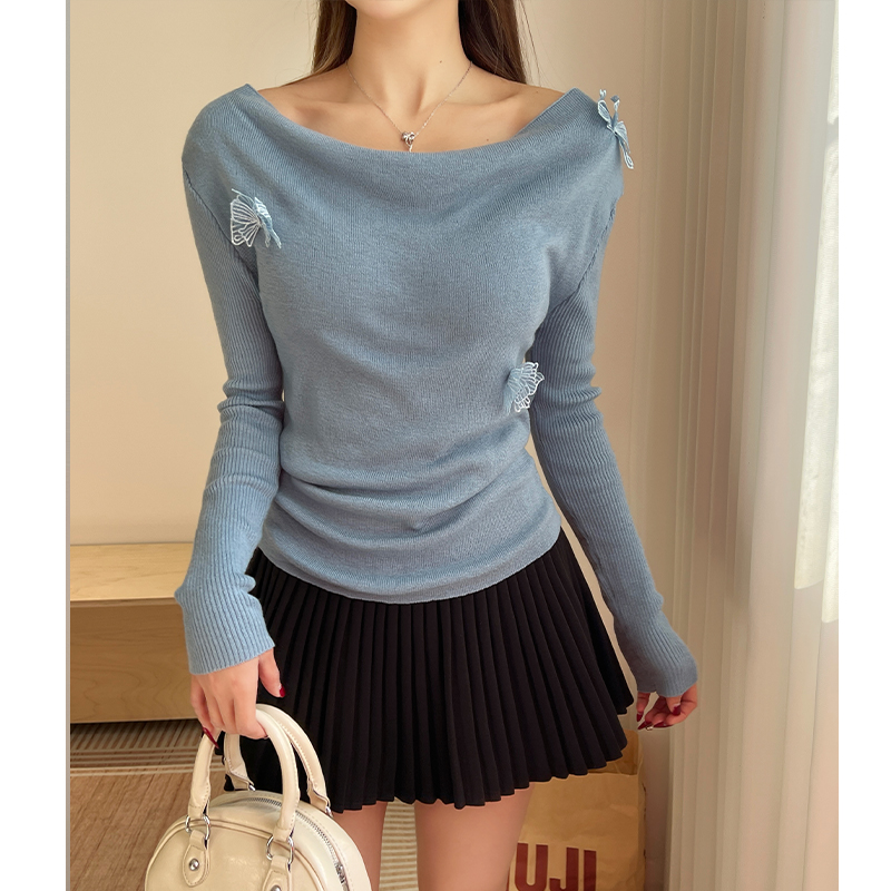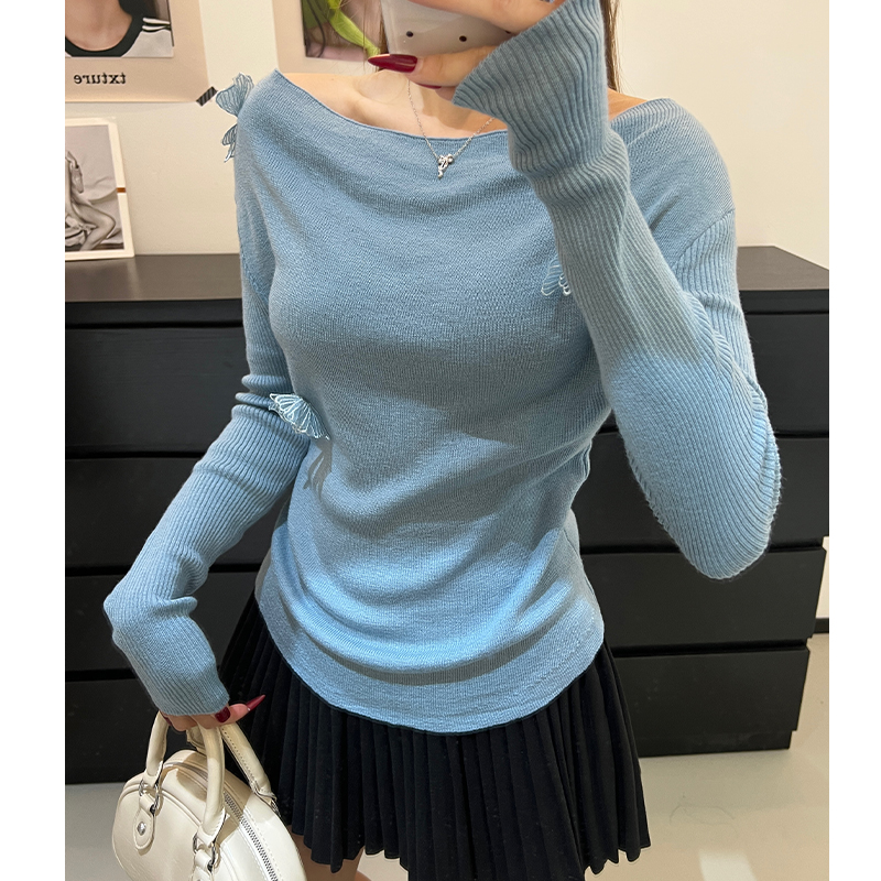 실제 가격#3D 나비 나비 쇄골 노출 된 칼라-콜라-봄에 여성을위한 긴 소매 스웨터