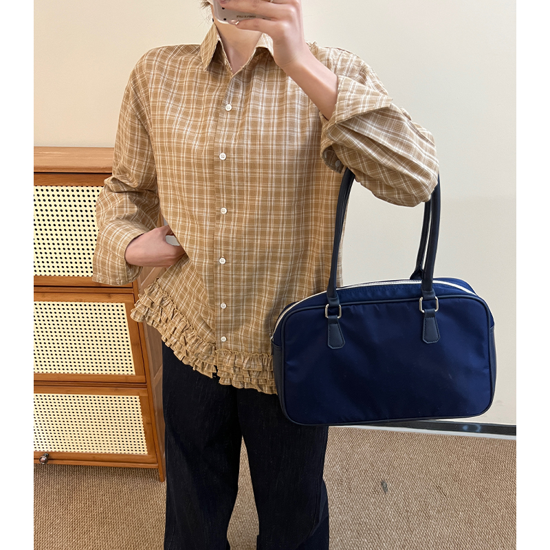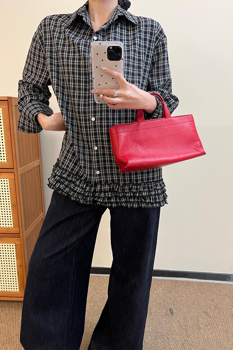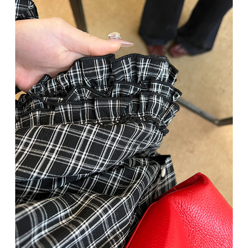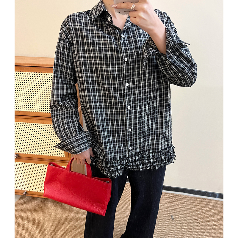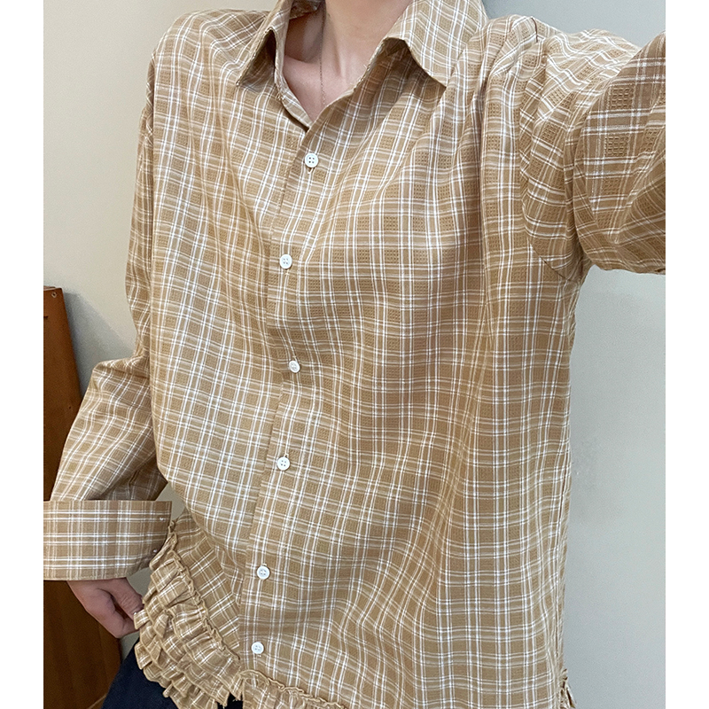 실제 가격#홍콩 스타일의 레트로 격자 무늬 레이스 레이스 셔츠 봄 고급 셔츠 캐주얼 한 느슨한 긴 소매 탑