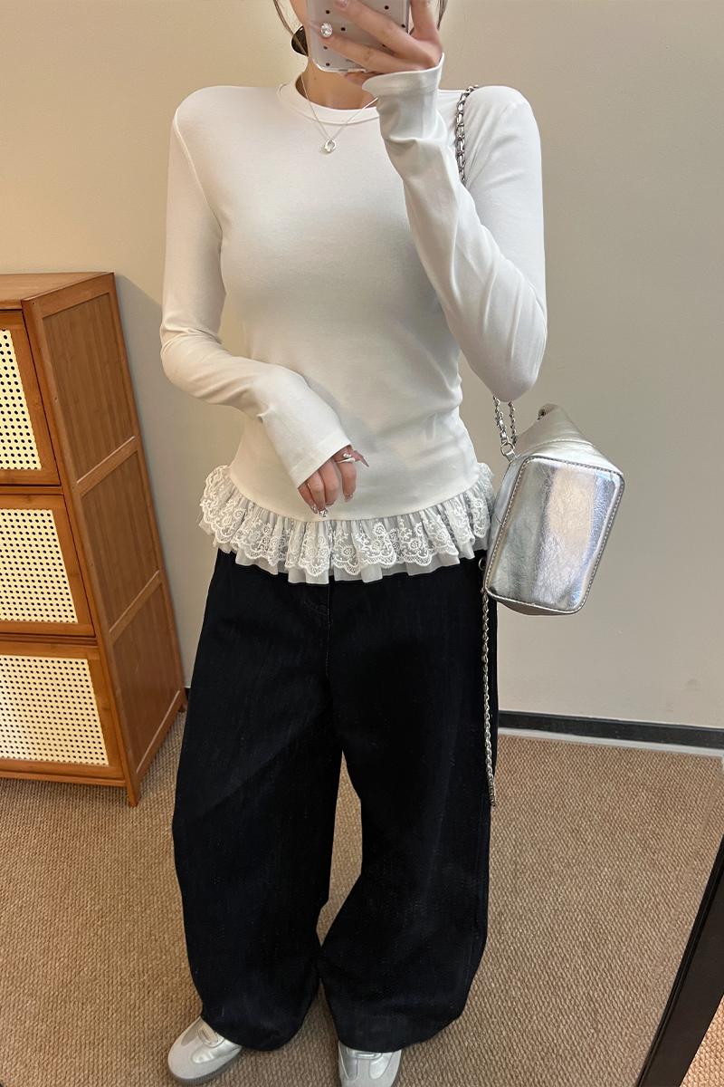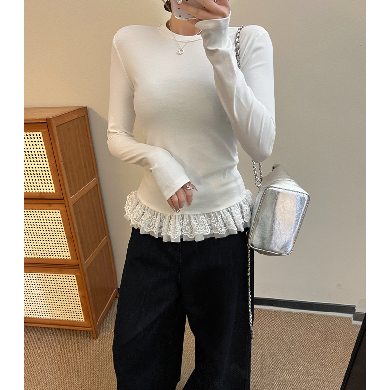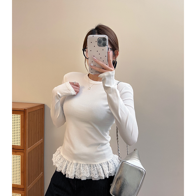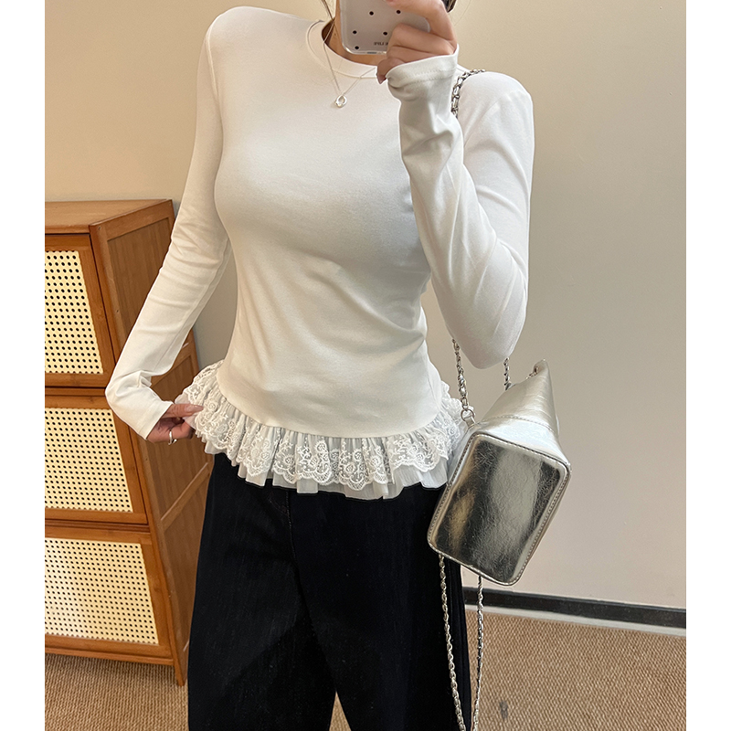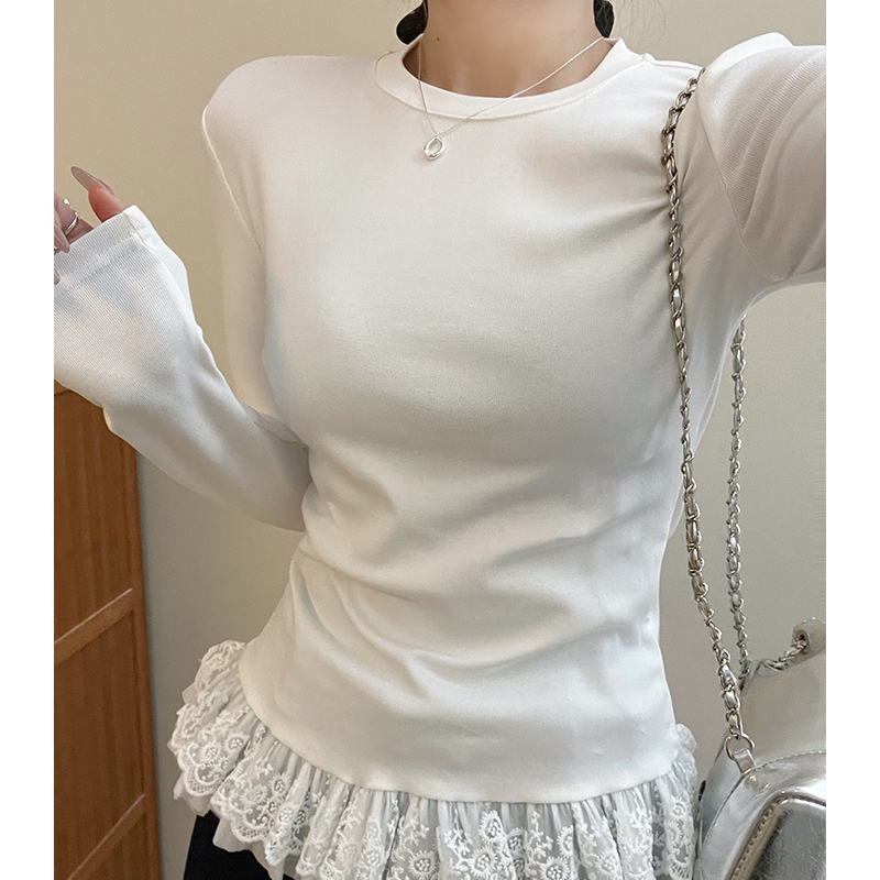 봄 중간 길이베이스 셔츠 레이어 인 내부 상단에서 여성을위한 흰색 발레 스타일 밑단 레이스 긴팔 티셔츠