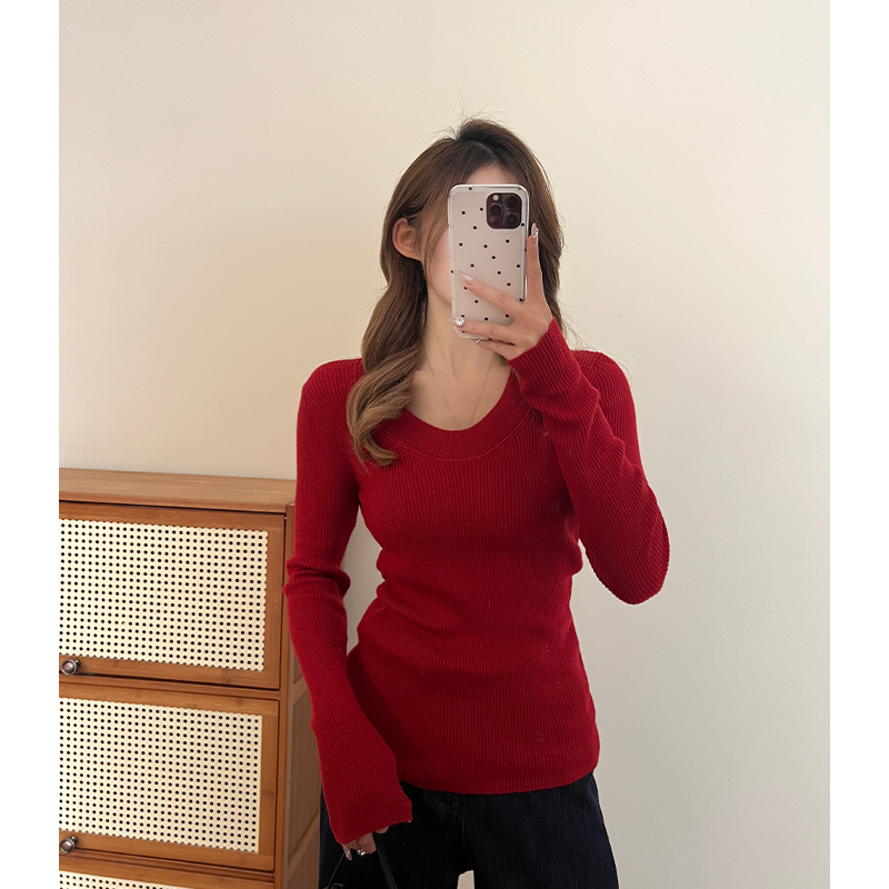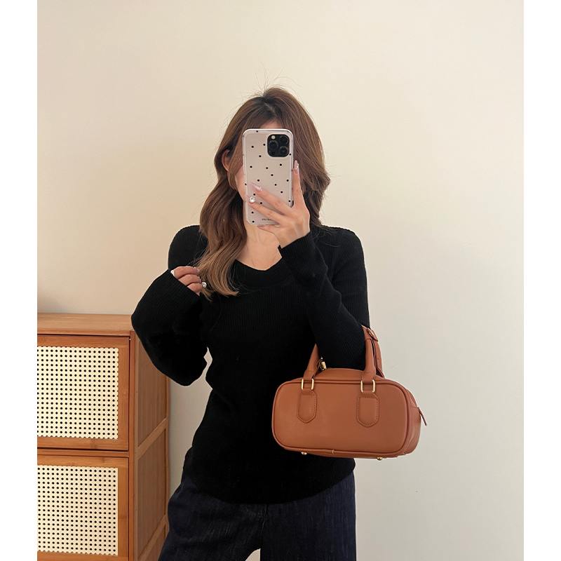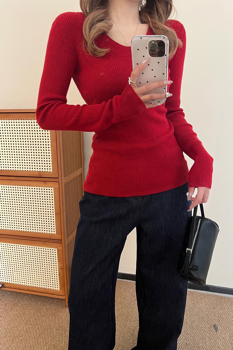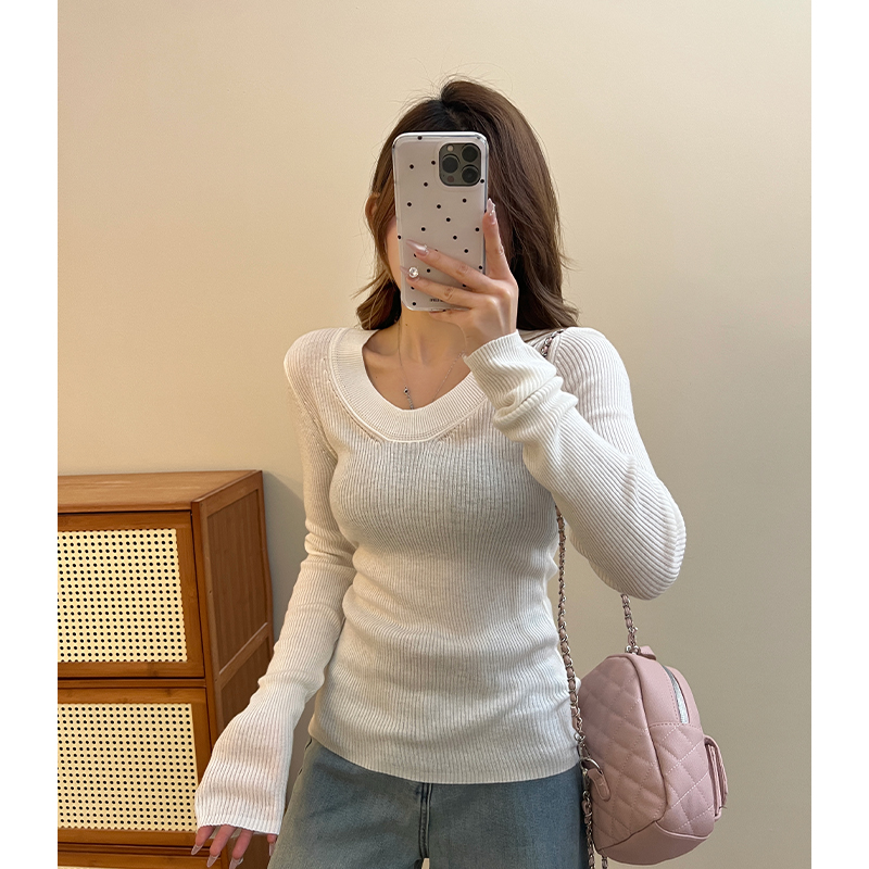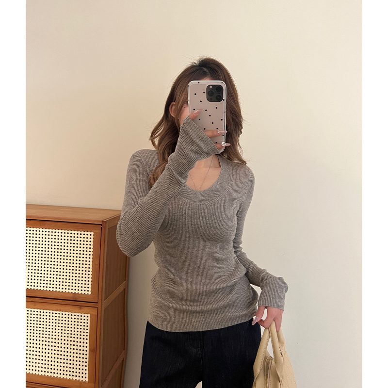 실제 가격 회색 U-Neck 앞쪽 어깨 롱 슬리브 스웨터 봄 여성을위한 여성을위한 여성을위한 새로운 슬림 한 몸매 얇은 스타일