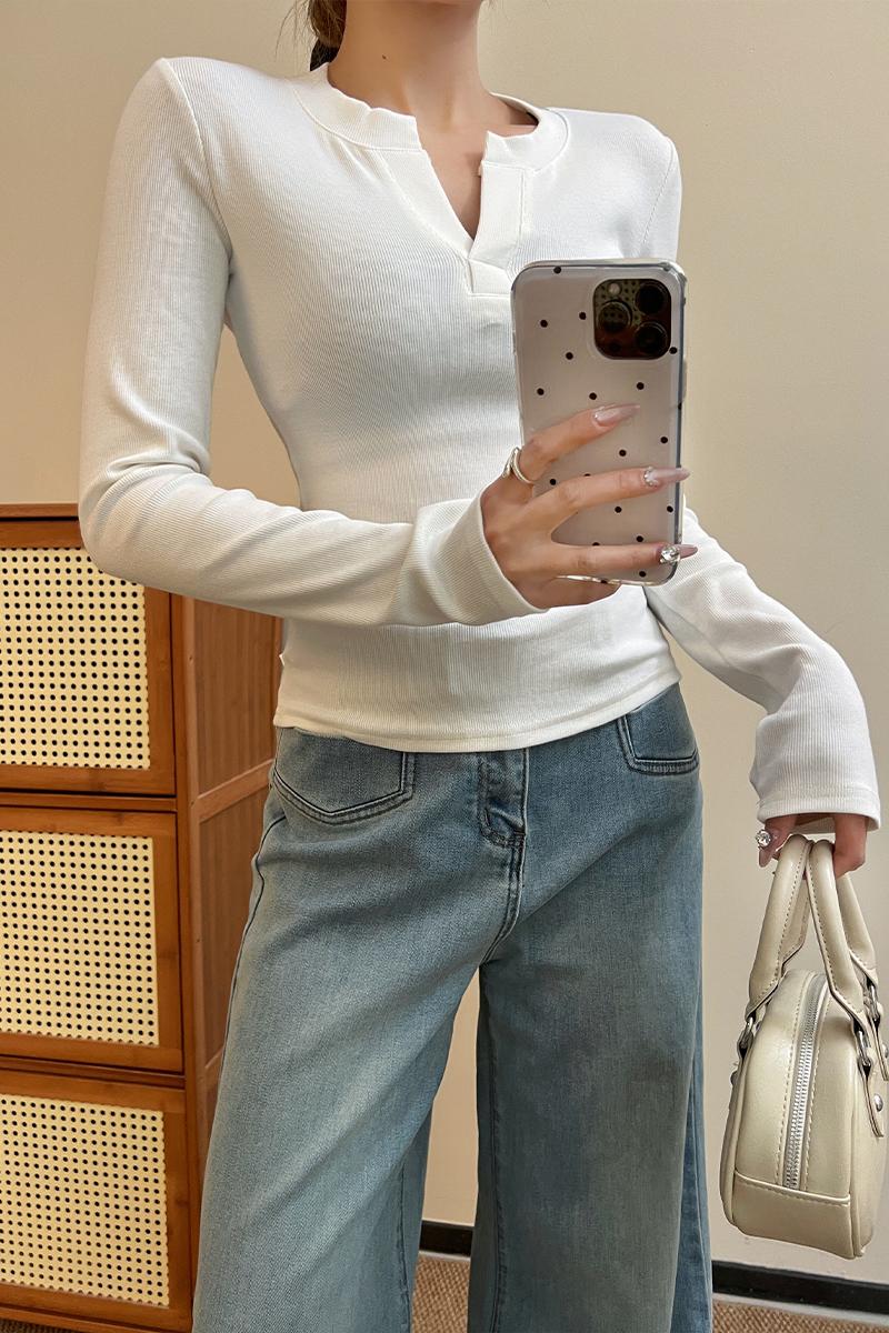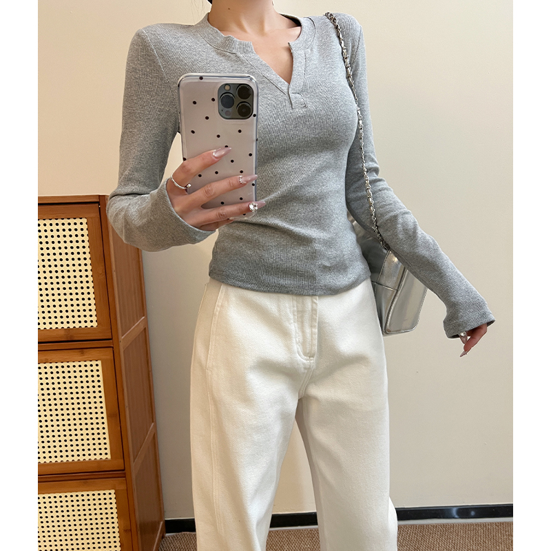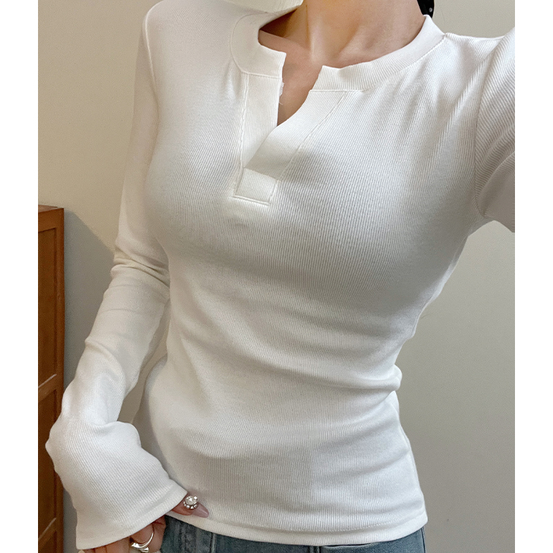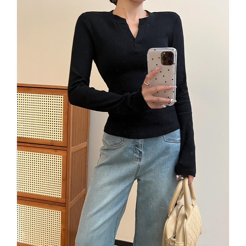 실제 가격#기본 V- 넥베이스 셔츠 스프링 슬림 핏 및 다재다능한 반쯤 열린 칼라 긴팔 탑