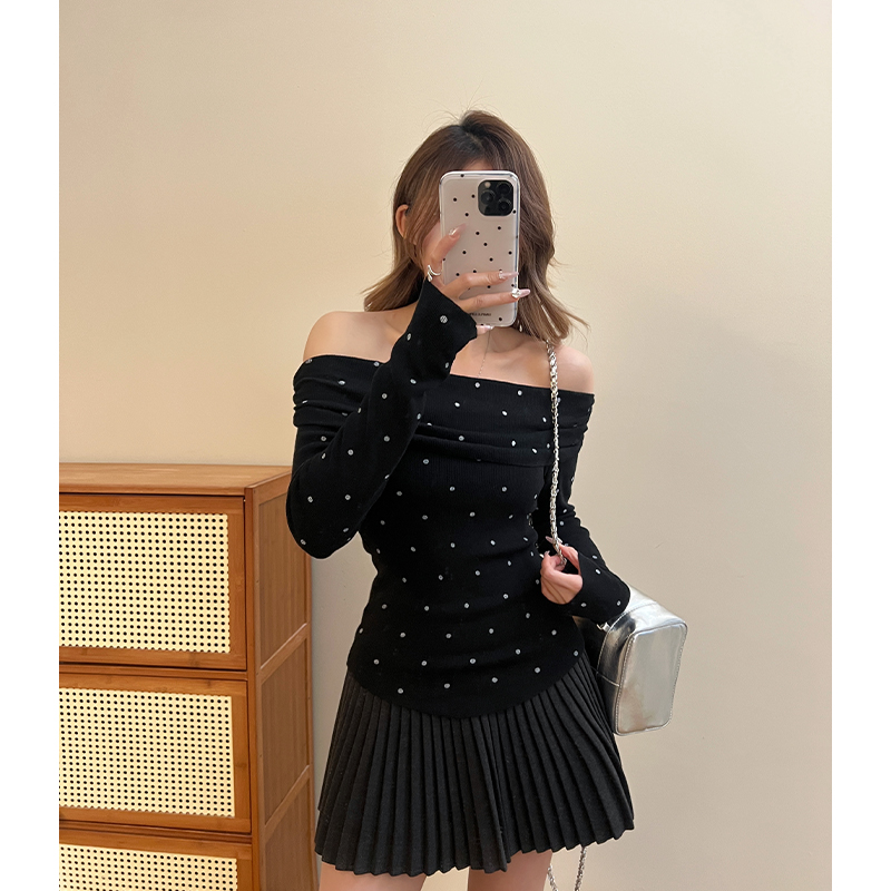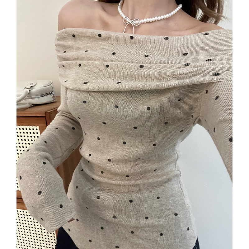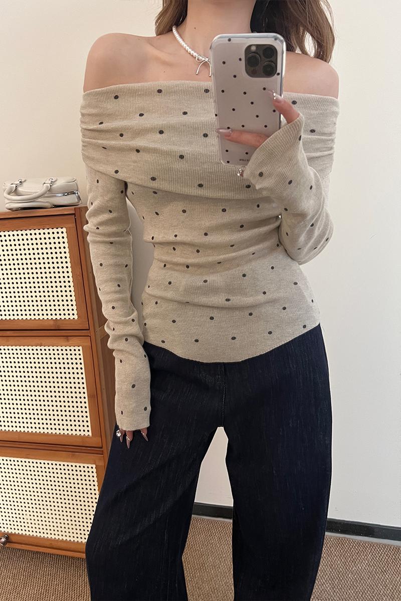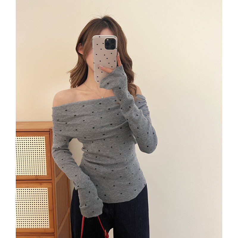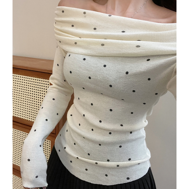 오프 숄더 1 숄더 탑베이스 셔츠가있는 실제 폴카 도트 스웨터 스프링 디자인 여성을위한 긴 소매