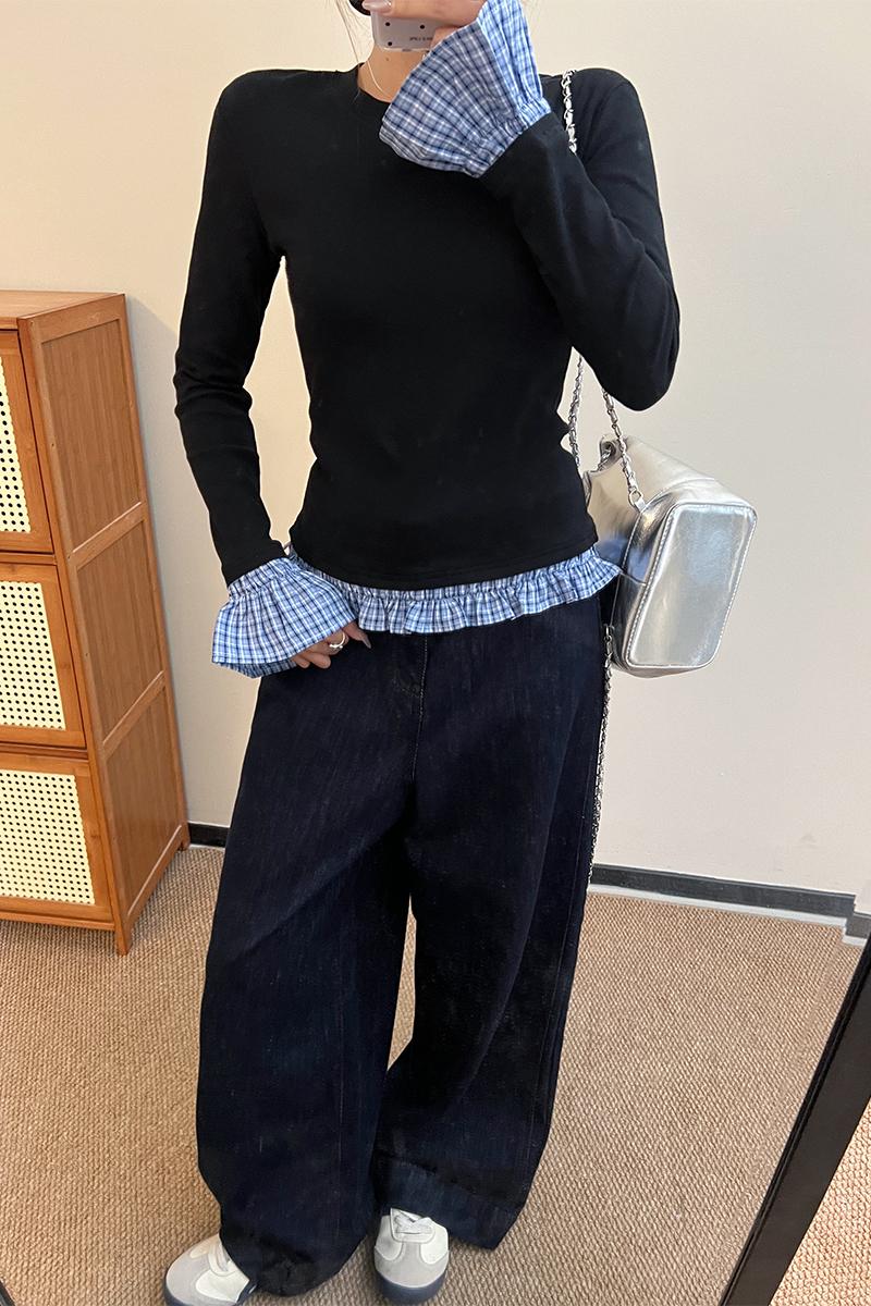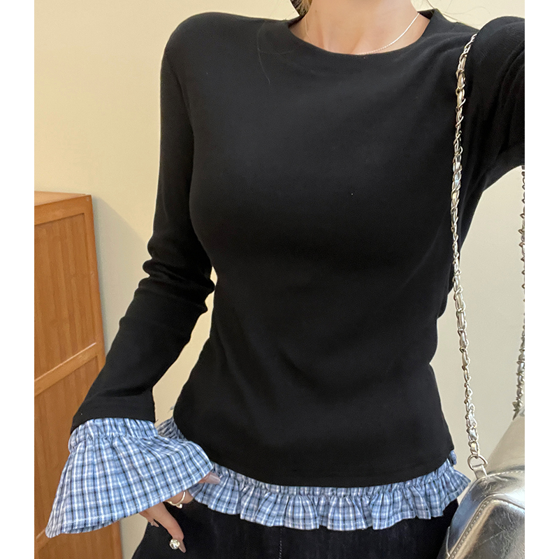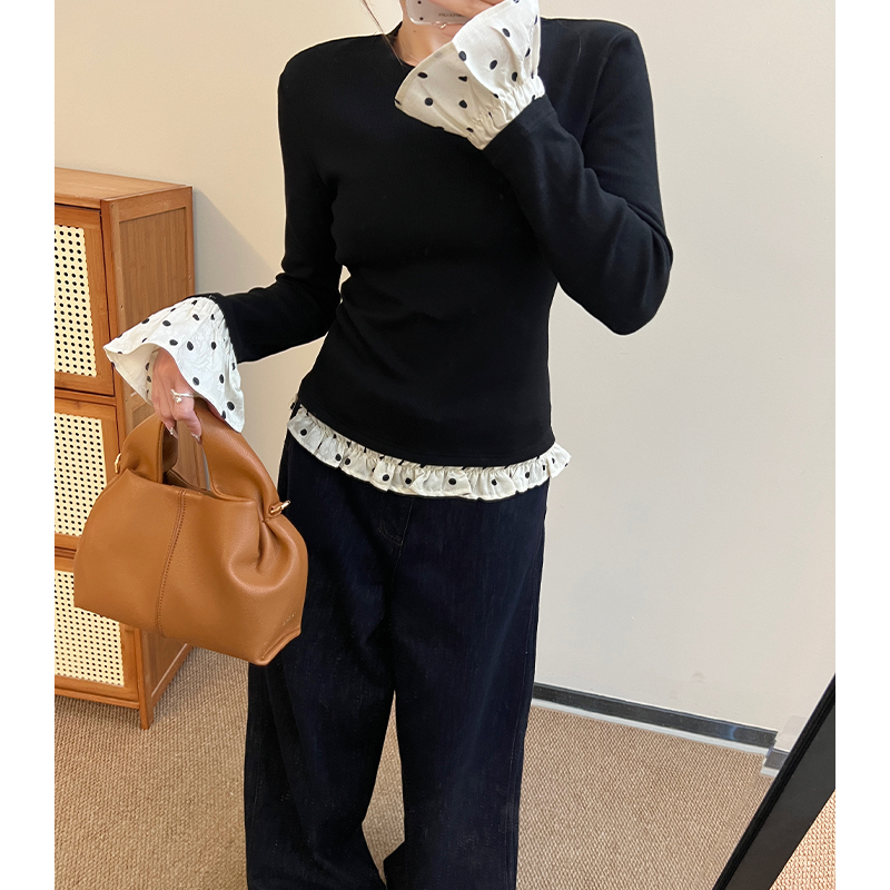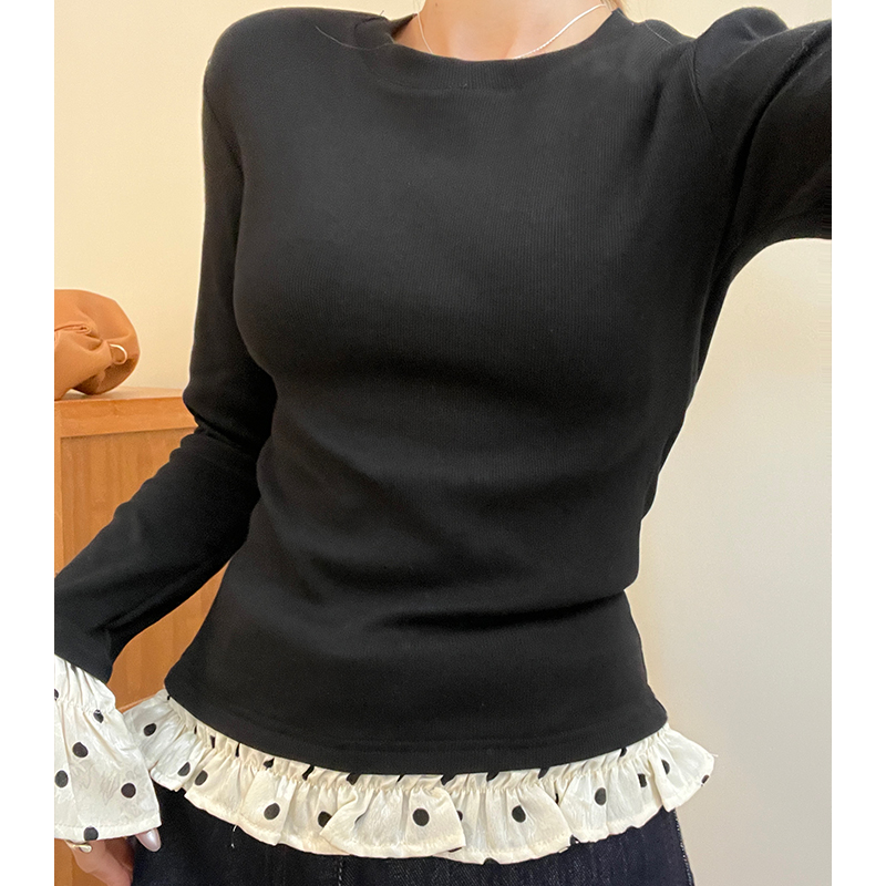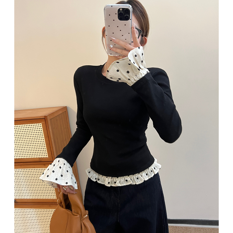 실제 가격의 한국 버전 대조 컬러 폴카 도트 레이스 플레어 슬리브 여성용 봄 슬림 가짜 2 피스 탑을위한 긴 소매 티셔츠