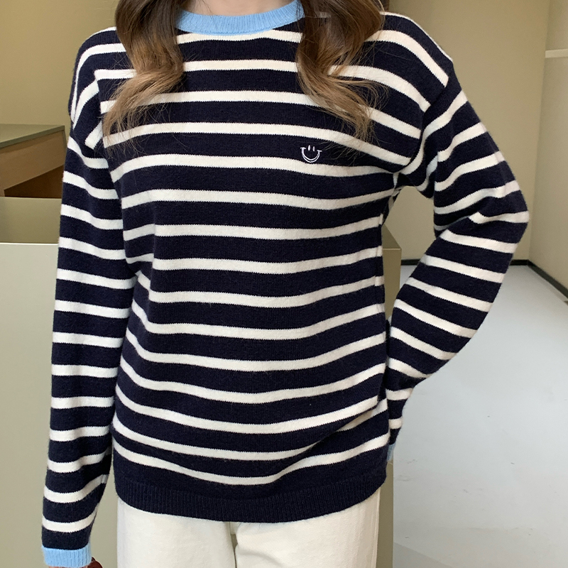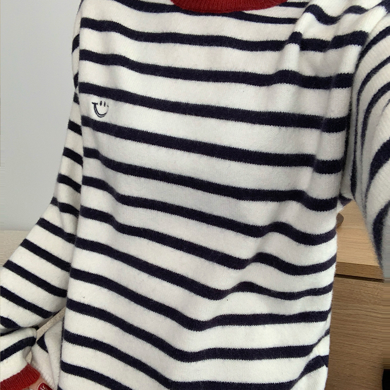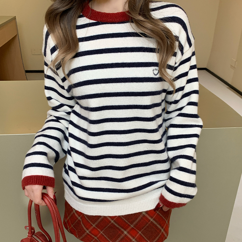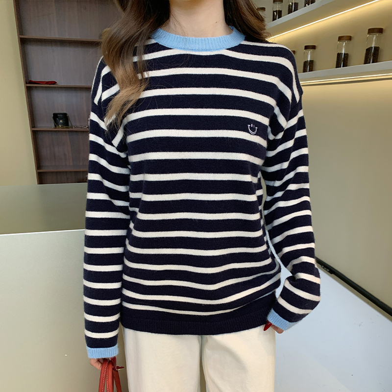 실제 가격#대비 대비 줄무늬 자수 둥근 목 목 스웨터 가을과 겨울 두꺼운 느슨한 게으른 스타일 스웨터 탑