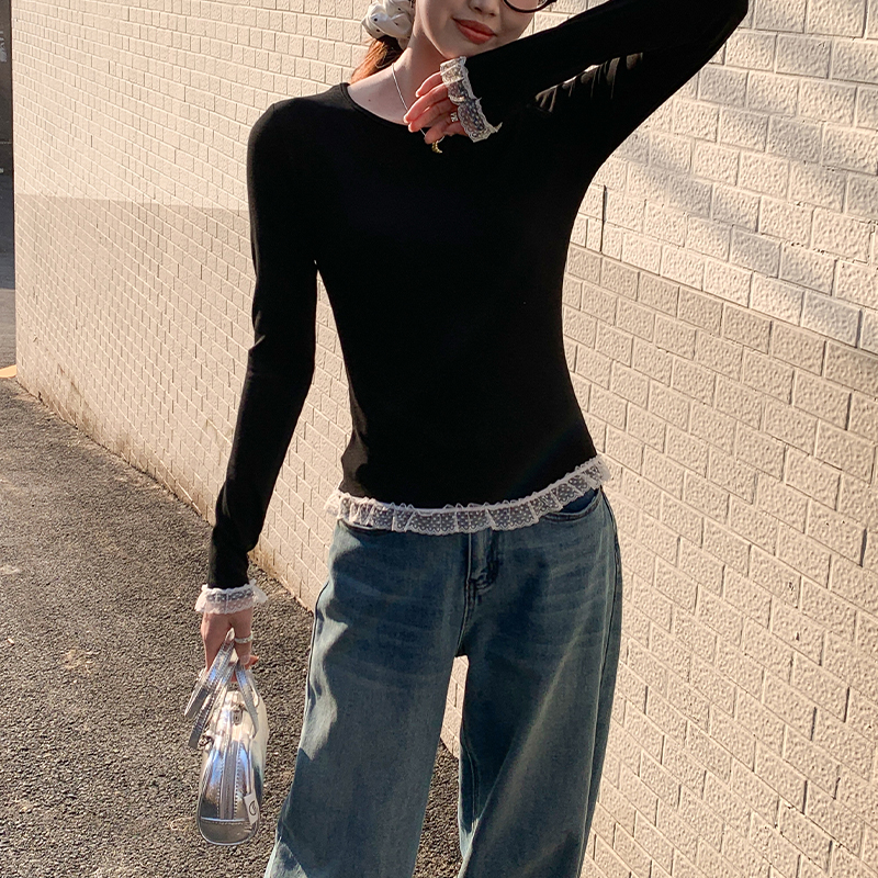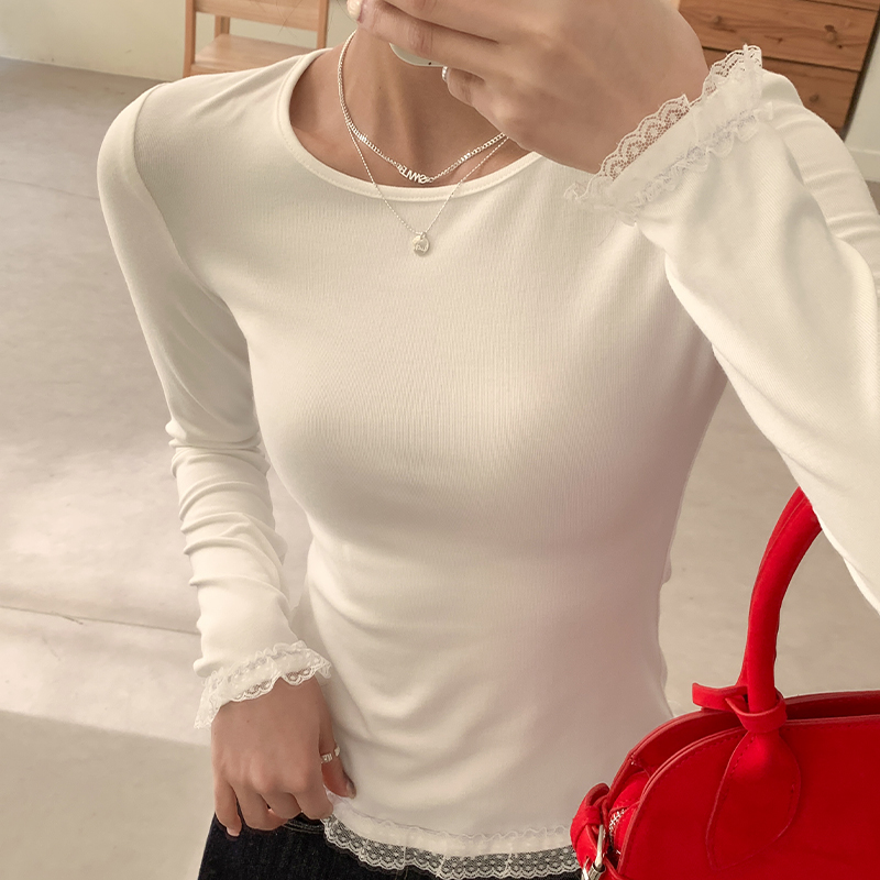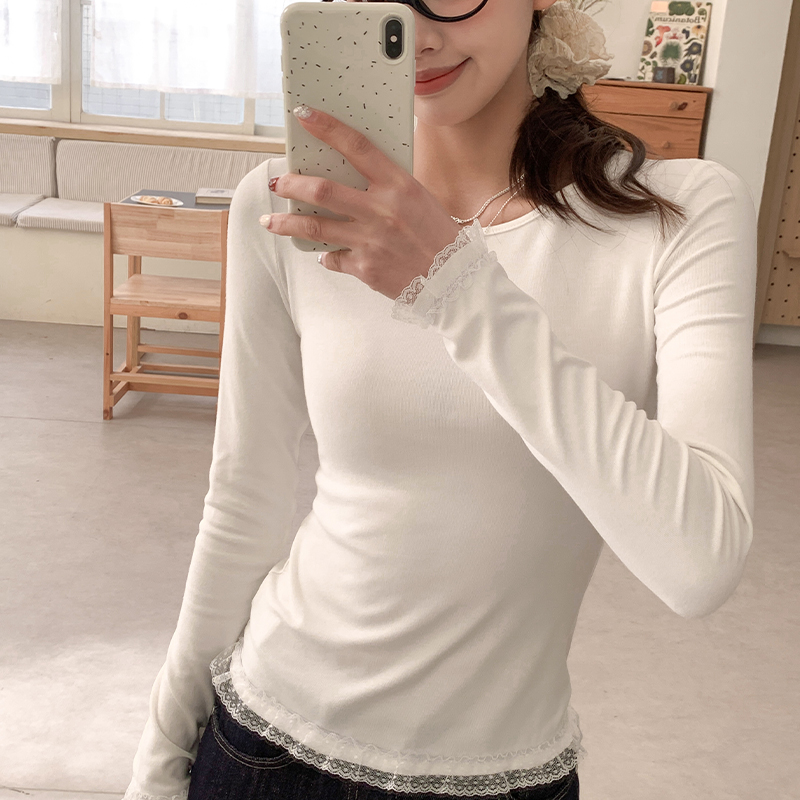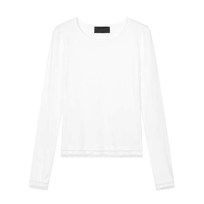 스프링 슬림 핏과 슬림 한 바닥 셔츠의 여성을위한 흰색 레이스 레이스 긴팔 티셔츠의 실제 인한 버전