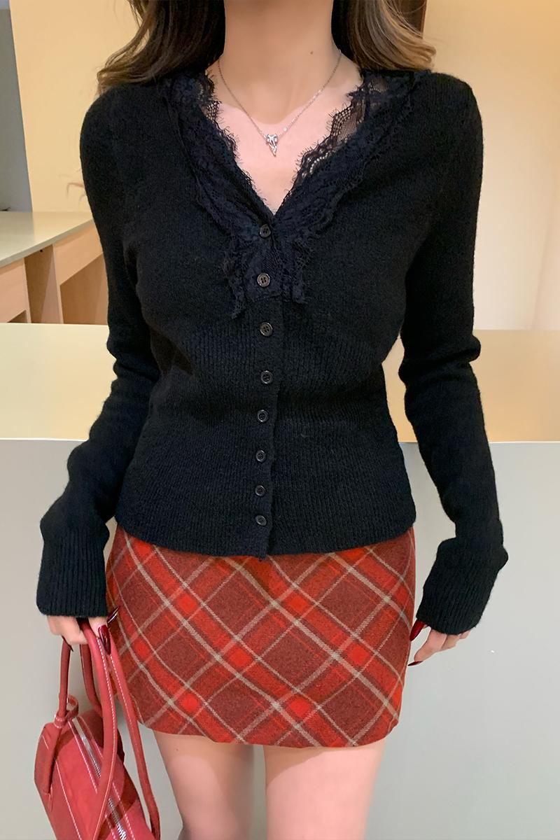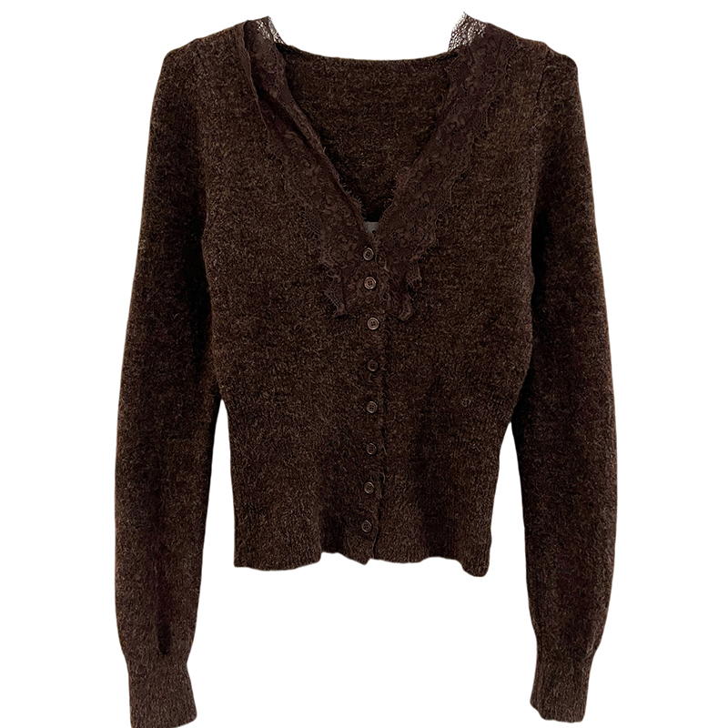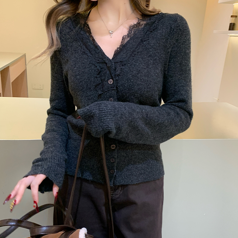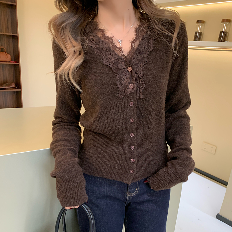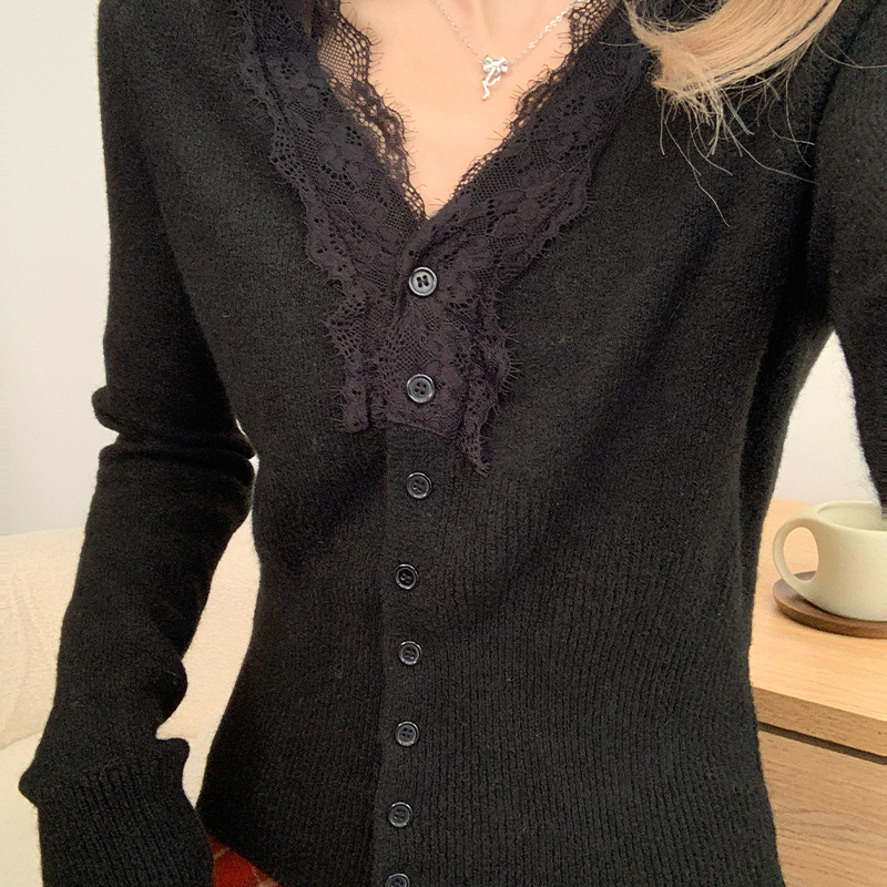 실제 가격#레이스 V- 넥 스웨터 가을과 겨울 디자인 여성을위한 독특한 탑베이스 셔츠