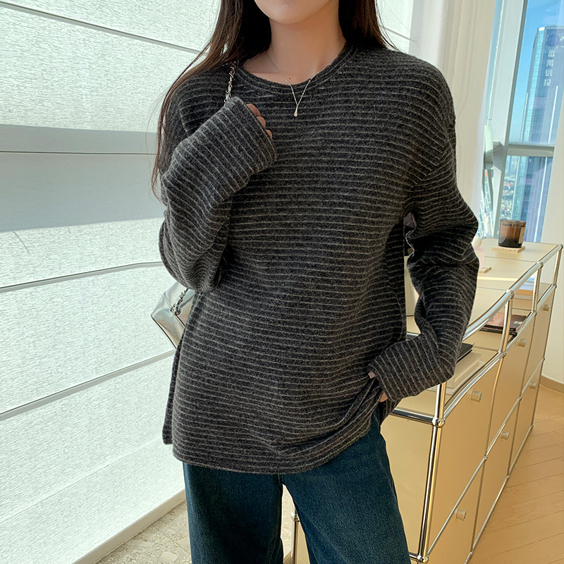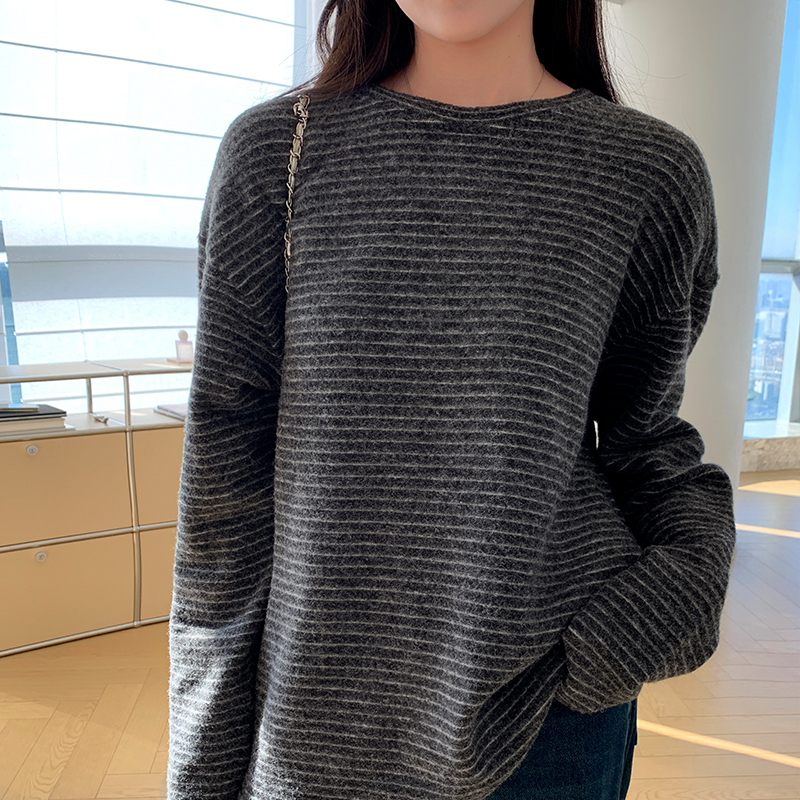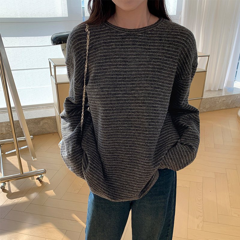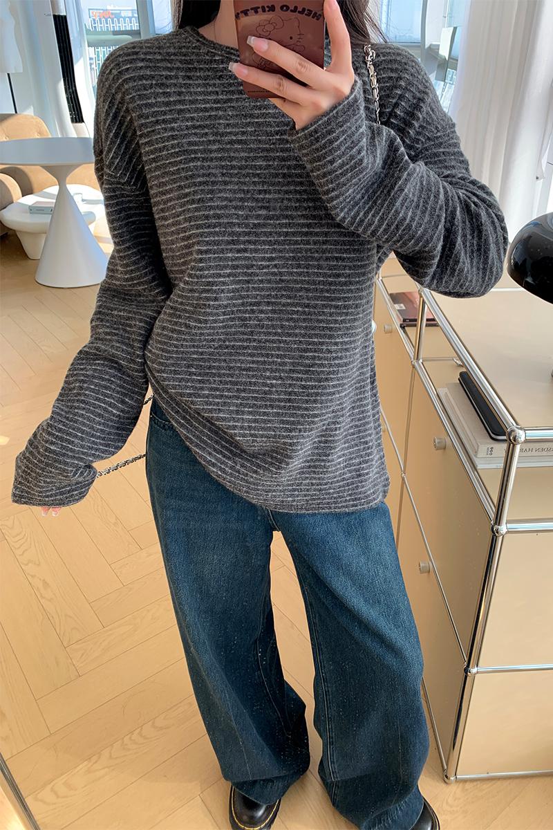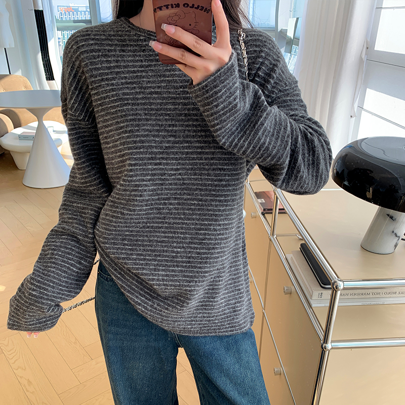 실제 가격#가을과 겨울에 여성을위한 스트라이프 라운드 목베이스 셔츠 탑 긴 소매 티셔츠 외부에서 느슨하고 다재다능한 여성 스타일