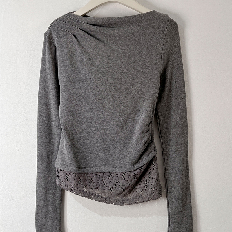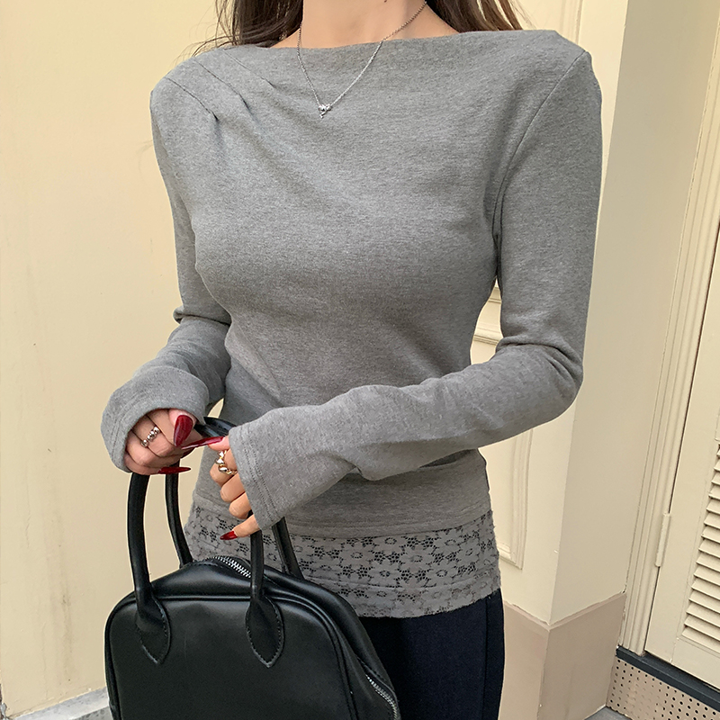실제 샷 및 실제 가격 #lace 스 플라이 싱 플러스 벨벳 여성 내부 착용 봄 슬림 한 숄더 탑 긴팔 모피 티셔츠