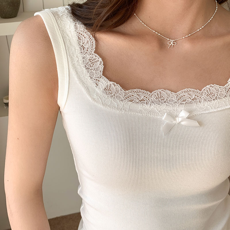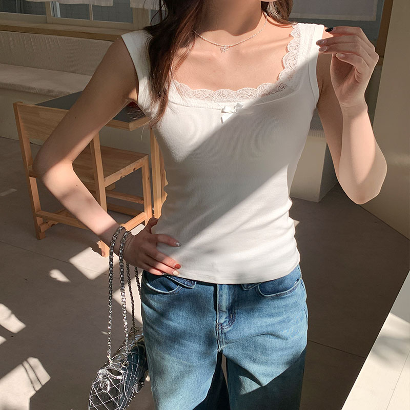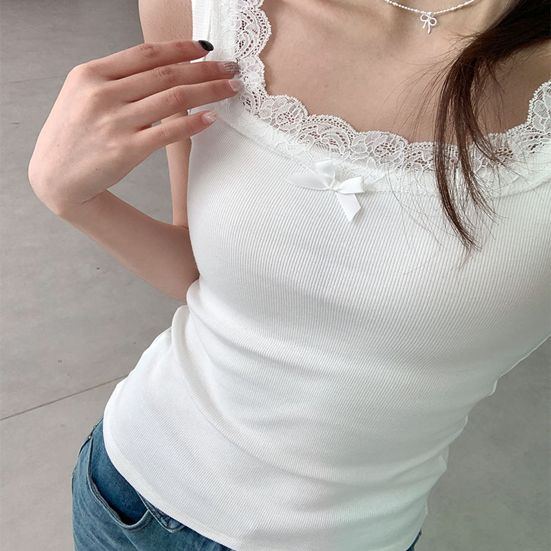 봄 순수 슬림 짧은 민소매 탑을 입고있는 여성을위한 실제 흰색 레이스 서스펜더 조끼