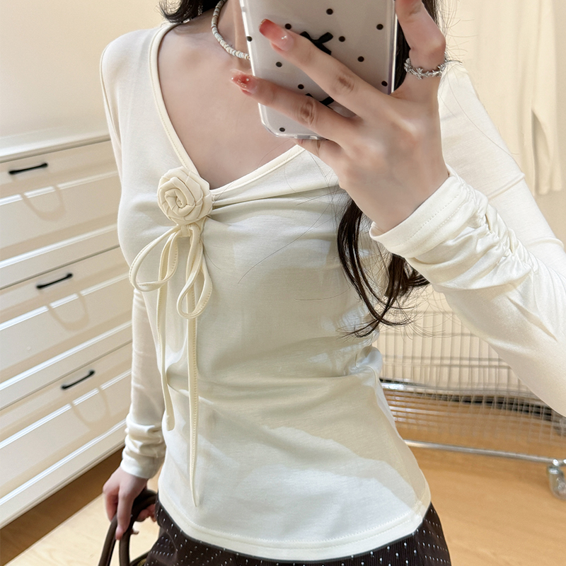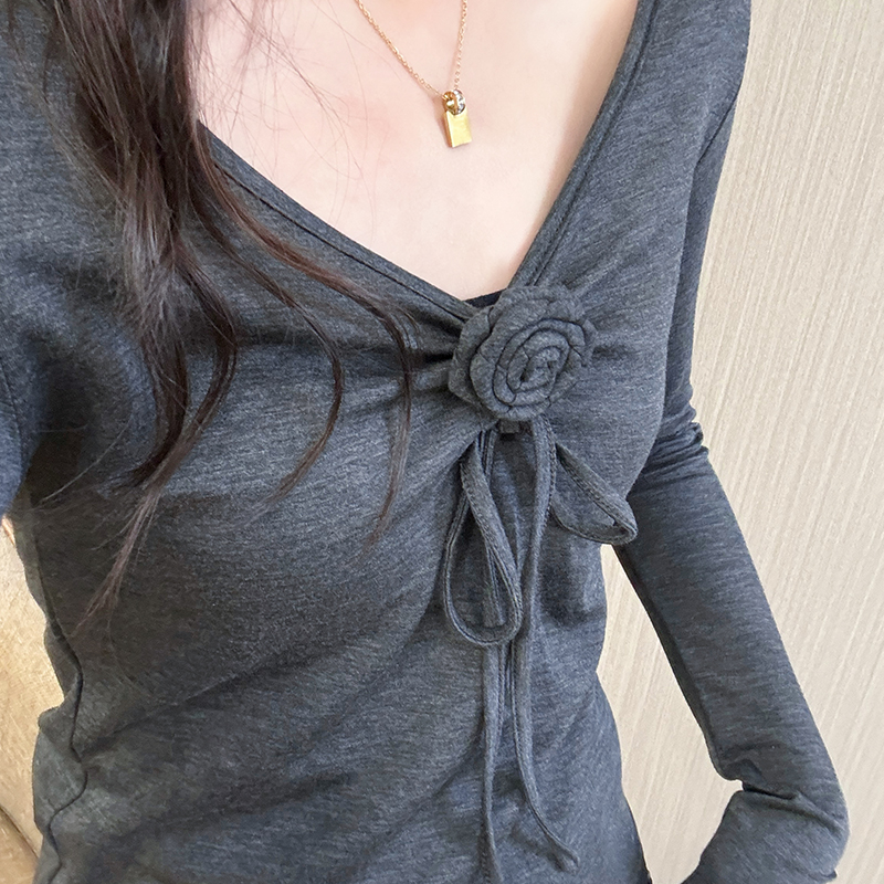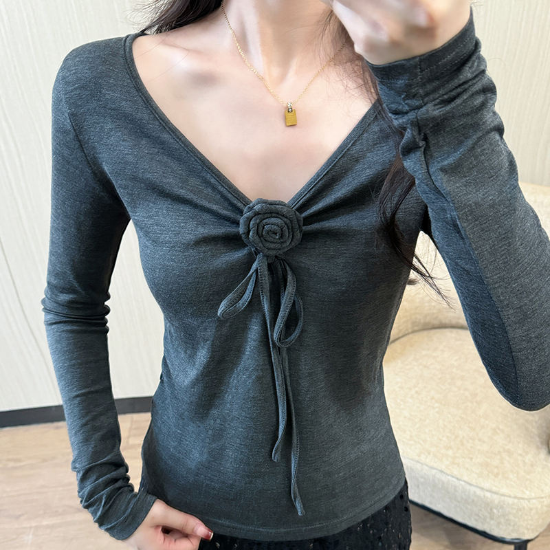 실제 가격#3d 꽃 드로 스트링 타이 여성 가을을위한 긴팔 티셔츠 New Slim Fit Slim V-Neck Chic Top
