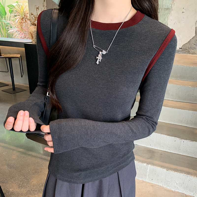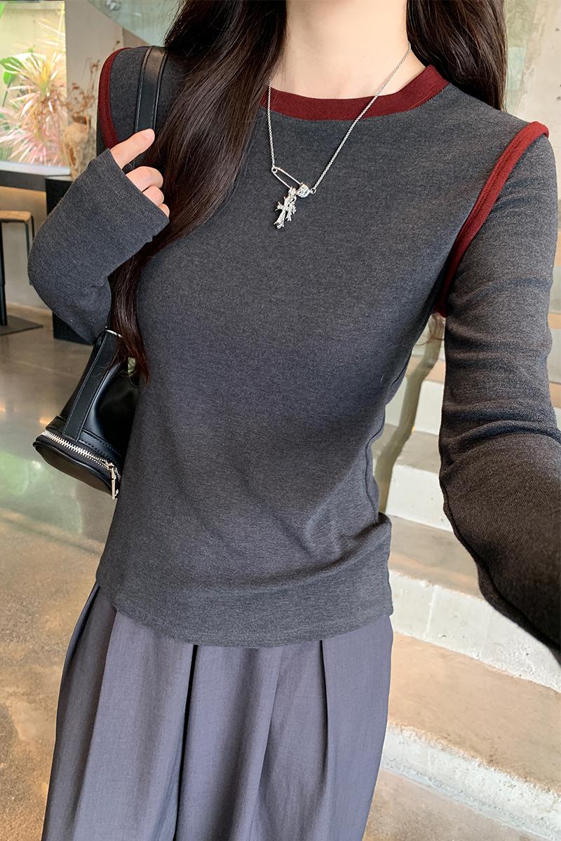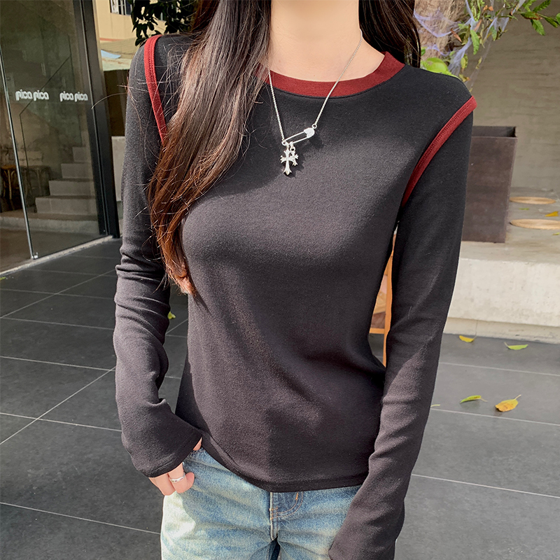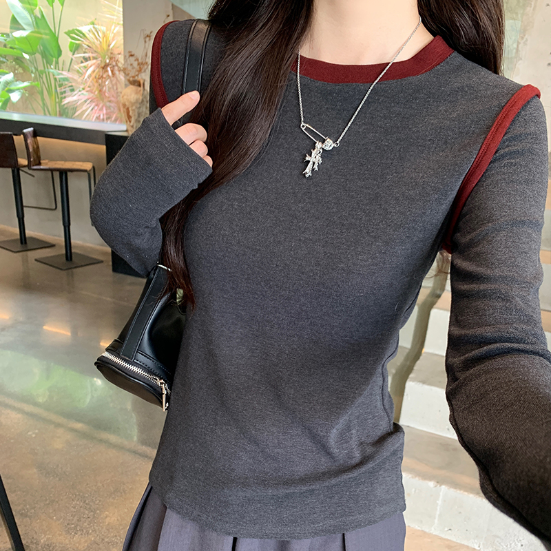실제 가격#가을 새로운 대조적 인 색상 가짜 가짜 2 피스 색상 차단 라운드 목이 긴팔 티셔츠 여성 다용도 캐주얼 슬림 탑