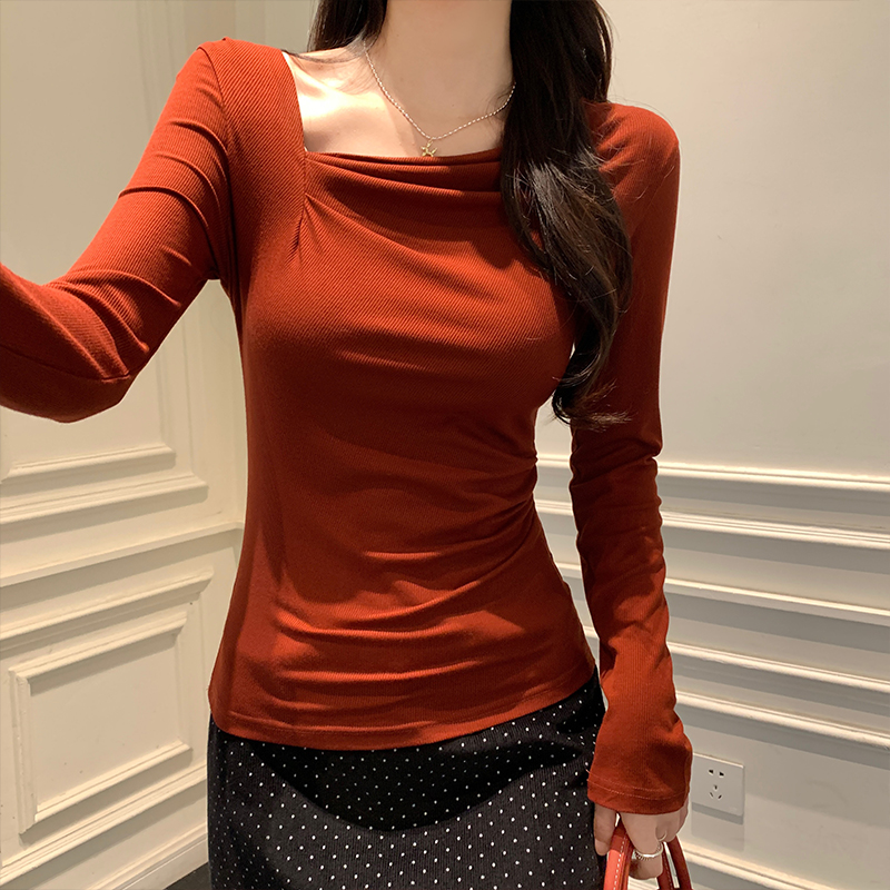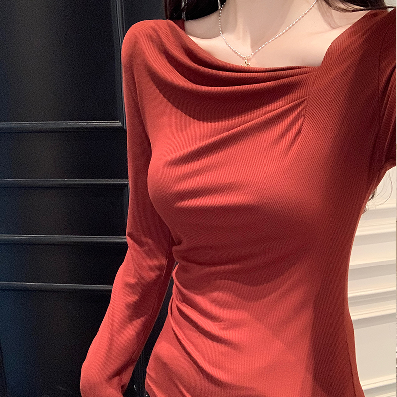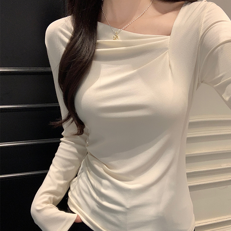 실제 가격 실제 샷 #Slanted Collar 불규칙한 긴팔 티셔츠 이른 가을 디자인, 슬리밍 바닥 셔츠, 어깨 탑