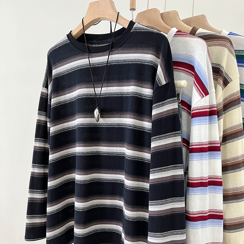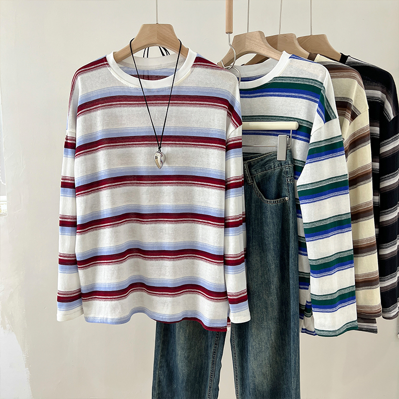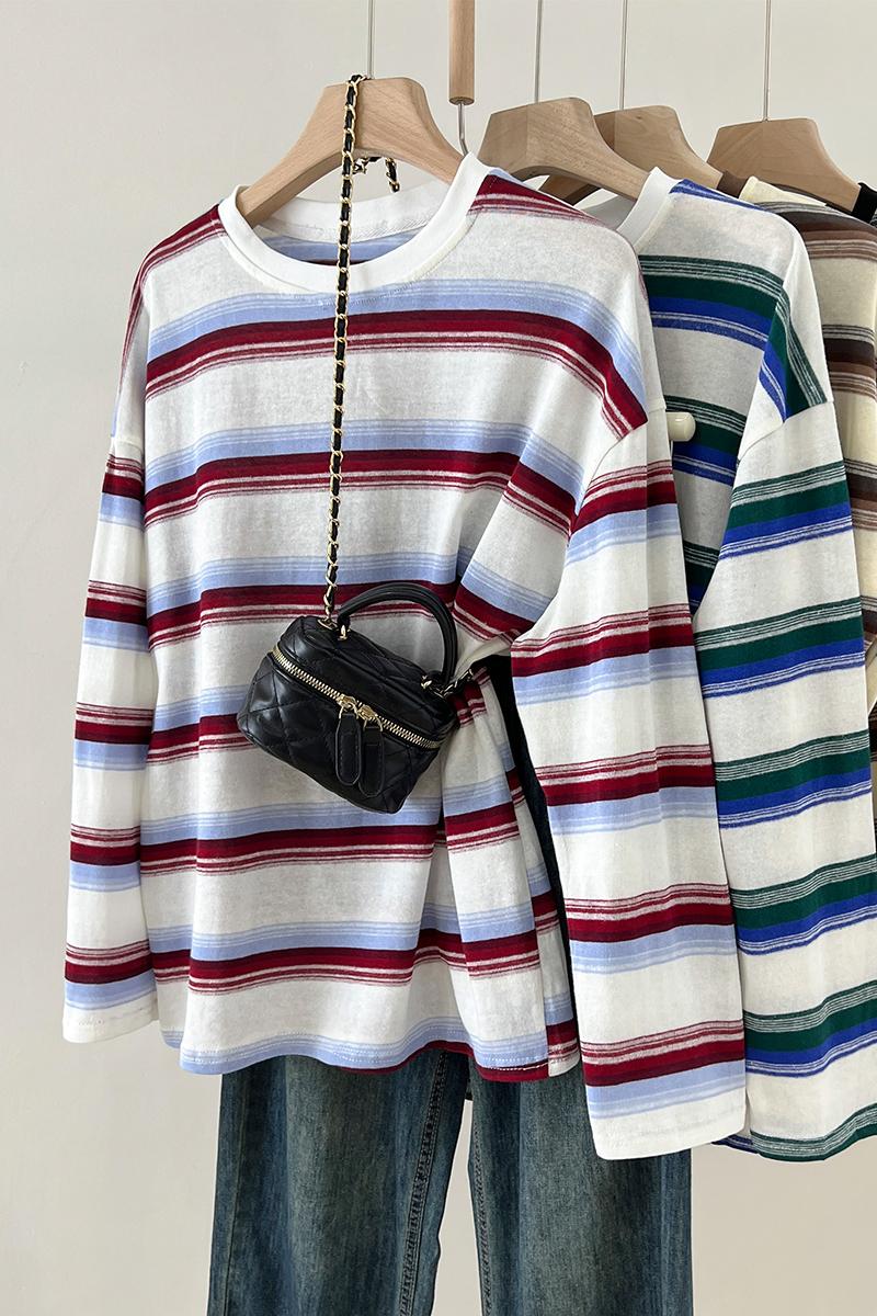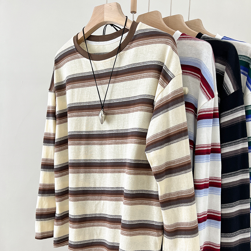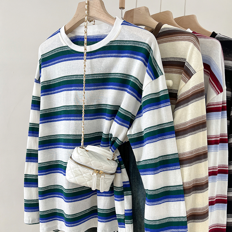 Real-Price Real Shot #korean 레트로 대조 여성 봄과 가을 디자인 틈새 탑을위한 줄무늬 얇은 긴팔 티셔츠
