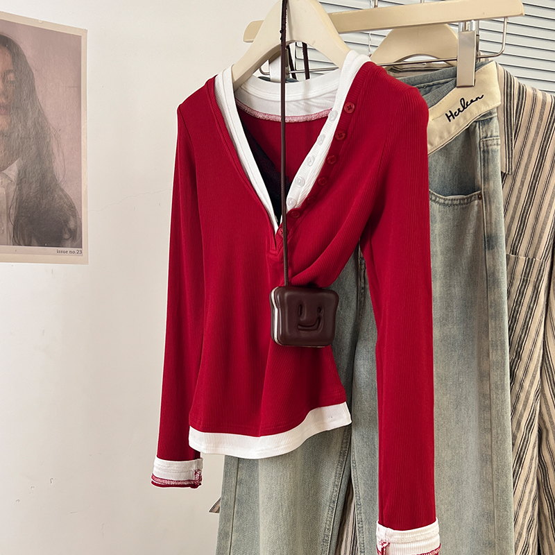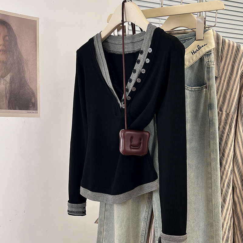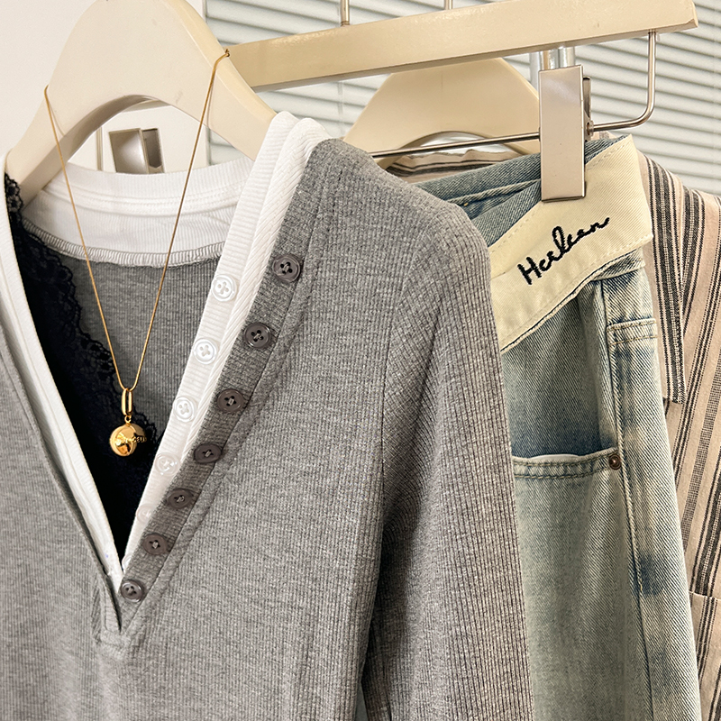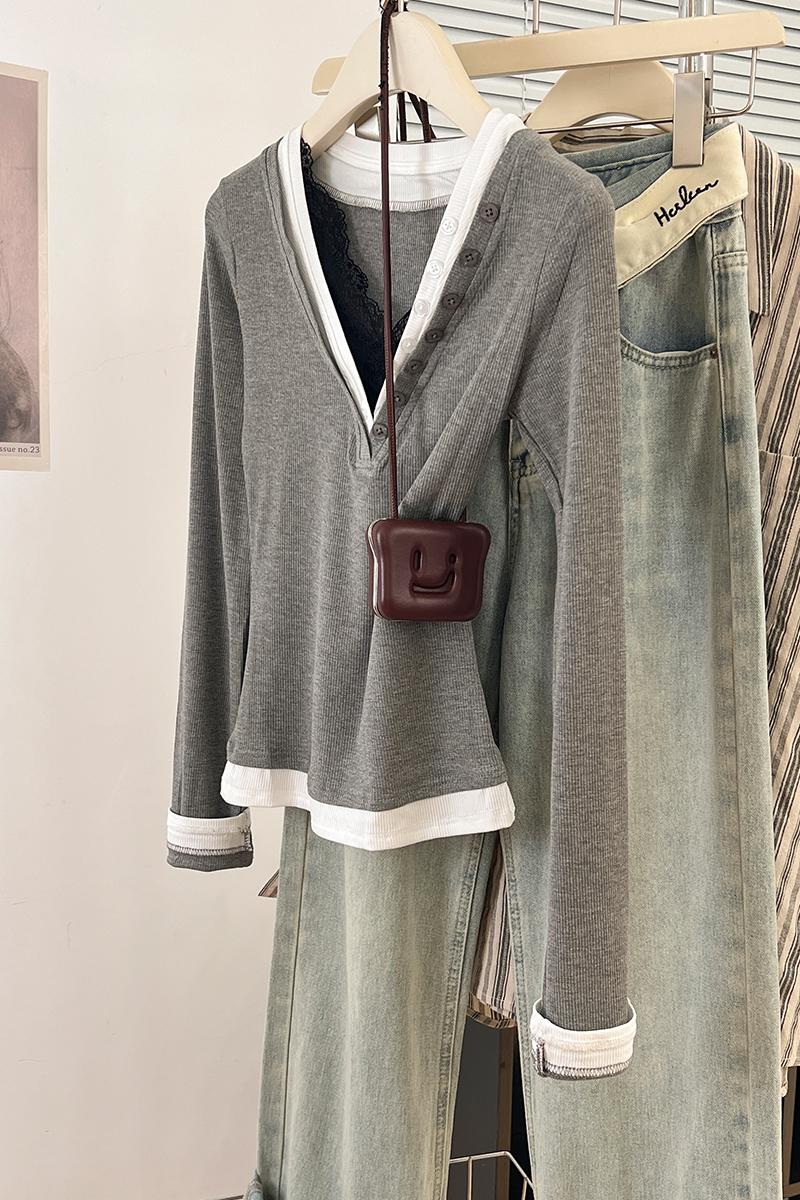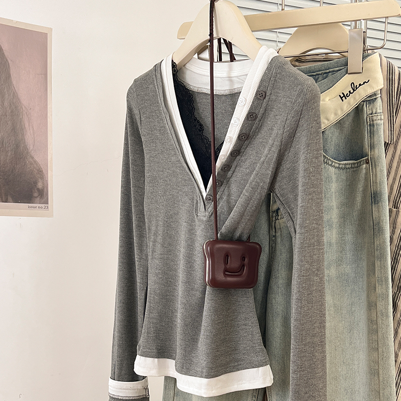 Real-Price Real Shot #Grey Lace V-Neck 가짜 두 피스 앞쪽 어깨가 가을에 여성을위한 긴팔 티셔츠 New Slim Fit Top