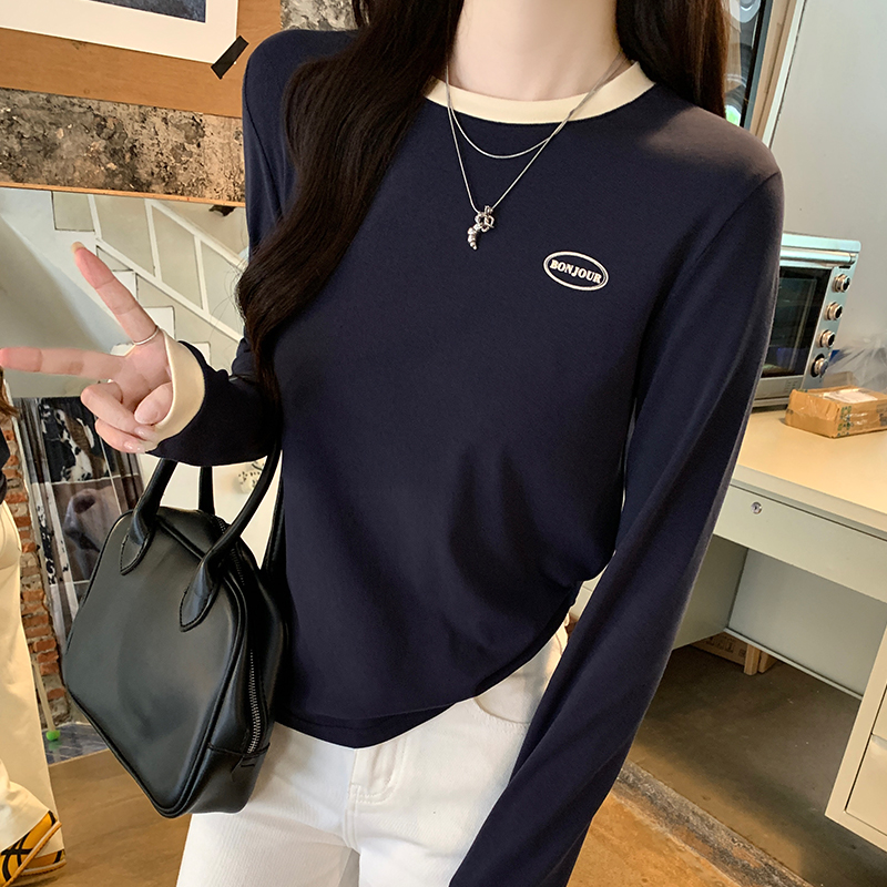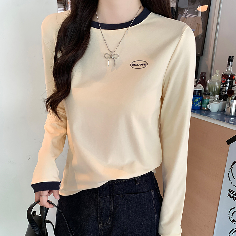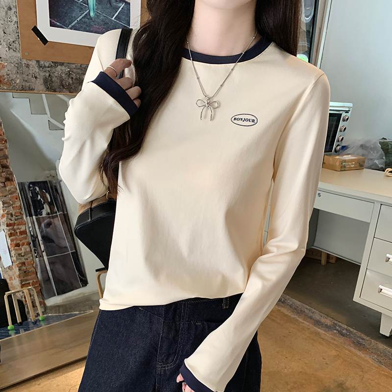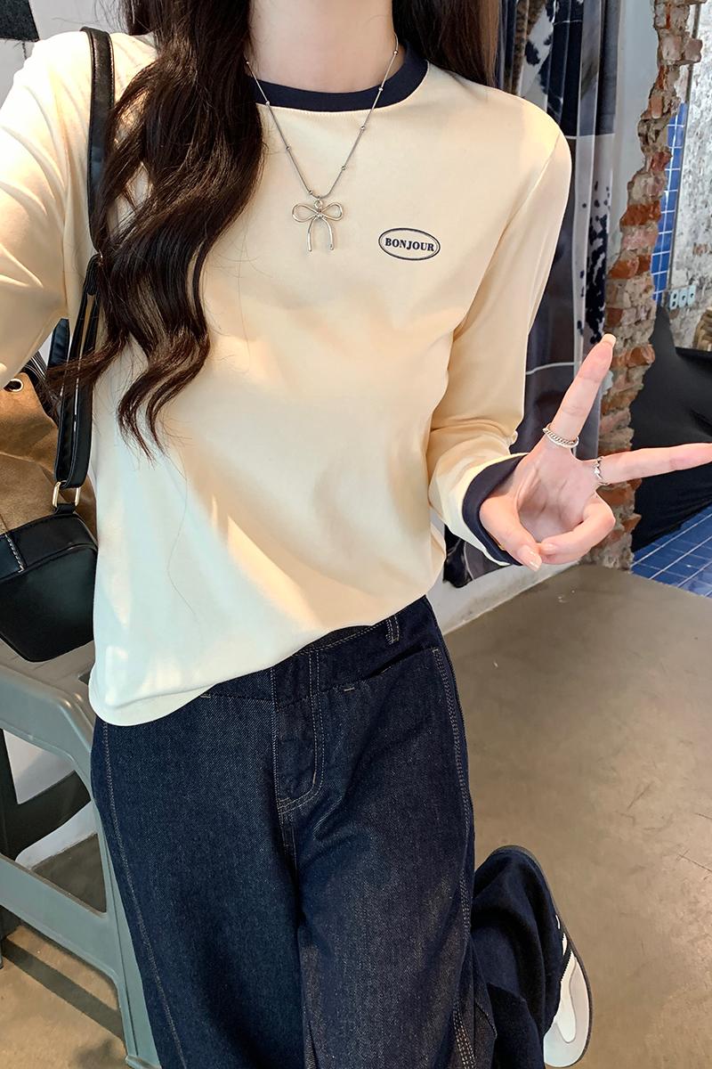 Real Price Real Shot #American Retro Apricot 자수 어깨 긴팔 티셔츠 가을과 여성의 여성을위한 겨울 탑베이스 셔츠