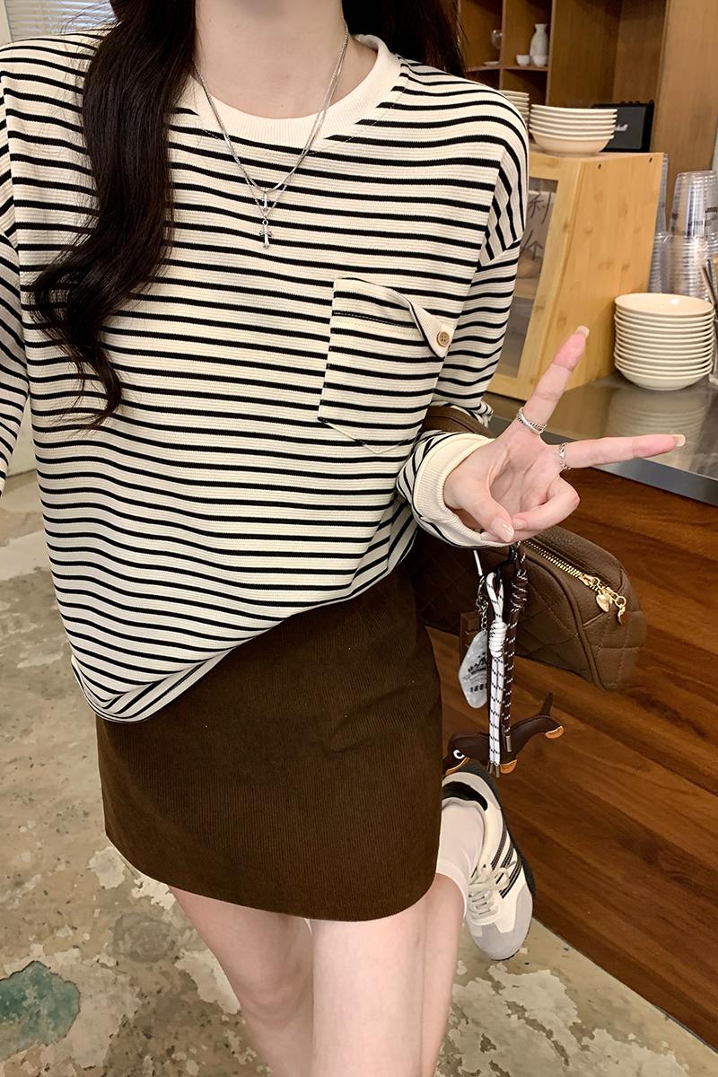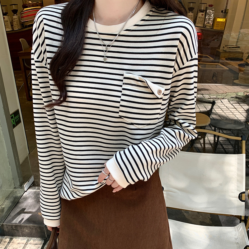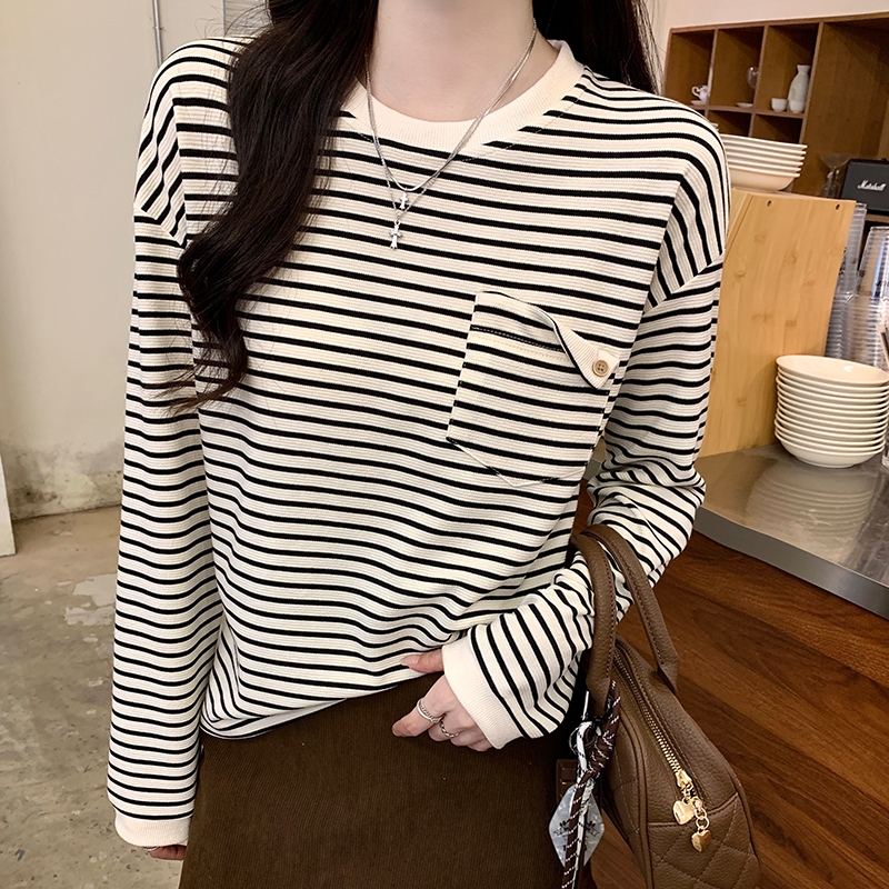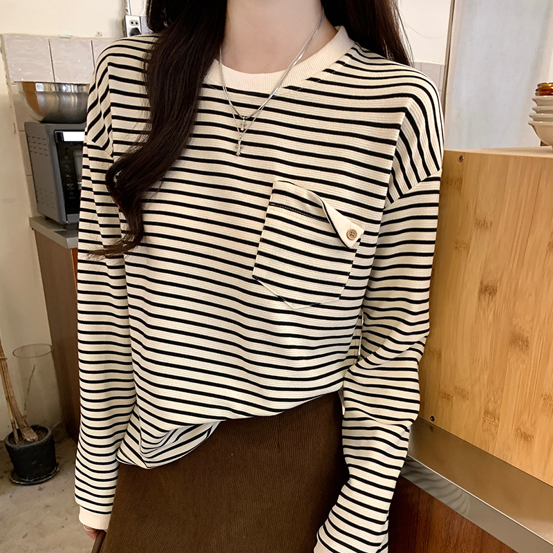Real Price Real Shot #Apricot 스트라이프 어깨 롱 슬리브 티셔츠 봄과 가을 티셔츠 느슨한베이스 셔츠 속옷