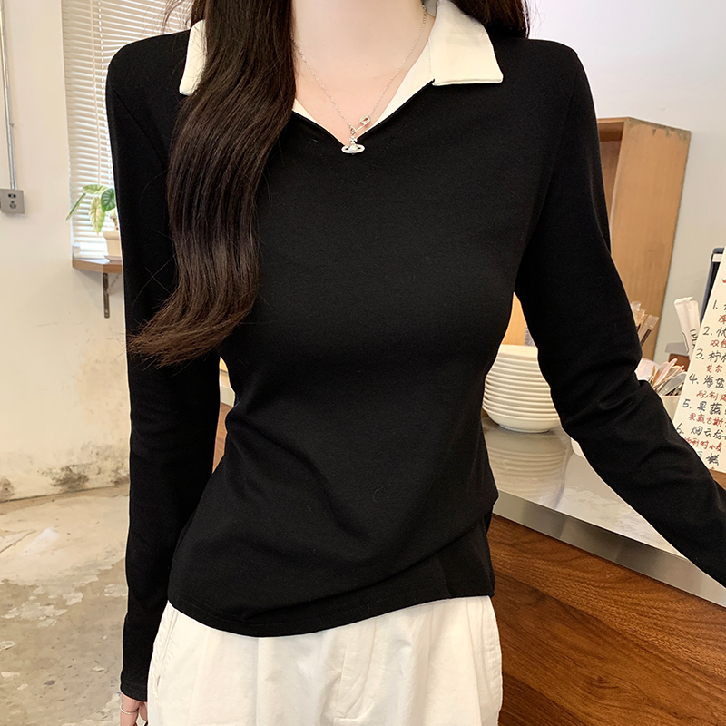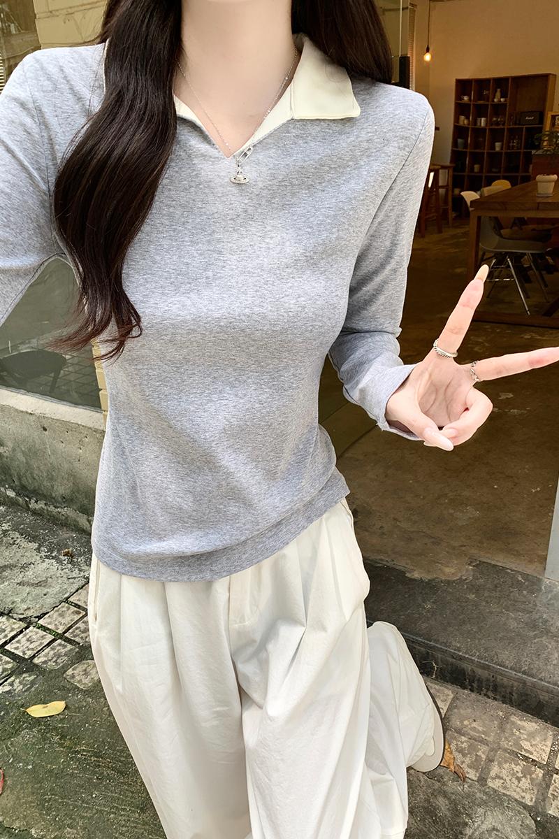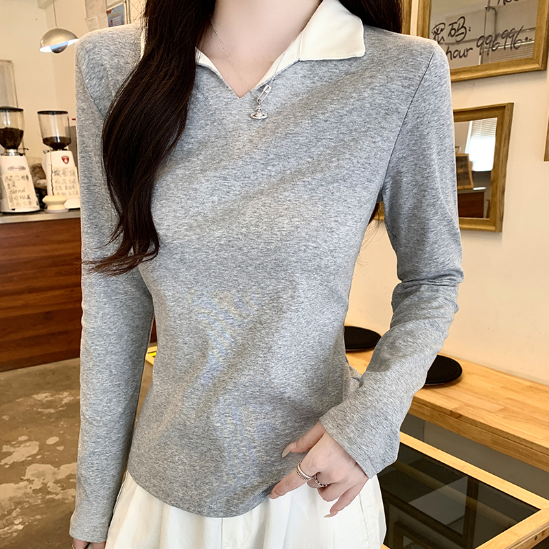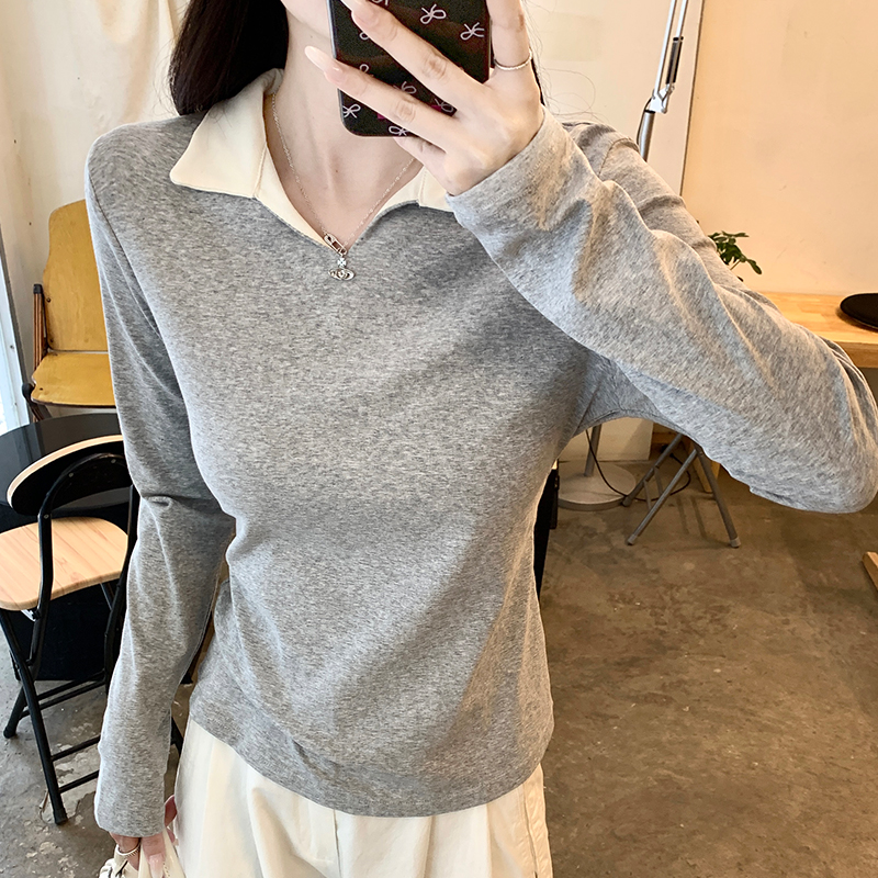 진짜 가격 실제 샷 #플라워가있는 회색 가짜 2 피스 폴로 라펠 전면 숄더 롱 슬리브 티셔츠 가을베이스 셔츠 속옷