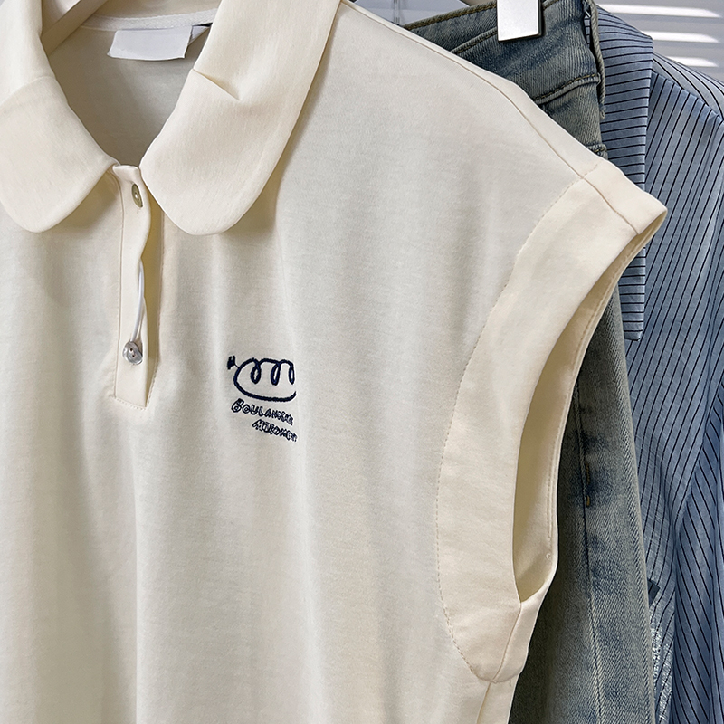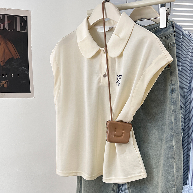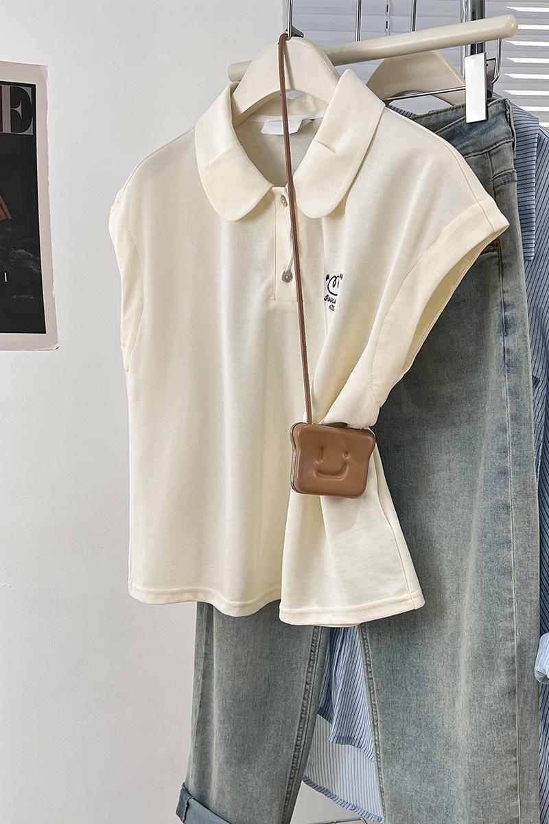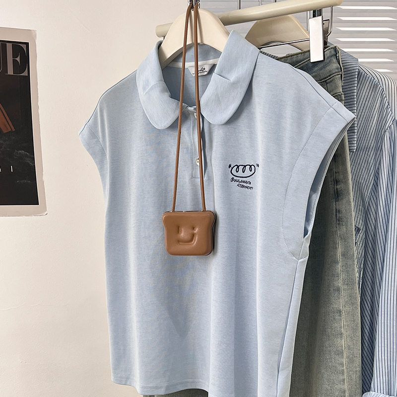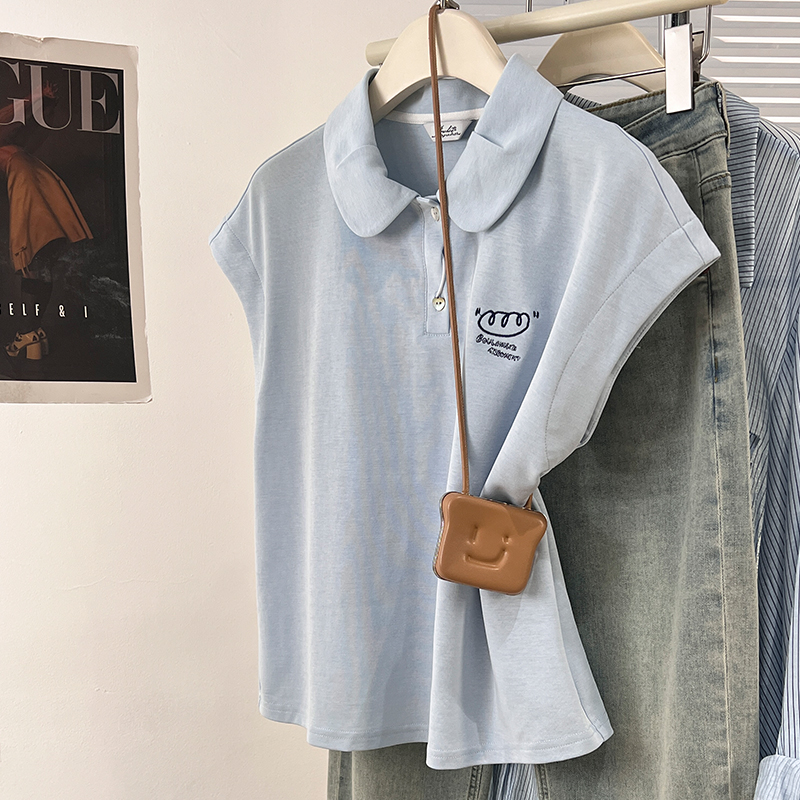 진짜 가격 실제 샷 #Blue 자수 폴로 칼라 앞쪽 어깨 어깨 짧은 슬리브 티셔츠 여름 여름 여름 소매 소매 소매 조끼 작은 비행 슬리브 탑