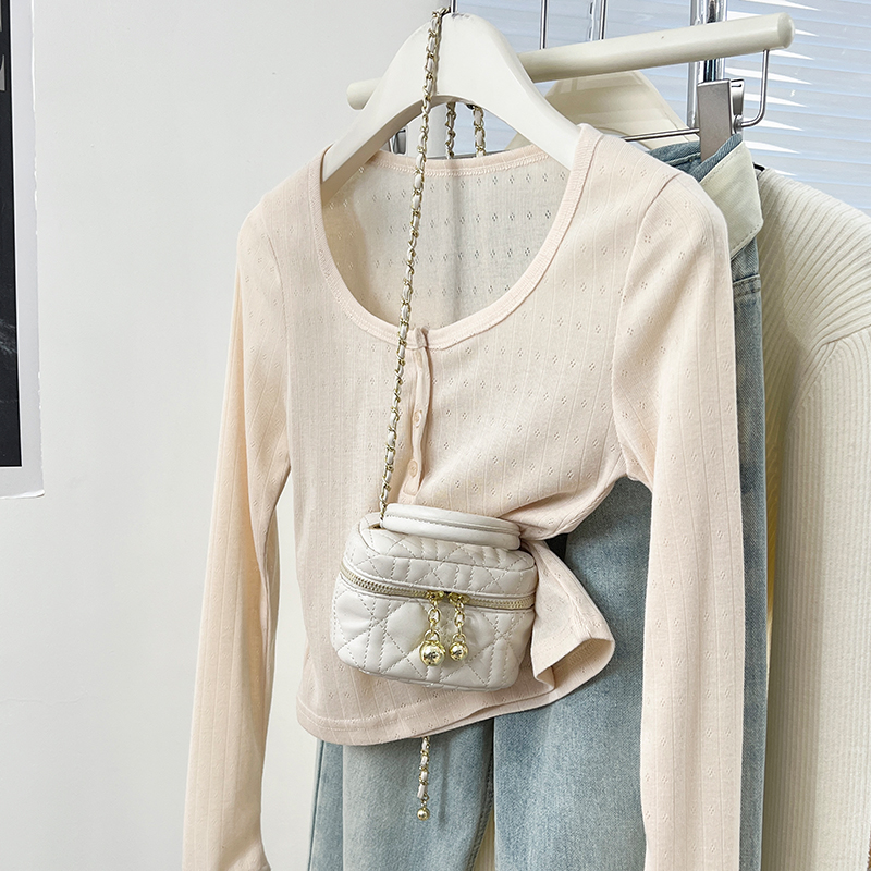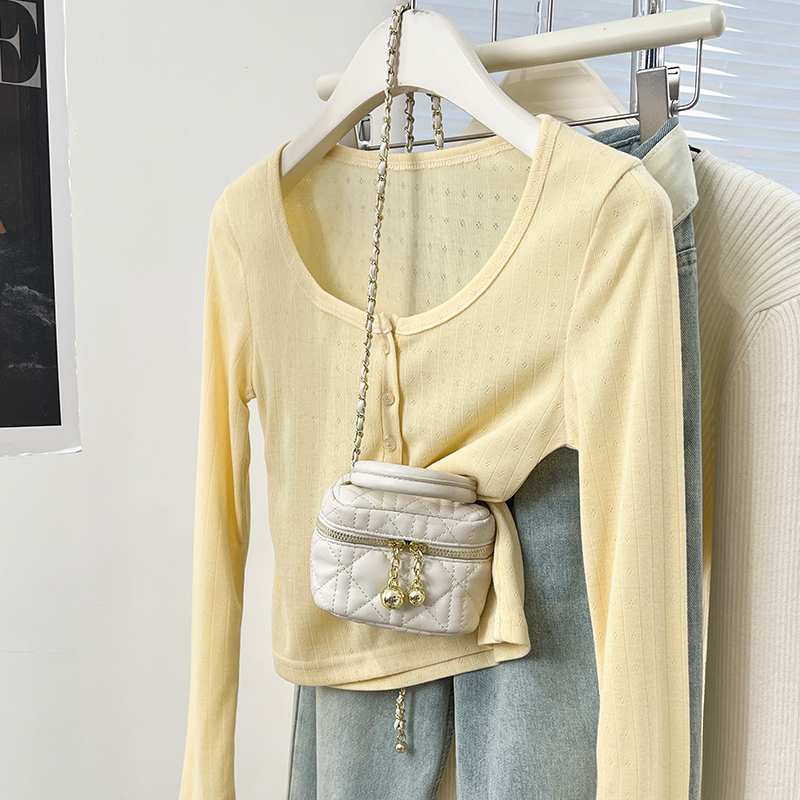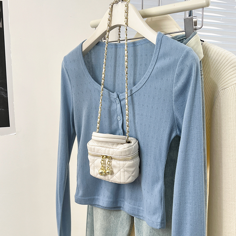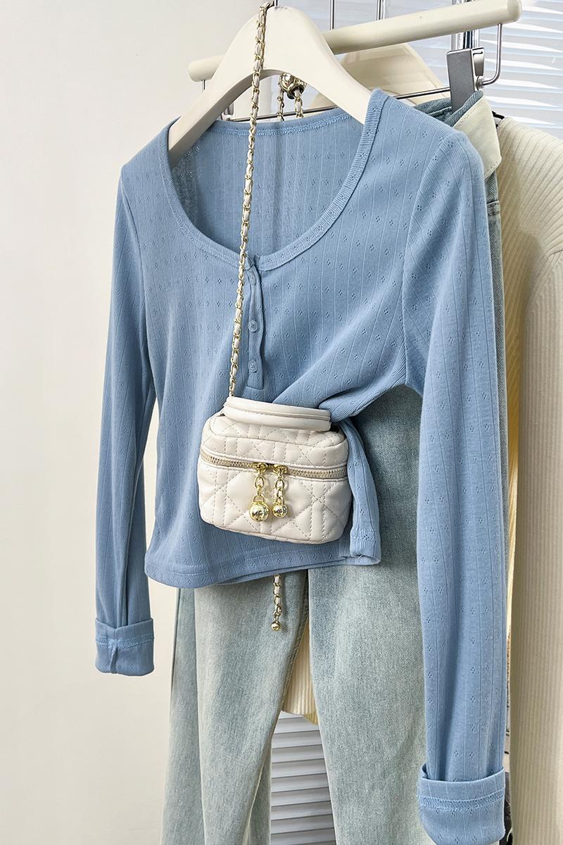 Real-Price Real-Life Shot #Blue Pure Cotton U-Neck Front Shoulder Women 's Spring 및 Autumn Base Shirt Slim Short Top을위한 긴팔 티셔츠