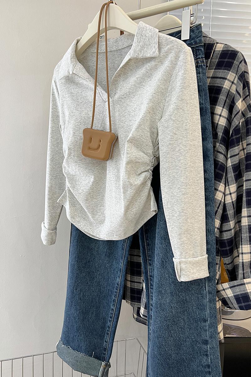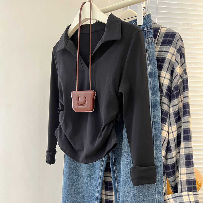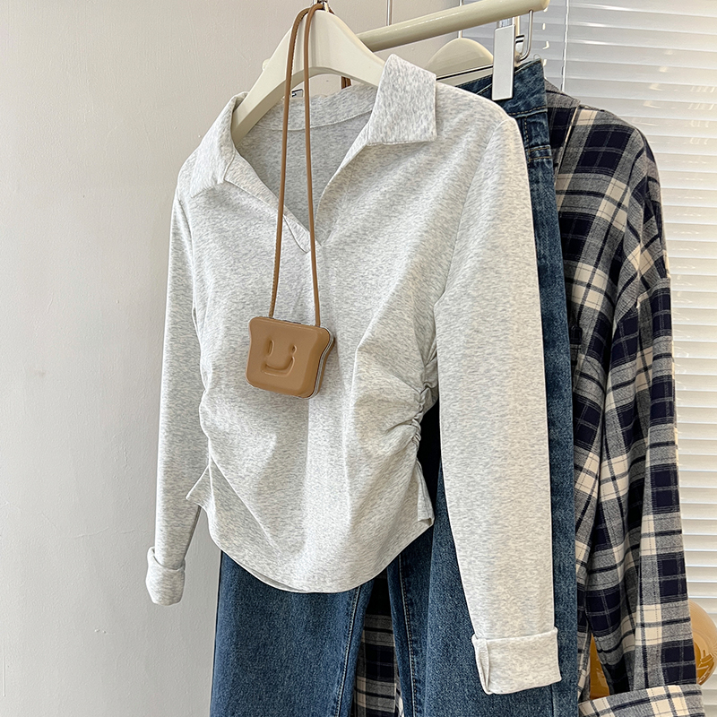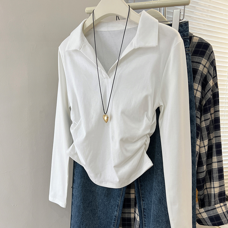 Real Price Real Shot #American Retro White Front Shoulder Polo Neg Long-Sleeved 티셔츠 가을 불규칙한 짧은 상위 트렌디