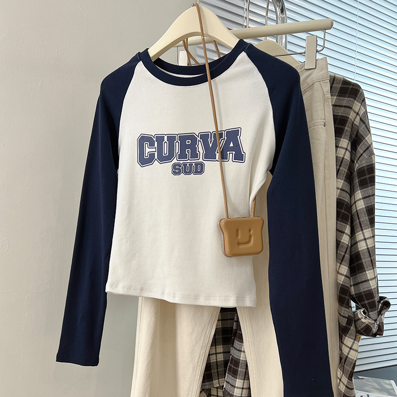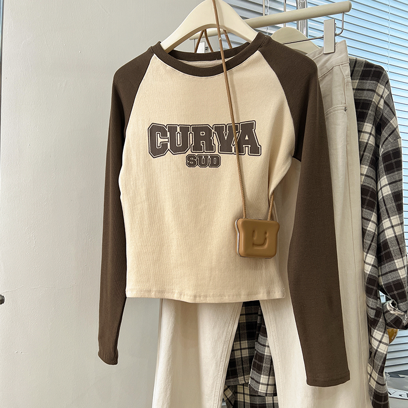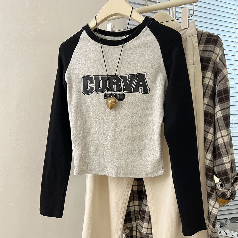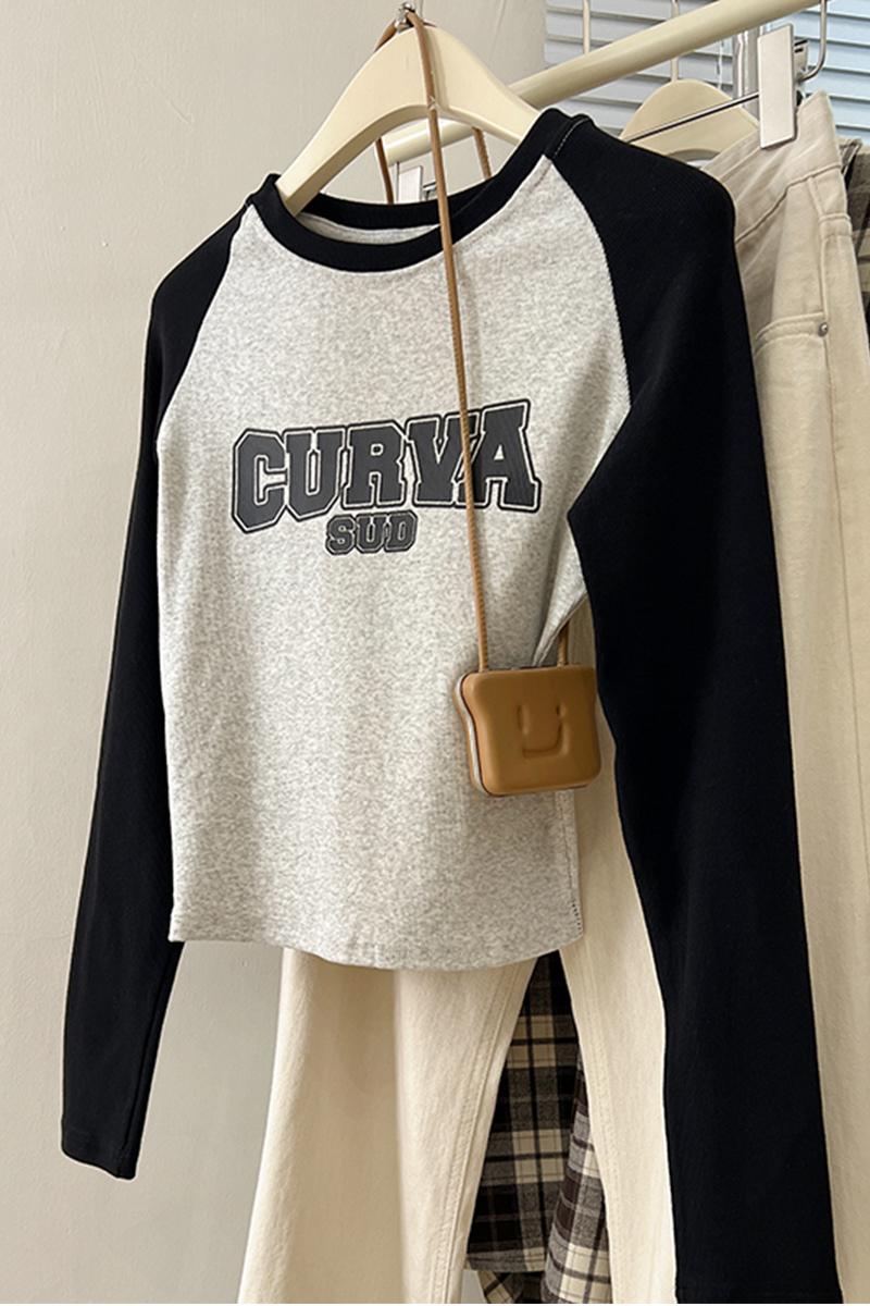 Real Price Real Shot # Rag-Shoulder 티셔츠 여성의 긴팔 대비 인쇄 된 미국의 짧은 상단이 나사로 슬림 한 기본 셔츠