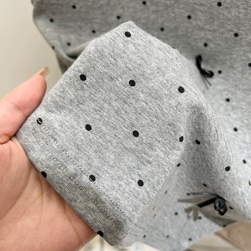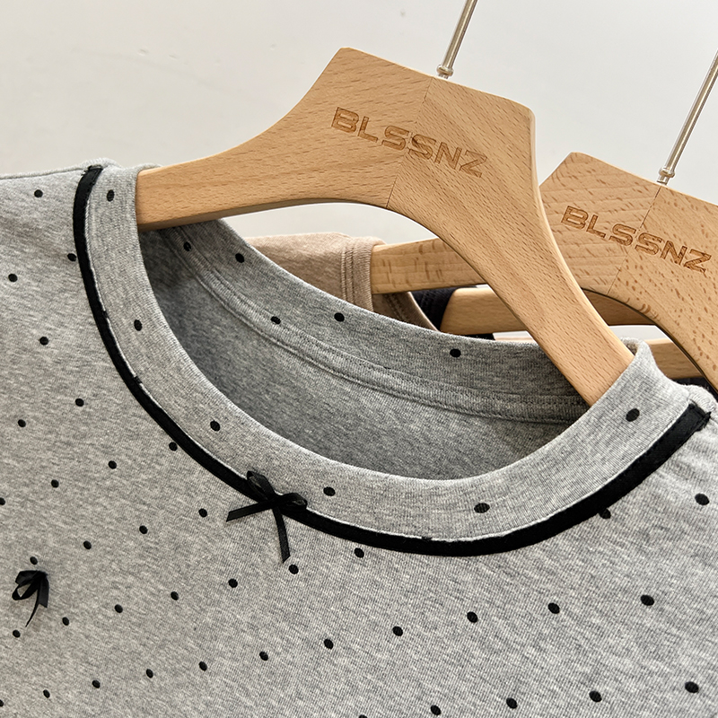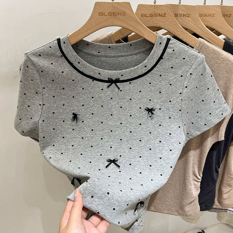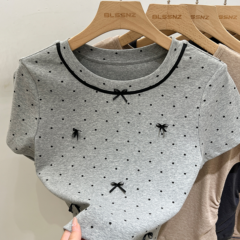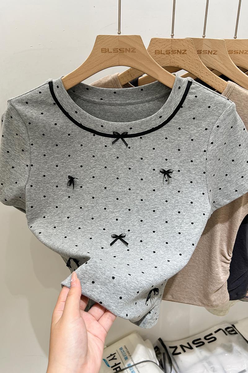 Real-Price Real Shot #Grey 폴카 도트 보우 스트레이트 어깨 어깨 짧은 슬리브 티셔츠 여름에 여성을위한 작은 슬림 짧은 상단