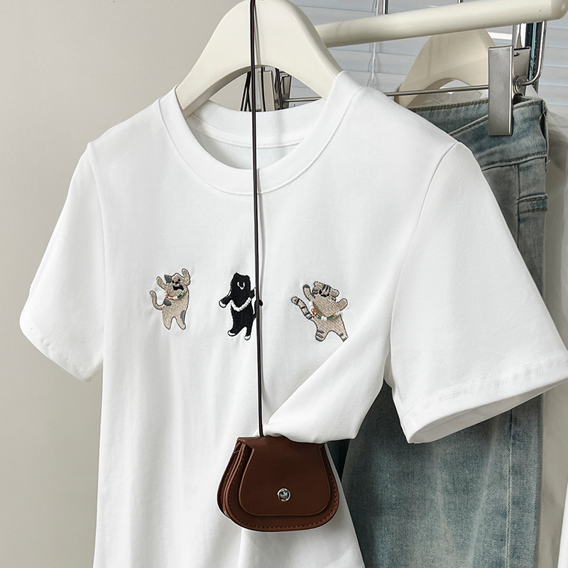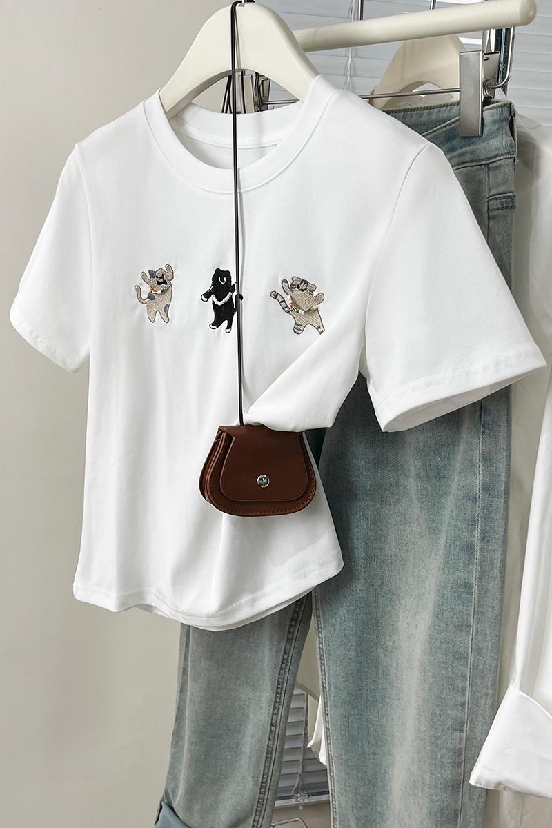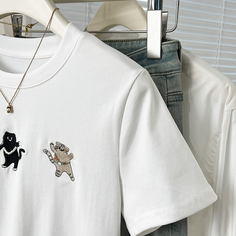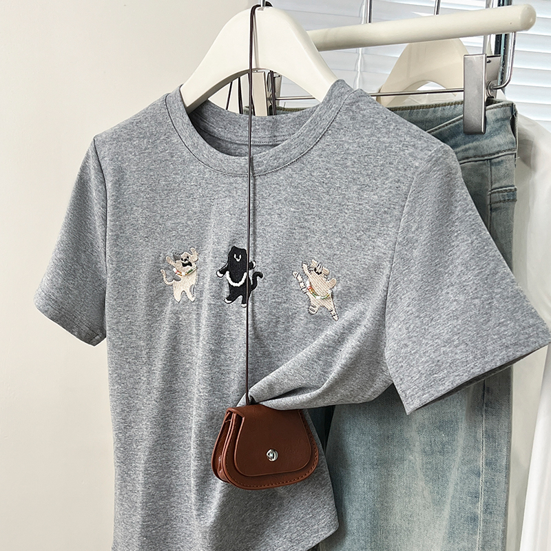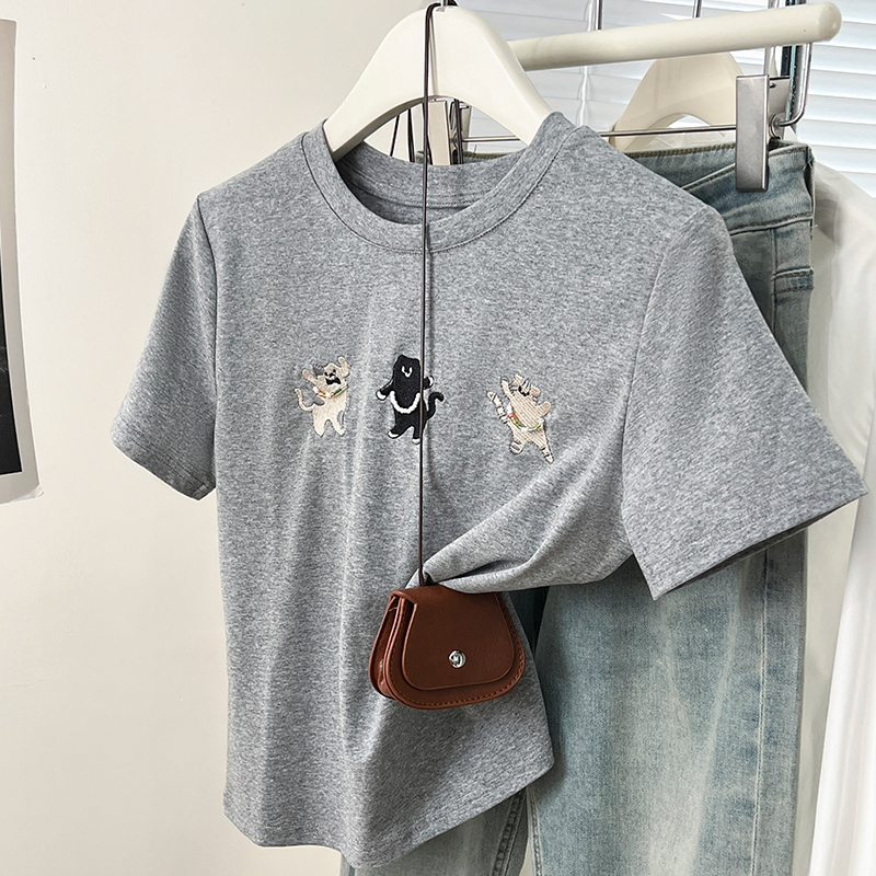 실제 가격 실제 샷 #Grey 만화 고양이 자수 순수면 어깨 짧은 슬리프 티셔츠 여름 티셔츠 느슨한 탑