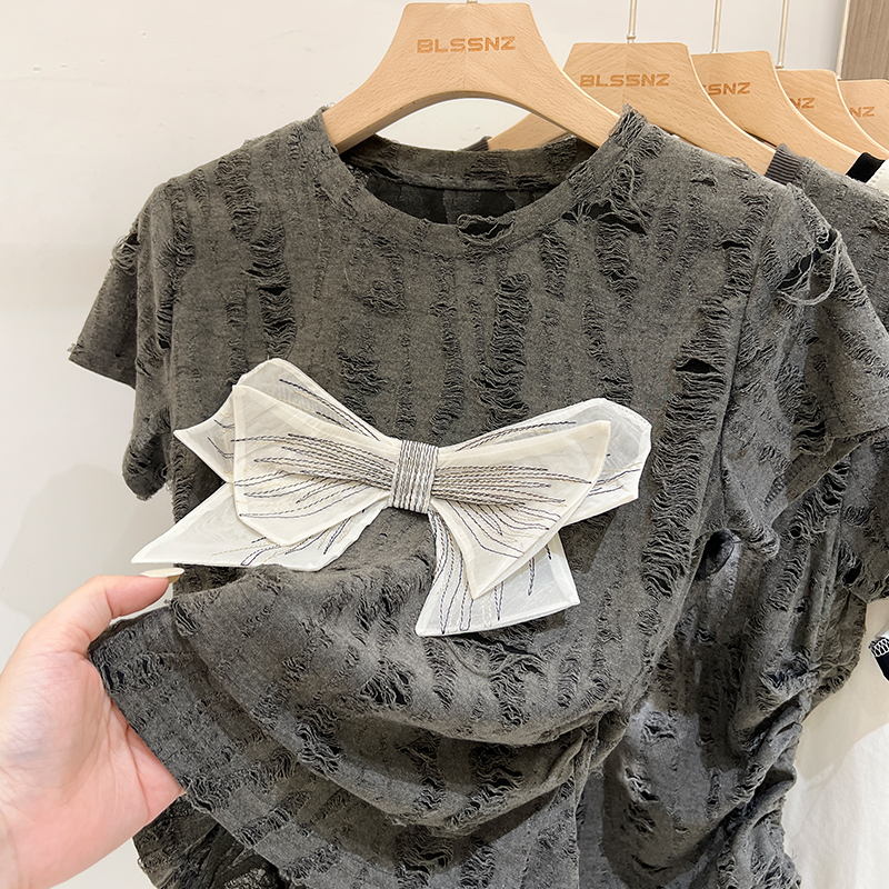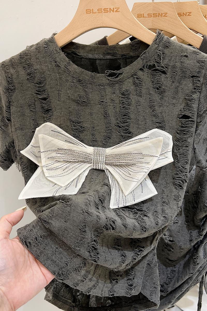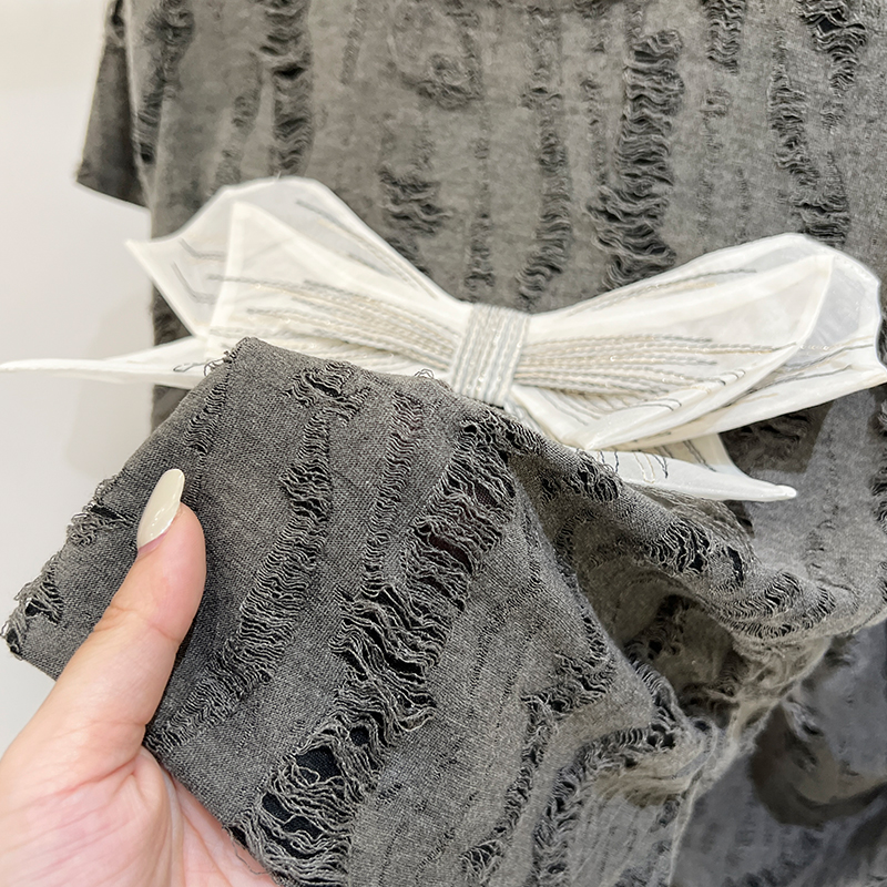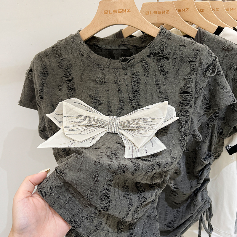 실제 가격 실제 샷 #bow 그레이 프론트 어깨 어깨 짧은 슬리브 티셔츠 여름 미국 레트로 중공 짧은 탑