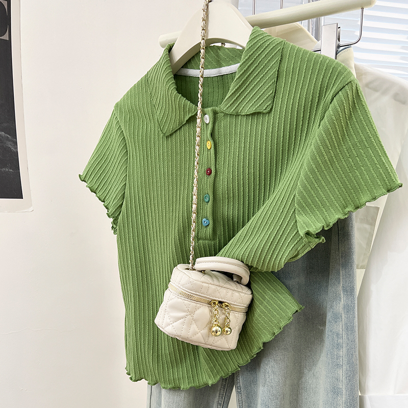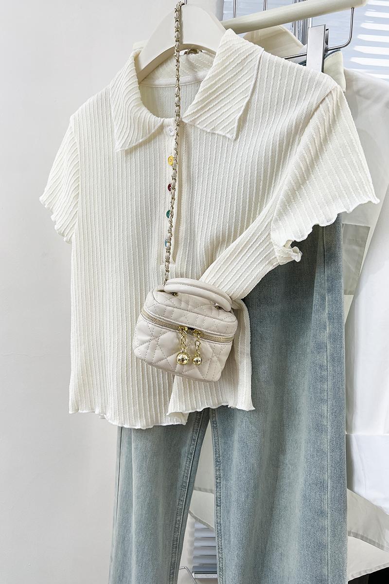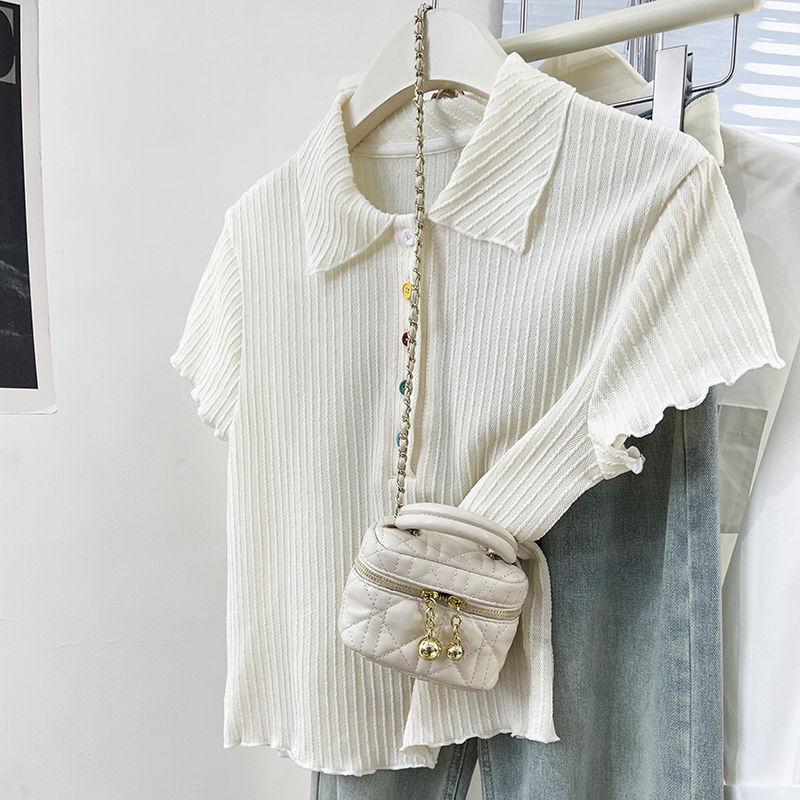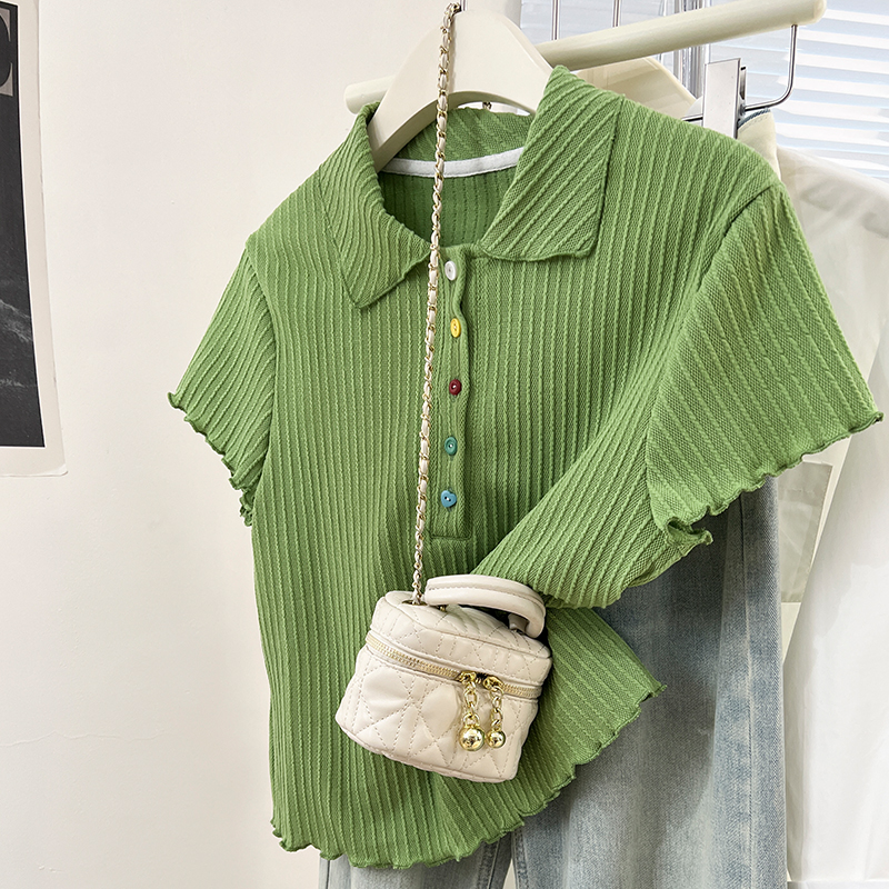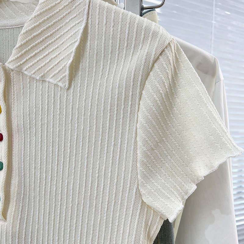 Real-Price Real Shot #Apricot Doll Collar Color Button 여름에 여성을위한 짧은 슬림 스웨터 Slim Short Top