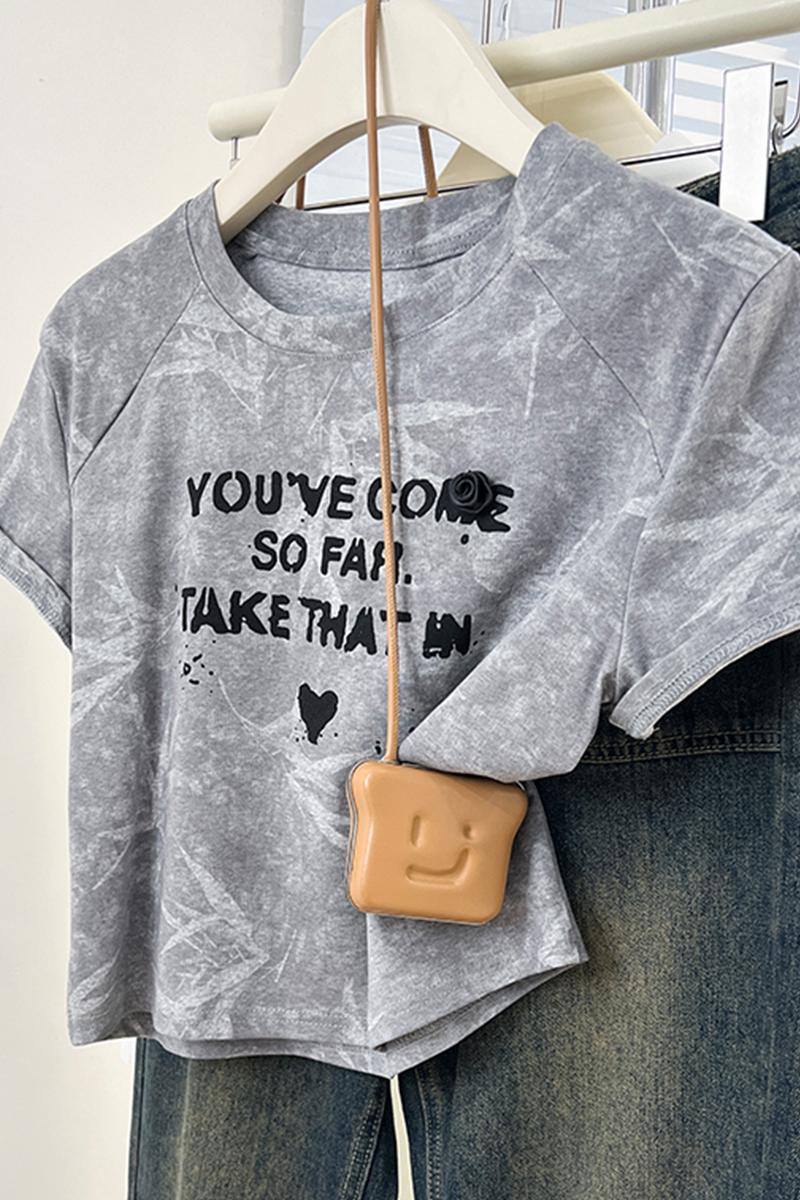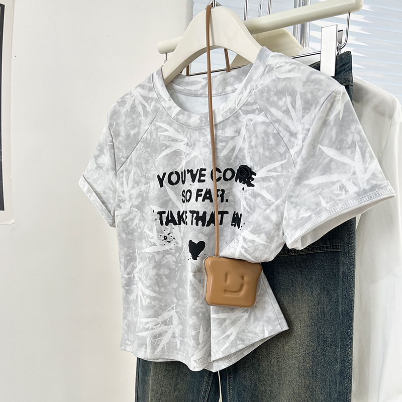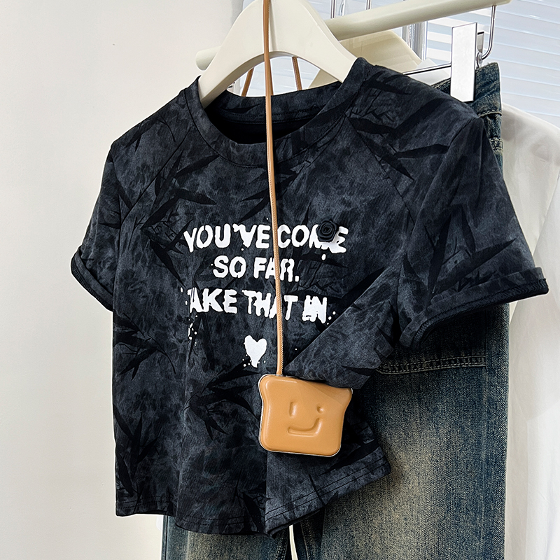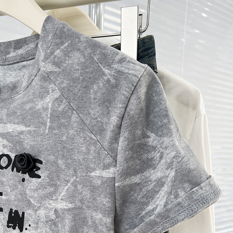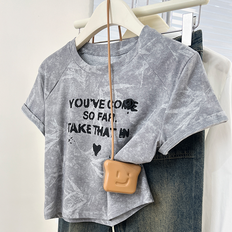 Real-Price Real Shot #American Retro 회색 넥타이 염색 어깨 짧은 슬리프 티셔츠 여름 디자인 틈새 시장에서 여성을위한 THER SHORT TOP