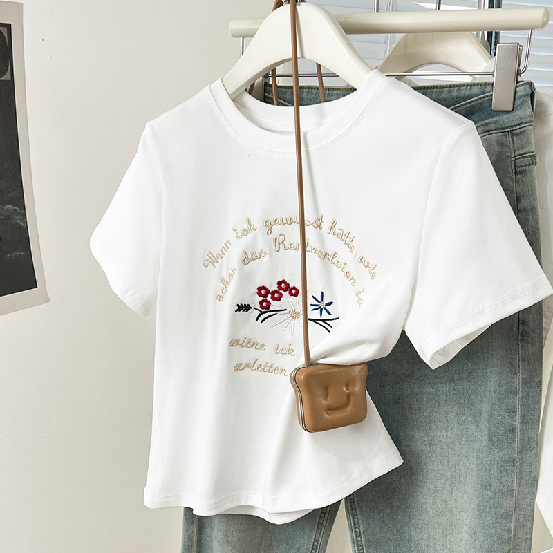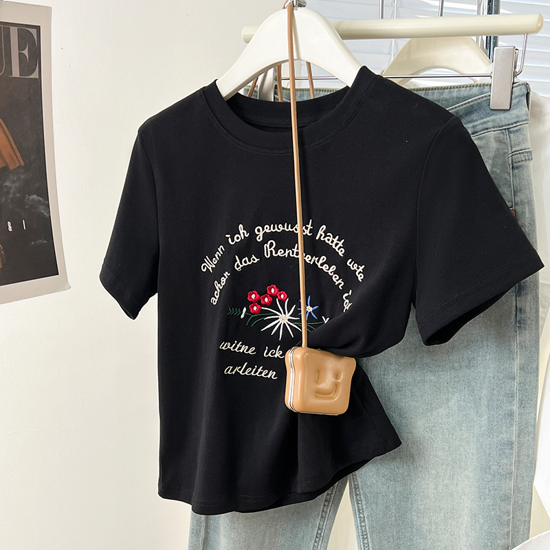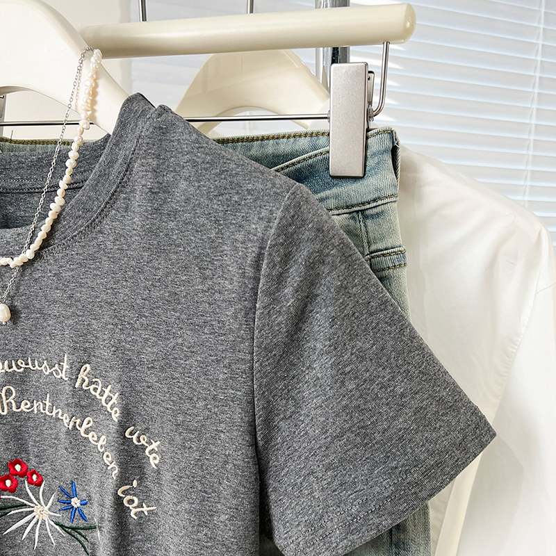 Real-Price Real Shot #Grey Letter Flower 자수 순수면 어깨 짧은 슬림 한 여름에 여성을위한 여름 Slim Short Top