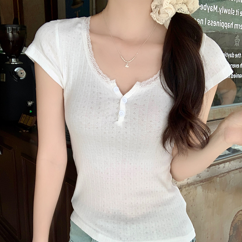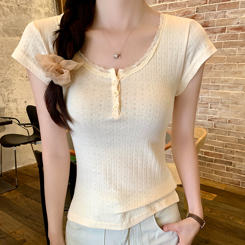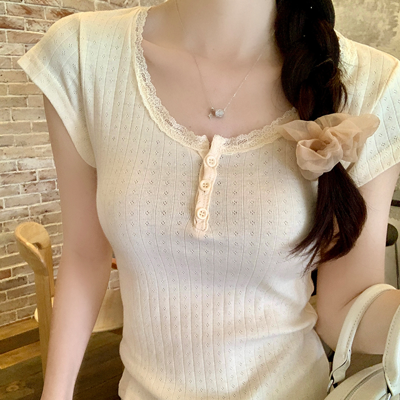 진짜 가격 실제 샷 #Apricot 컬러 레이스 U-넥 스트레이트 어깨 짧은 슬림 한 티셔츠