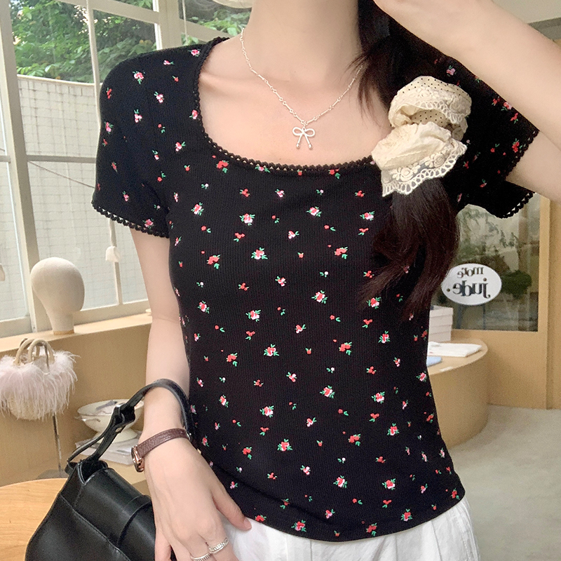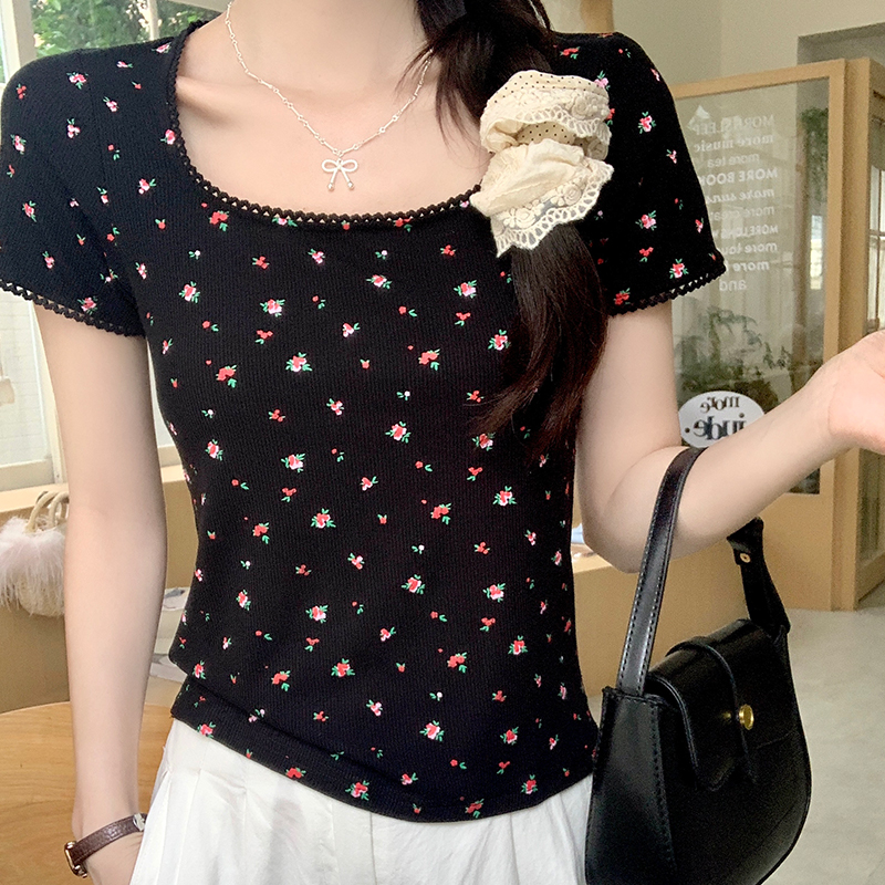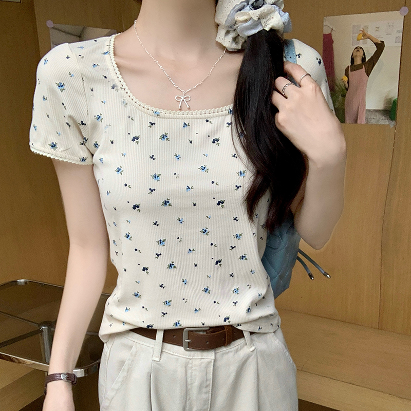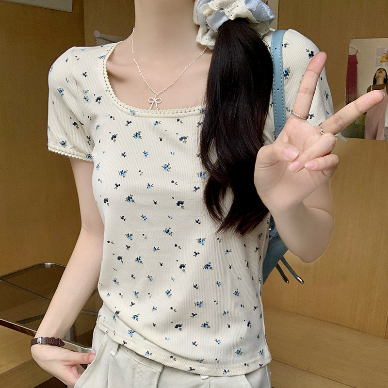 Floral Square Collar 앞쪽 어깨 짧은 슬리브 티셔츠 여름에 여성을위한 작은 짧은 탑 New