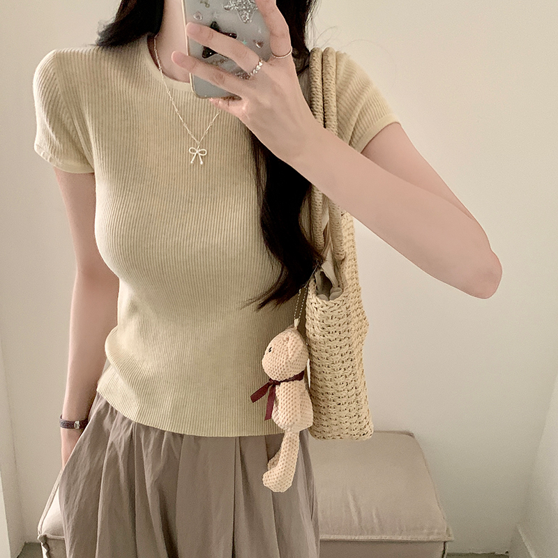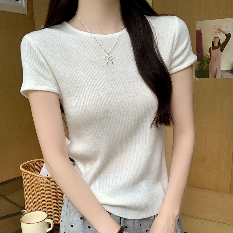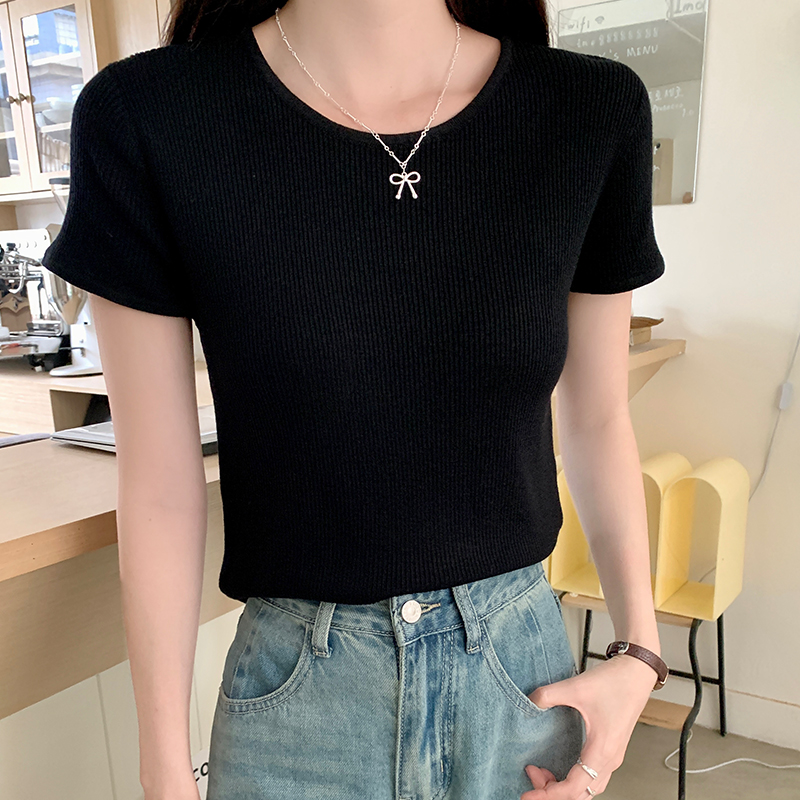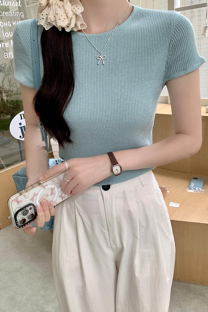 ICE 실크 블루 전면 어깨 둥근 목 니트 짧은 슬리핑 티셔츠 여름 티셔츠 탑 New