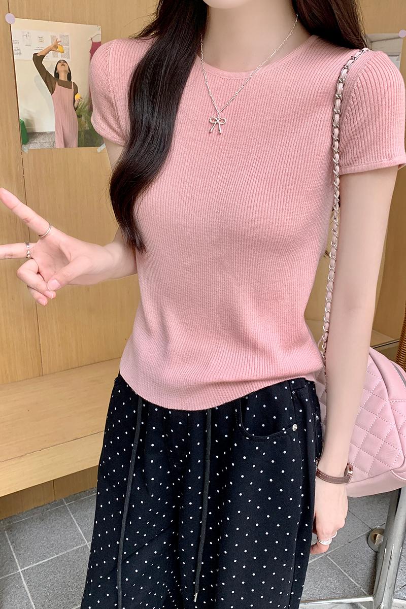 ICE 실크 핑크색 앞쪽 어깨 둥근 목 니트 여름 여름 티셔츠에서 여성을위한 짧은 슬리브 티셔츠 New