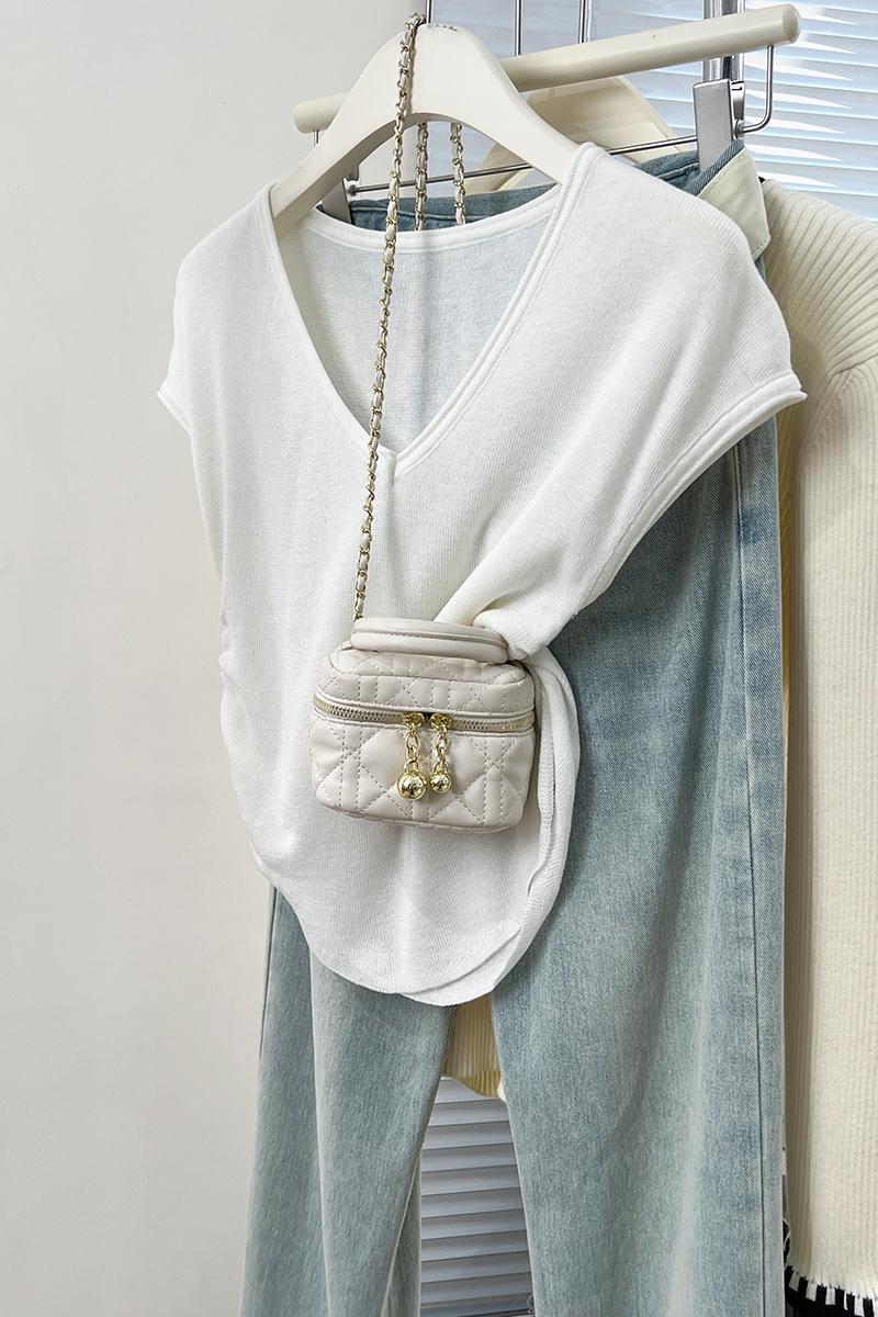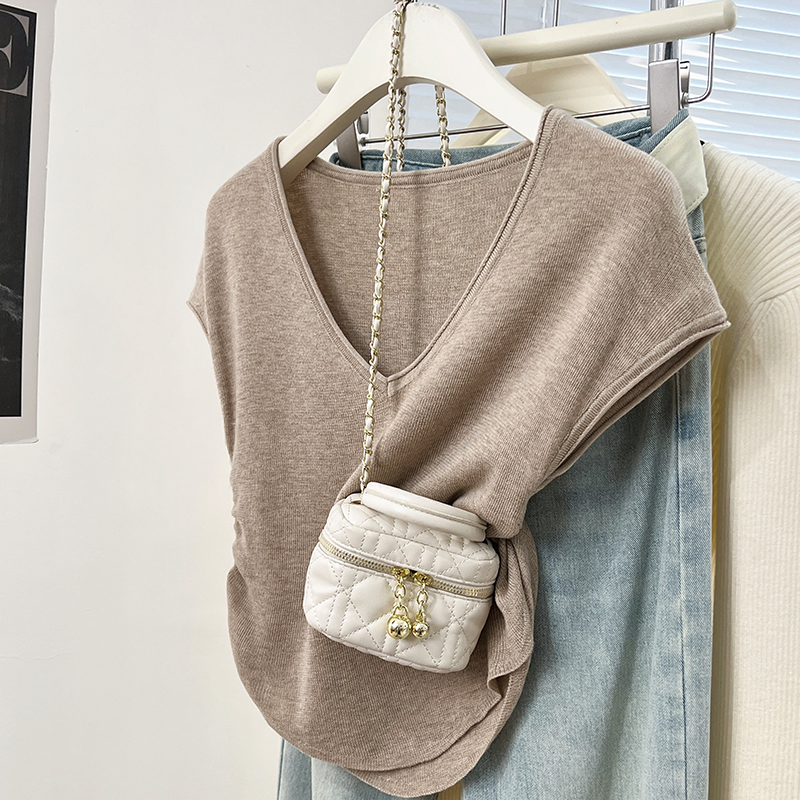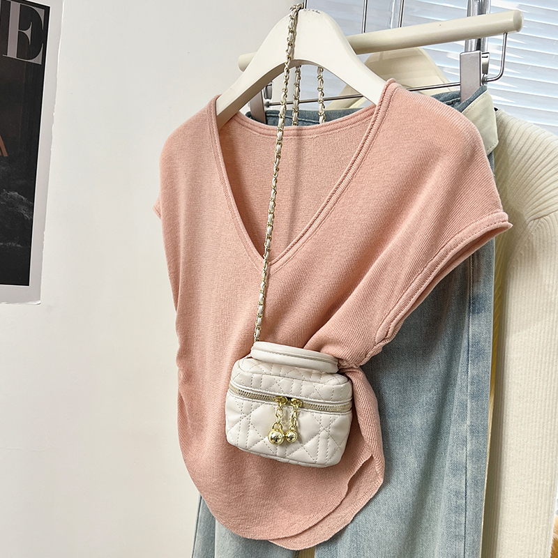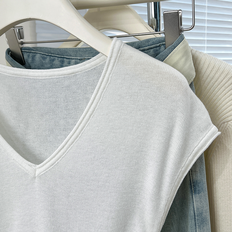 Real Price Real Shot #봄과 여름 민소매 조끼 작은 슬리브 탑의 여성을위한 v-neck 스트레이트 어깨 니트 짧은 슬리브 티셔츠