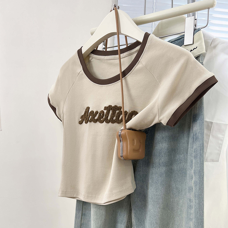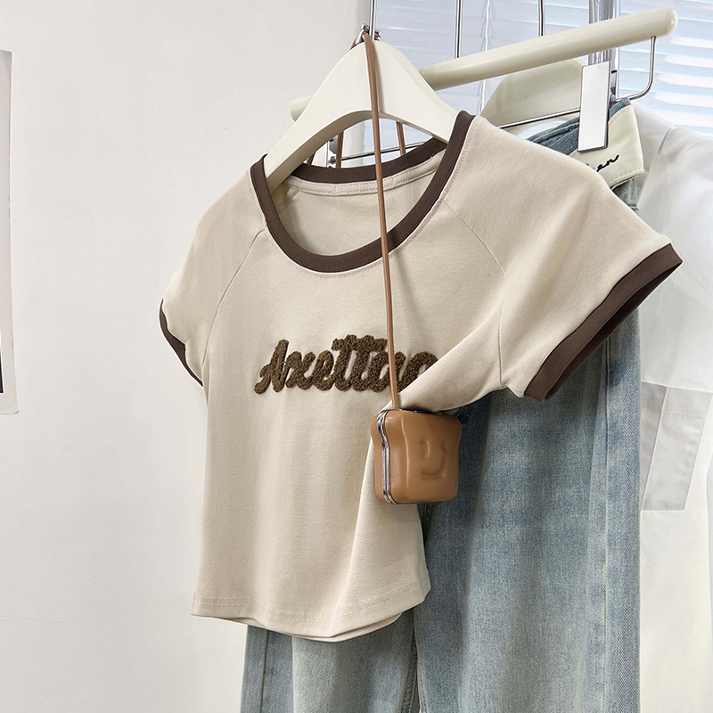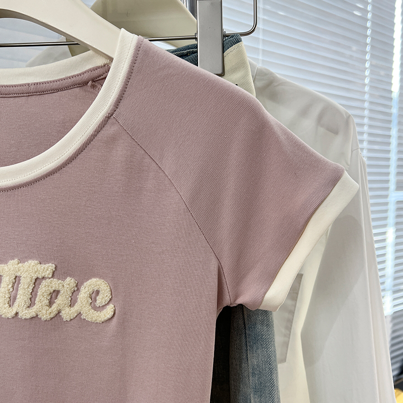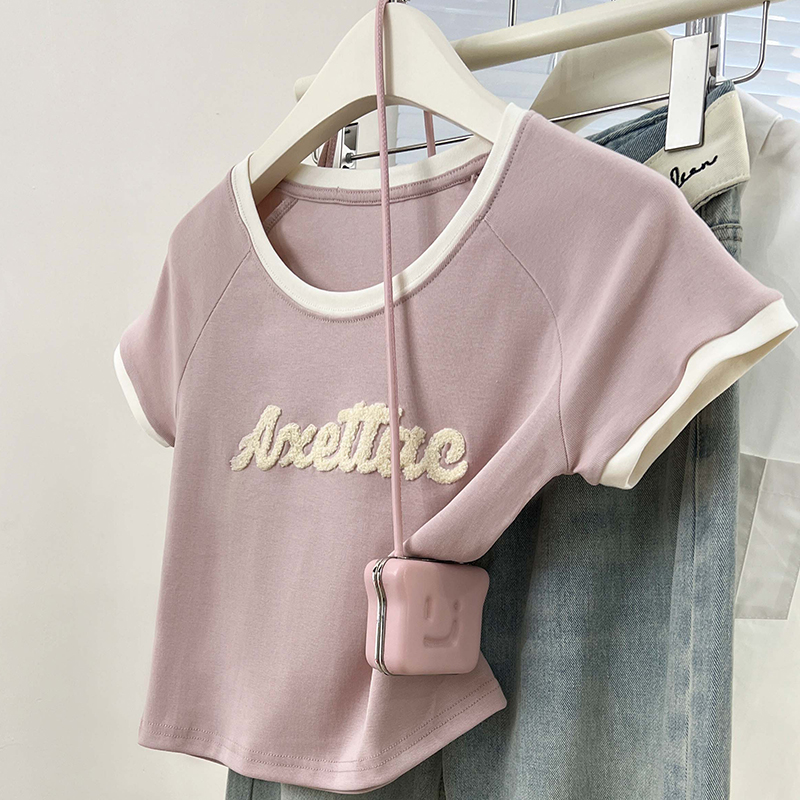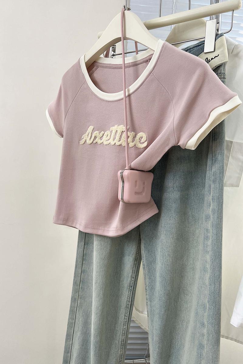 실제 가격 실제 샷 #pink 편지 Jacquard U-Neck Rasp Shoulding Short Sleeve T-Shirm Small Front Should Top에서 여성을위한 여성을위한 티셔츠