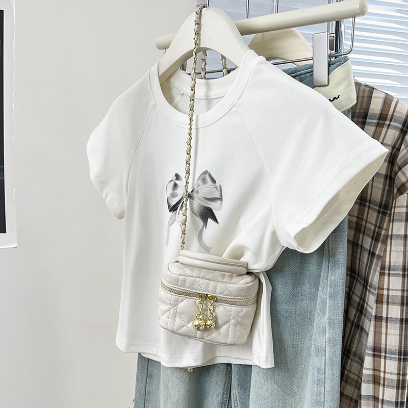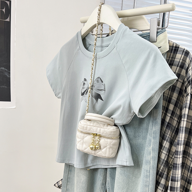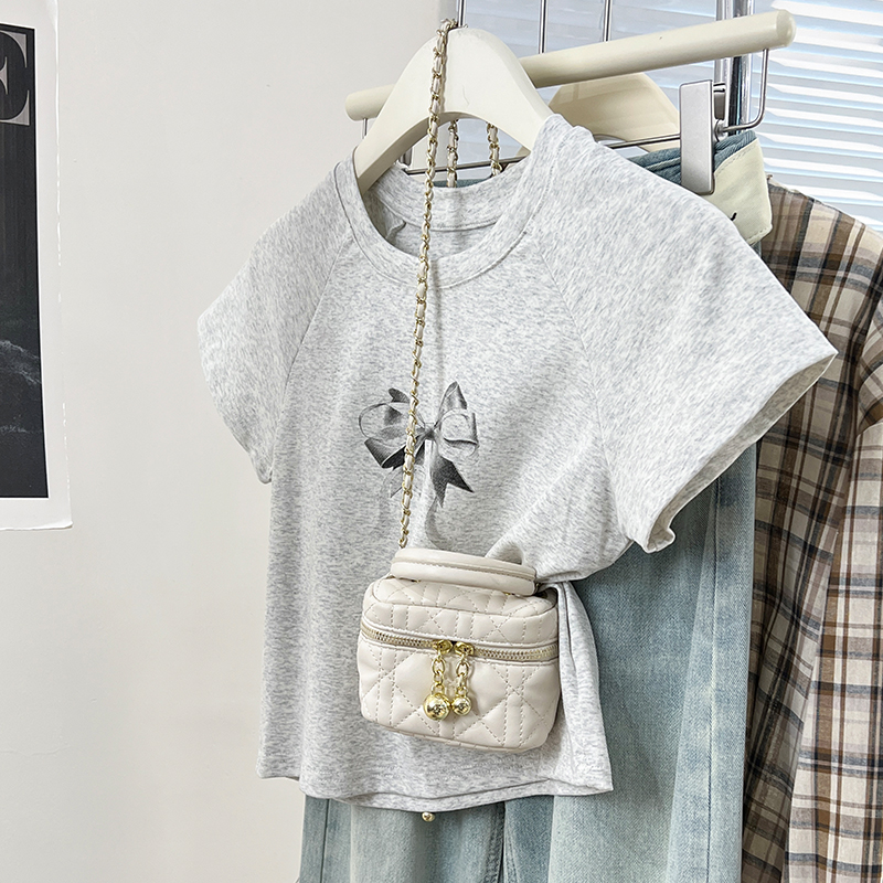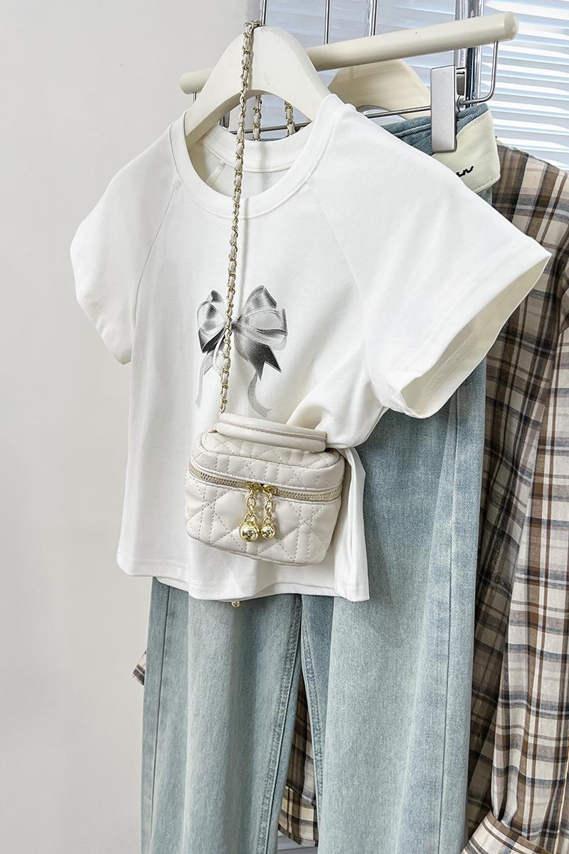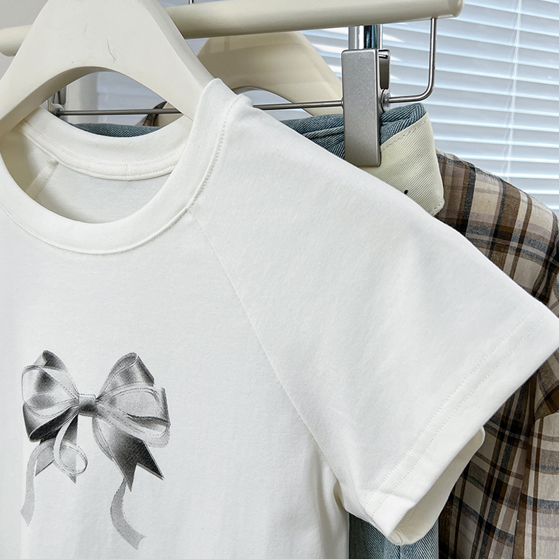 Real-Price Real-Life Shot #American Retro Bow Printed Vanghing Short-Sleeved 티셔츠 여름에 여성을위한 작은 짧은 탑