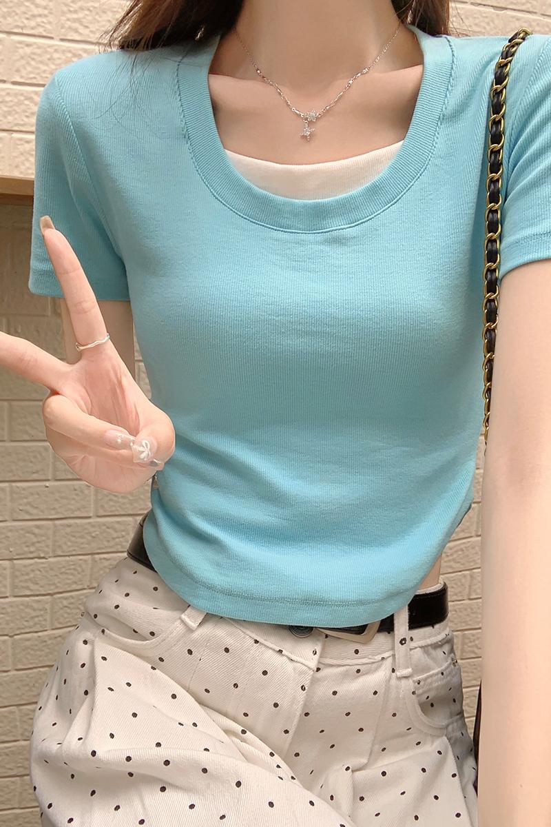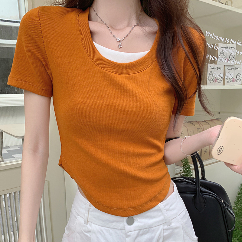 Orange 가짜 2 피스 U-넥 스트레이트 어깨 짧은 슬리프 티셔츠 여름에 여성을위한 New Slim Short Top