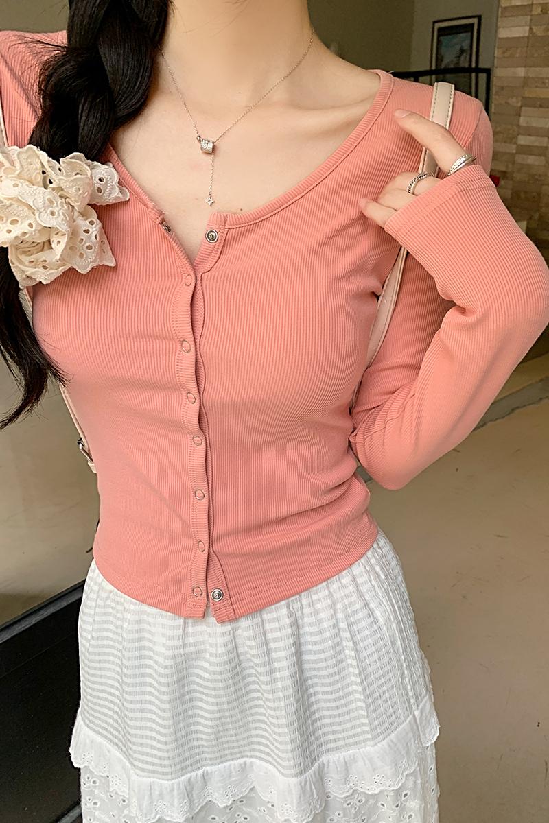 Pink V-Neck Front Shoulder Long-Sleeved T-Spring and Autumn New Base Shirt Undwear Short Top
