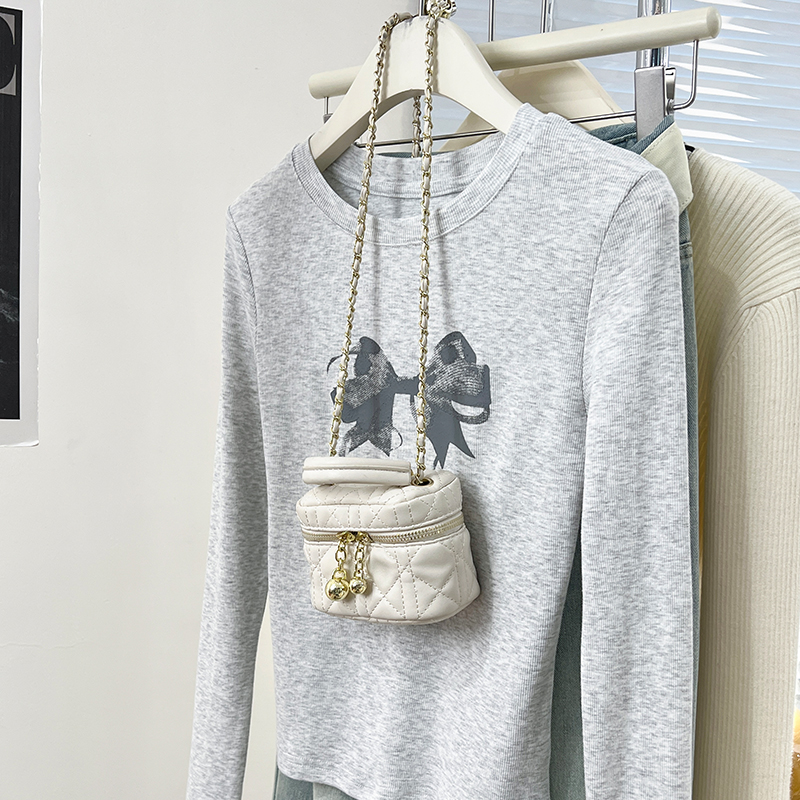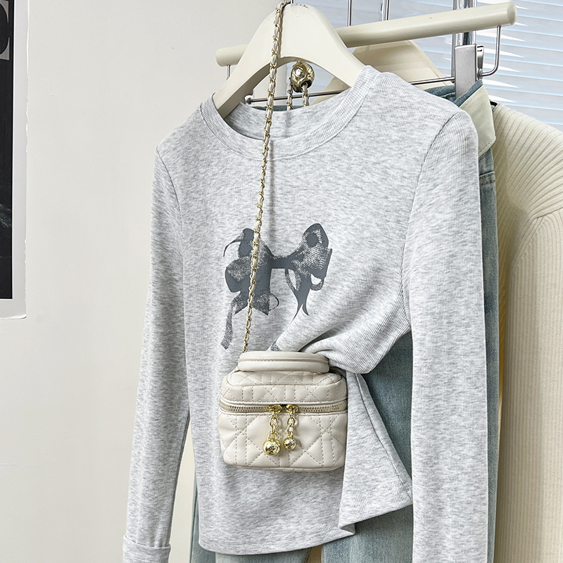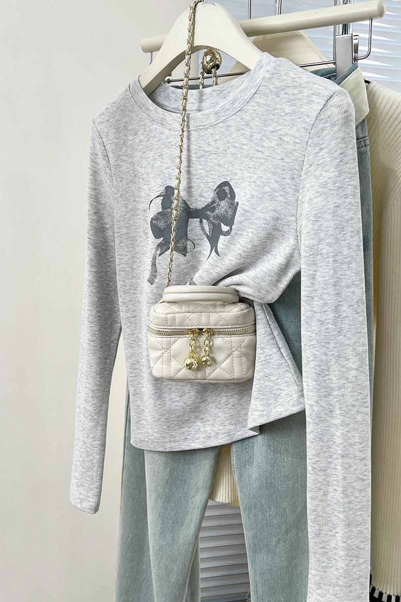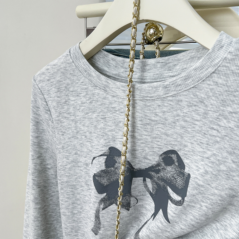 Real-Price Real-Life Photos #American Grey Bow 인쇄 전면 어깨 인쇄 긴팔 티셔츠 여성 봄과 가을베이스 셔츠 속옷 트렌디