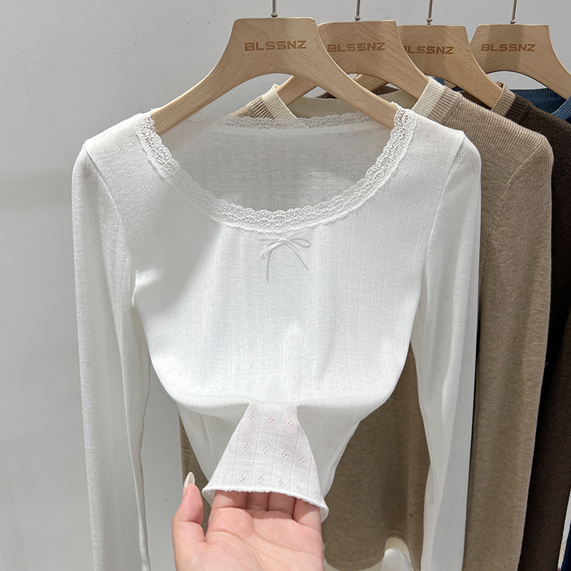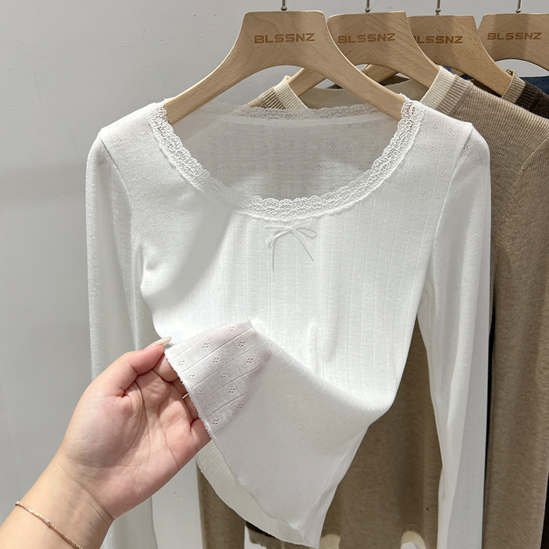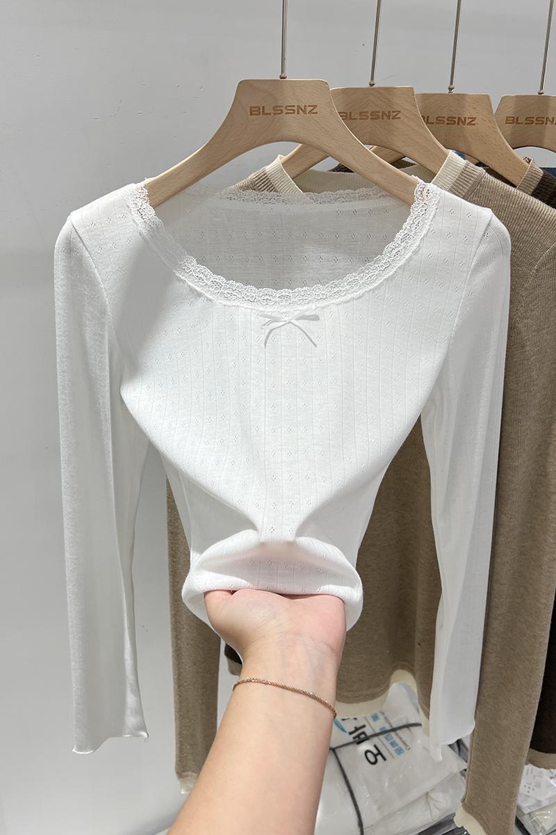 진짜 가격 실제 샷 #화이트 레이스 U 넥 프론트 어깨 롱 슬리브 티셔츠 여자를위한 봄과 가을베이스 셔츠 달콤한 뜨거운 여자 짧은 탑